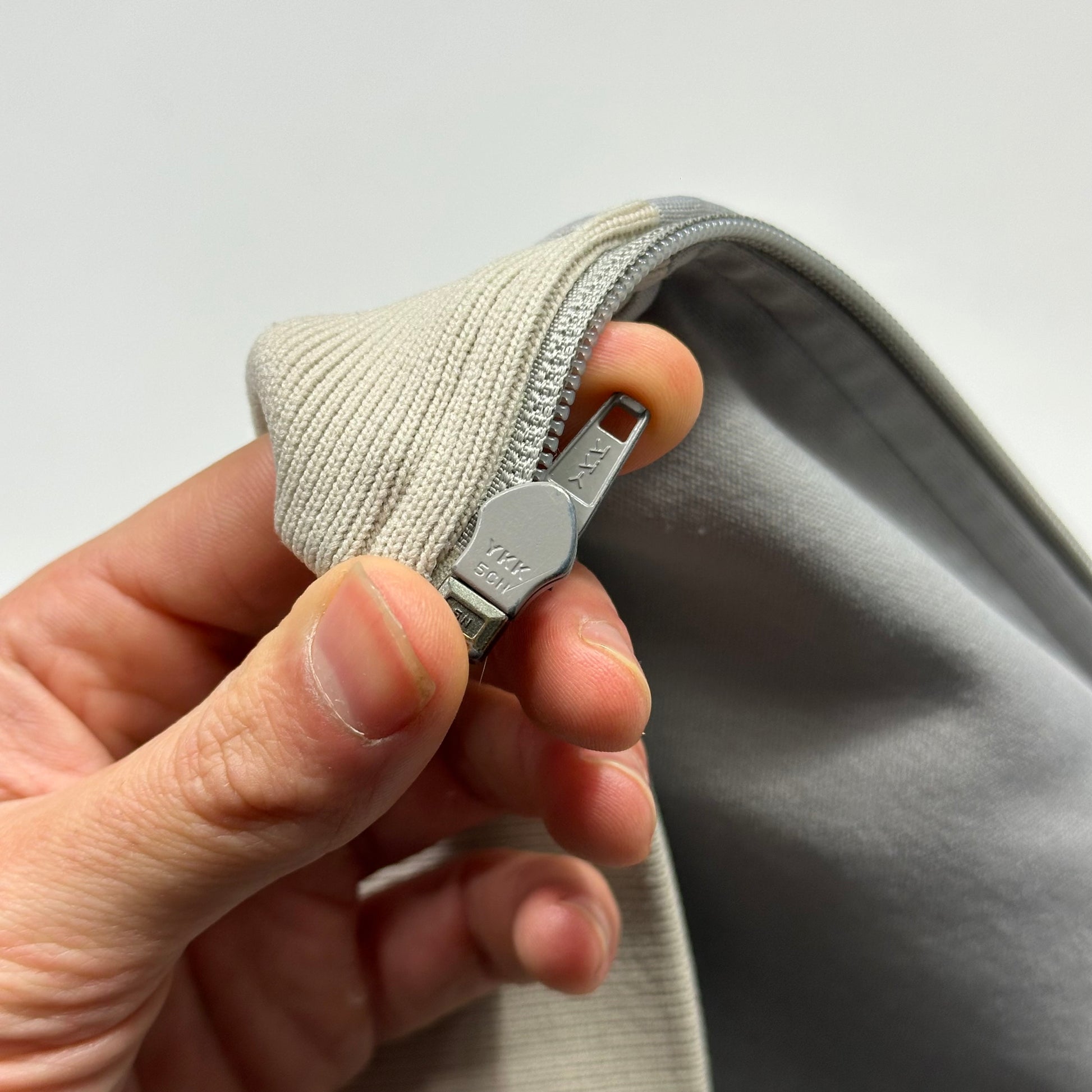 Very rare 2000’s Comme Des Garçons Comme Comme line polyester bomber boxy track jacket, beautiful blue grey body with cream arms and pockets, black piped detailing, embroidered CDG CDG logo to chest.