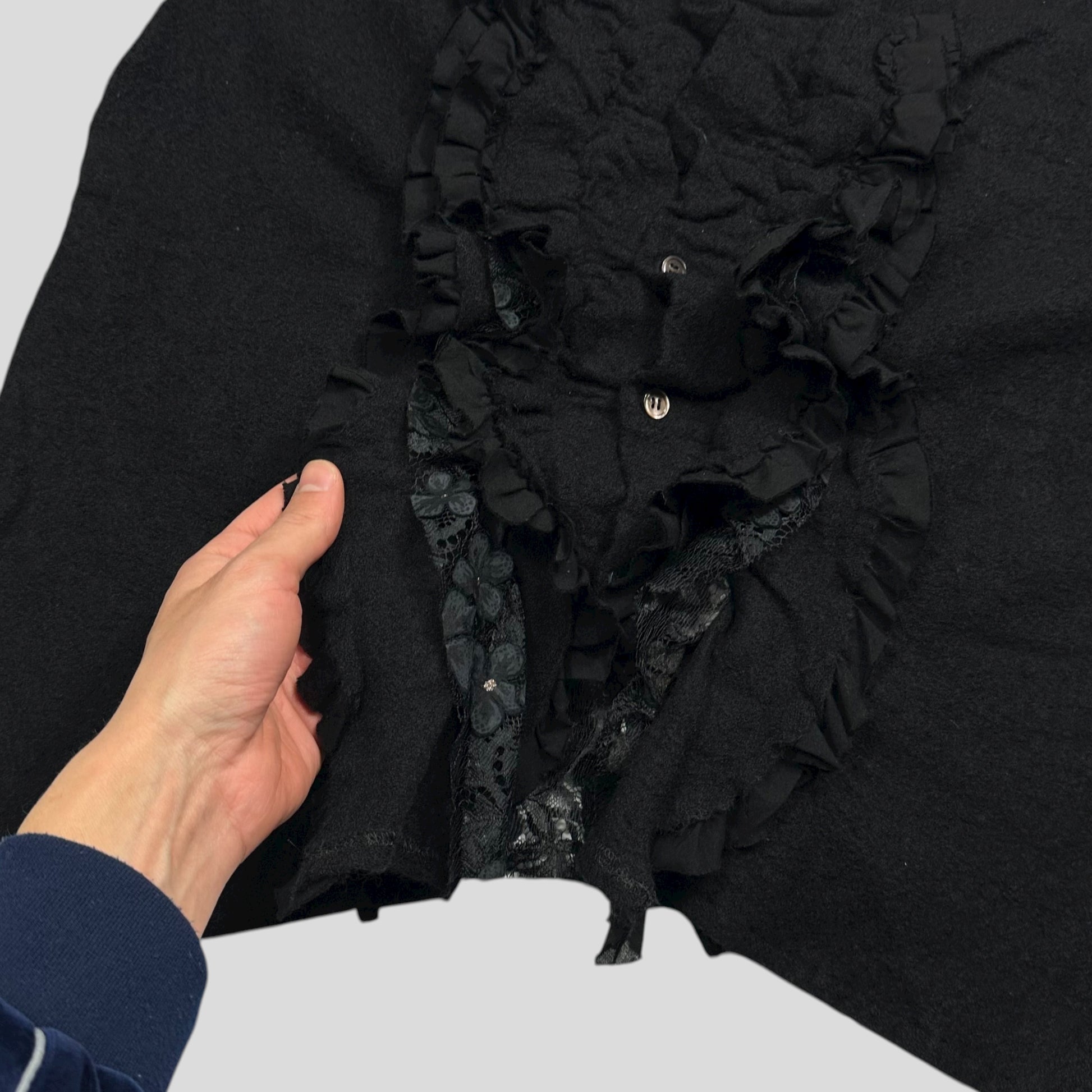 Rare and unique 2000’s CDG Tricot black gothic style panelled top with wool front and a transparent sheer floral mesh back and arms, layered ruffled detailing on the front.