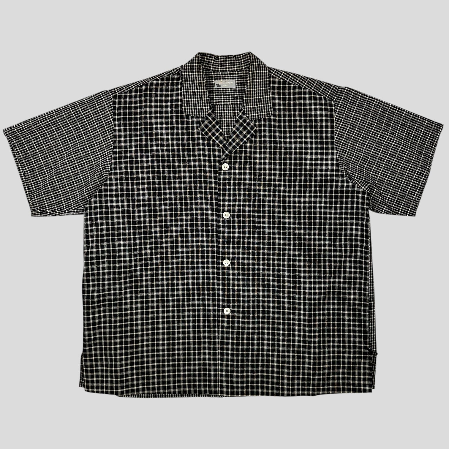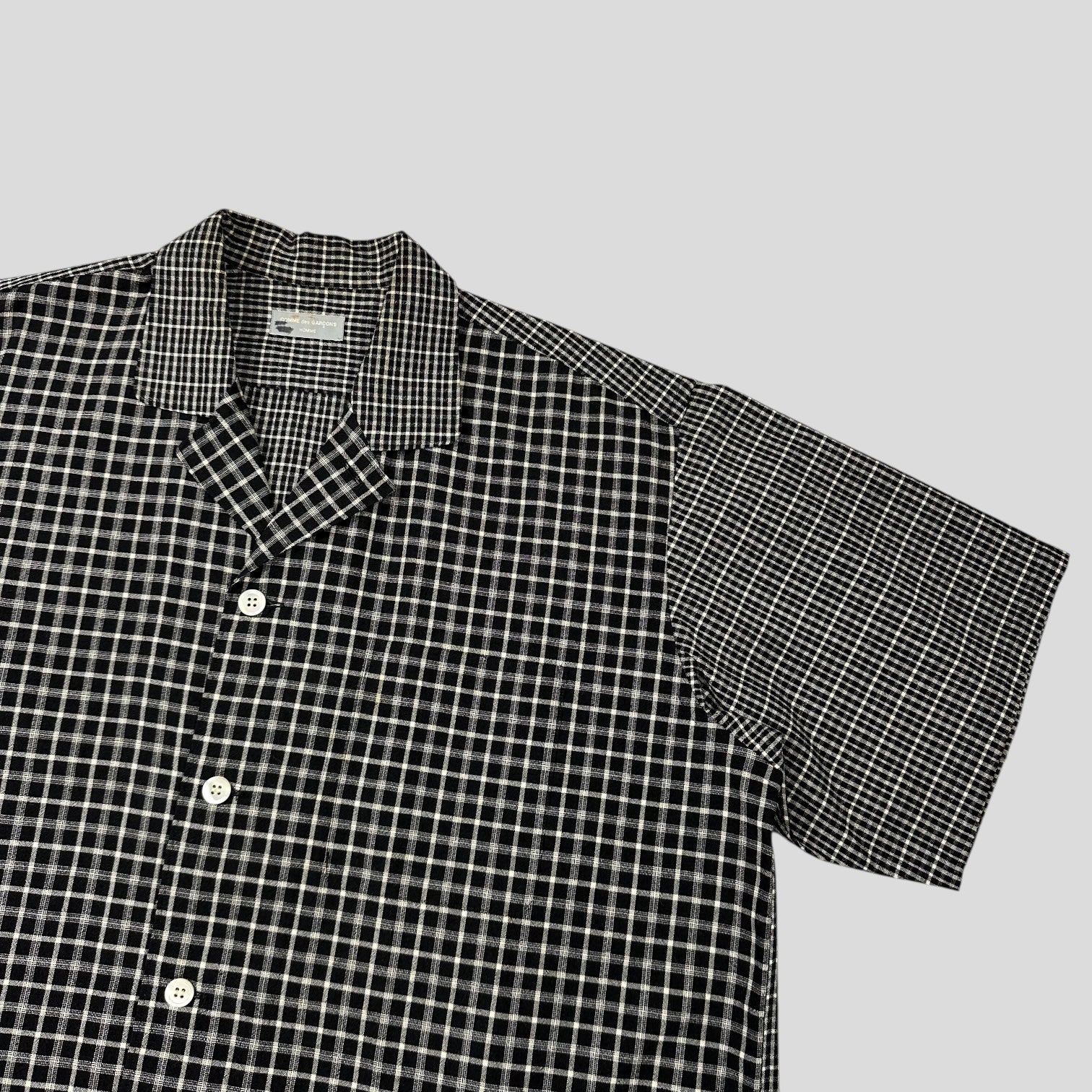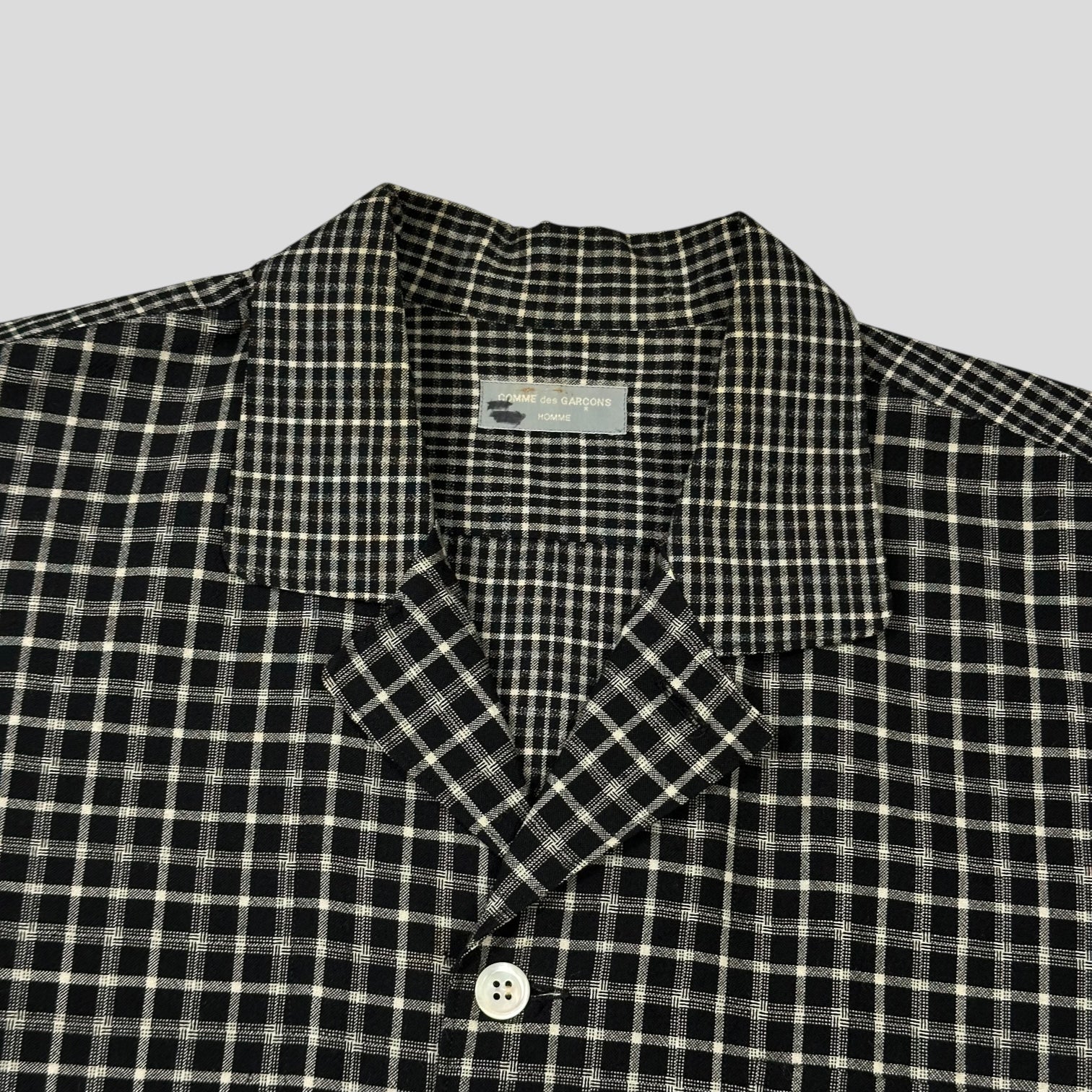 CDG Homme late 90’s Black and Grey plaid boxy heavyweight wool shirt with alternating plaid checkers on the sleeves and collar, beautiful piece in a straight hem camp collar cuban style, twin pleat on the back.
