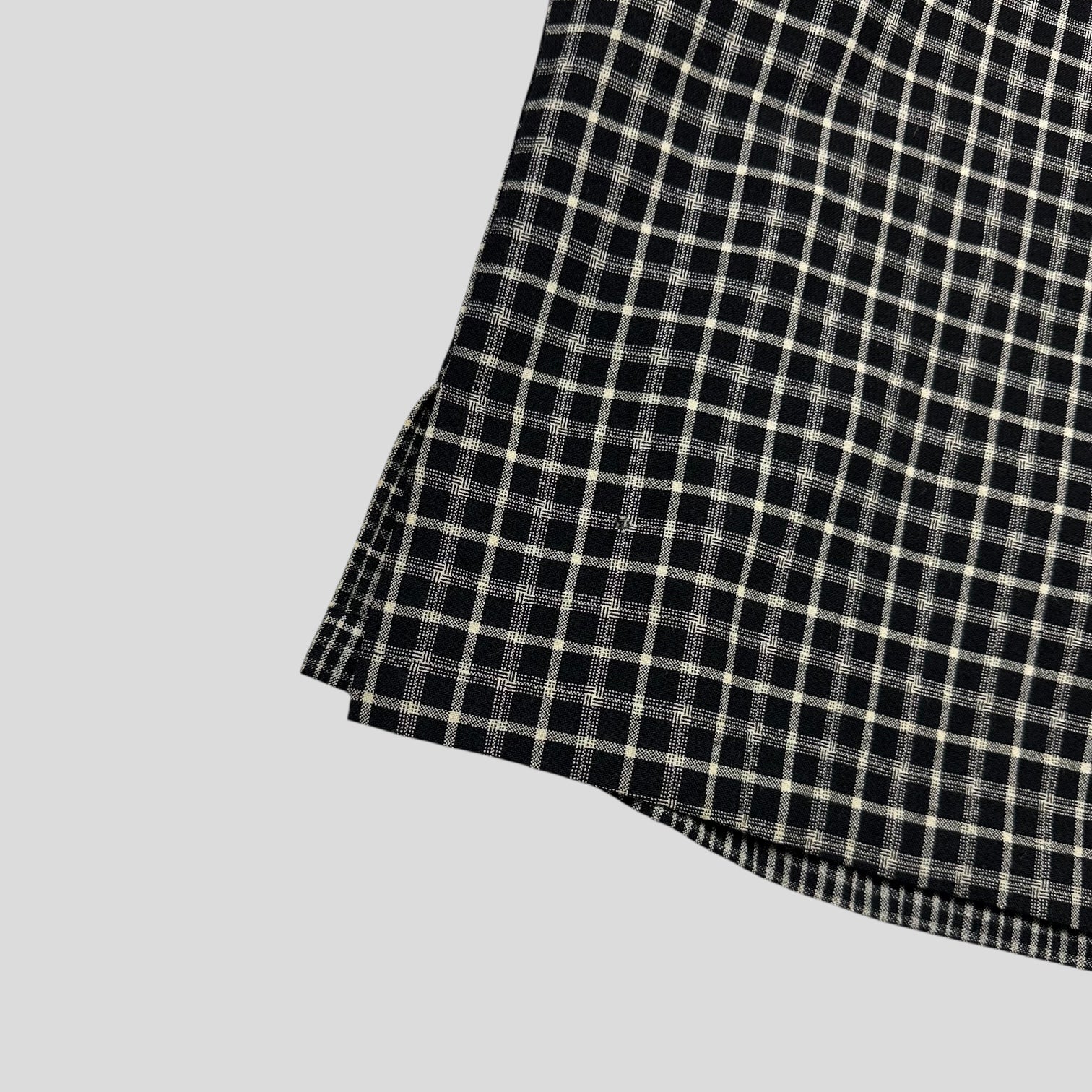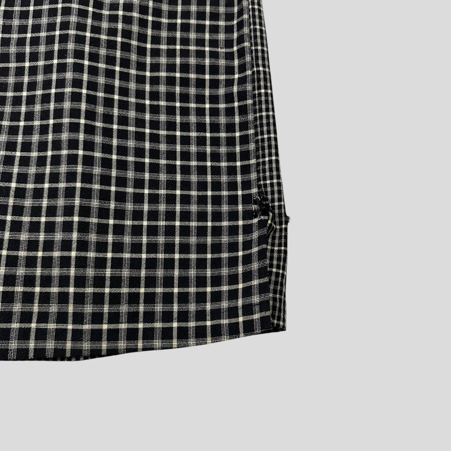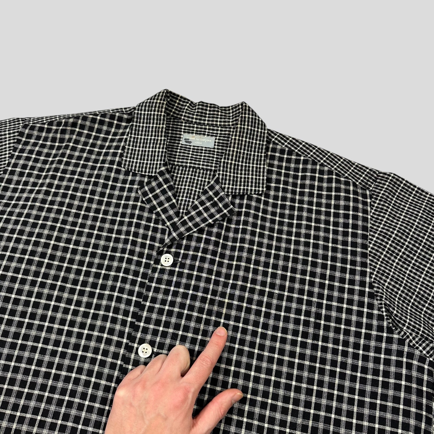 CDG Homme late 90’s Black and Grey plaid boxy heavyweight wool shirt with alternating plaid checkers on the sleeves and collar, beautiful piece in a straight hem camp collar cuban style, twin pleat on the back.