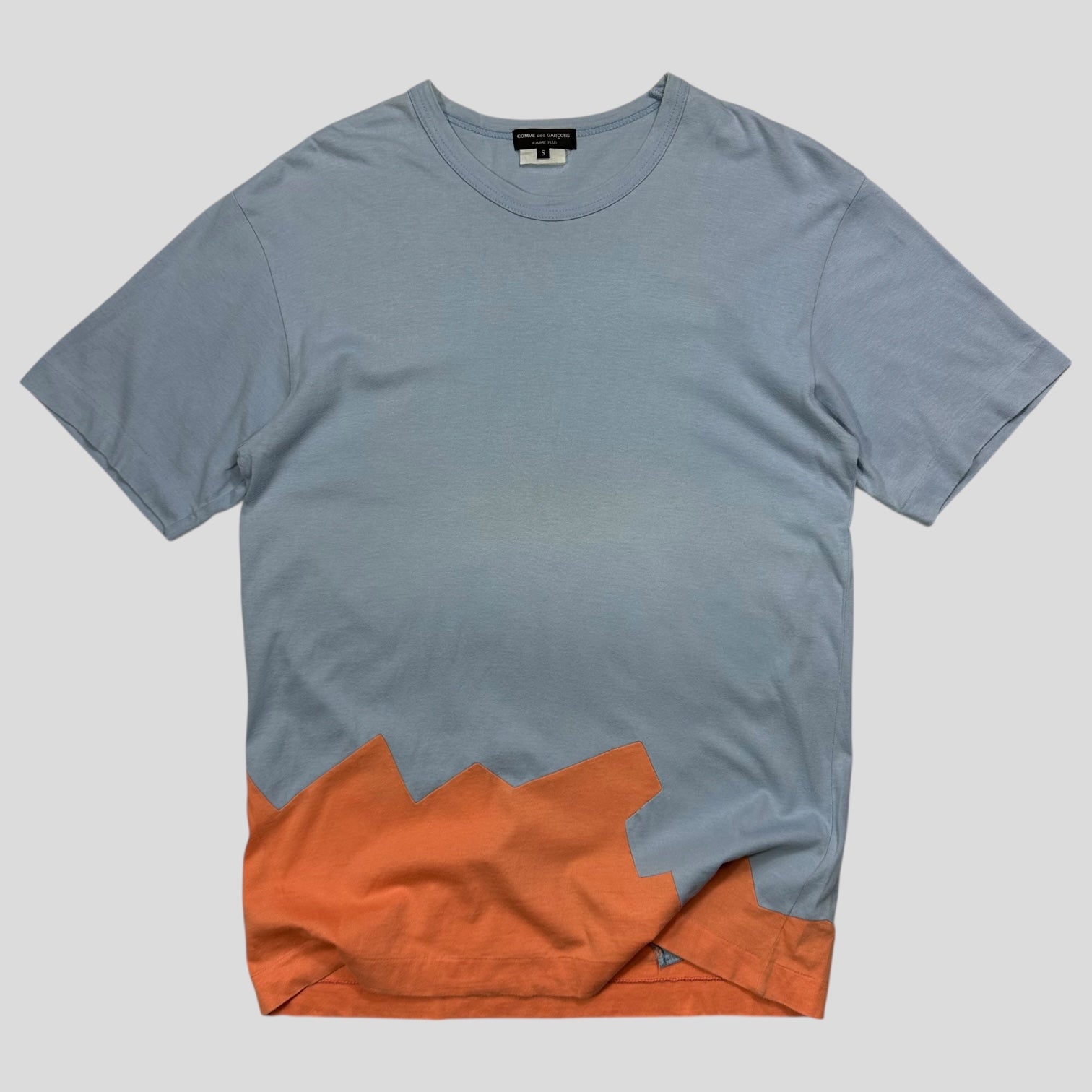 Great piece from Homme Plus 2015, baby blue and orange reconstructed tee with zig zag pattern partition.