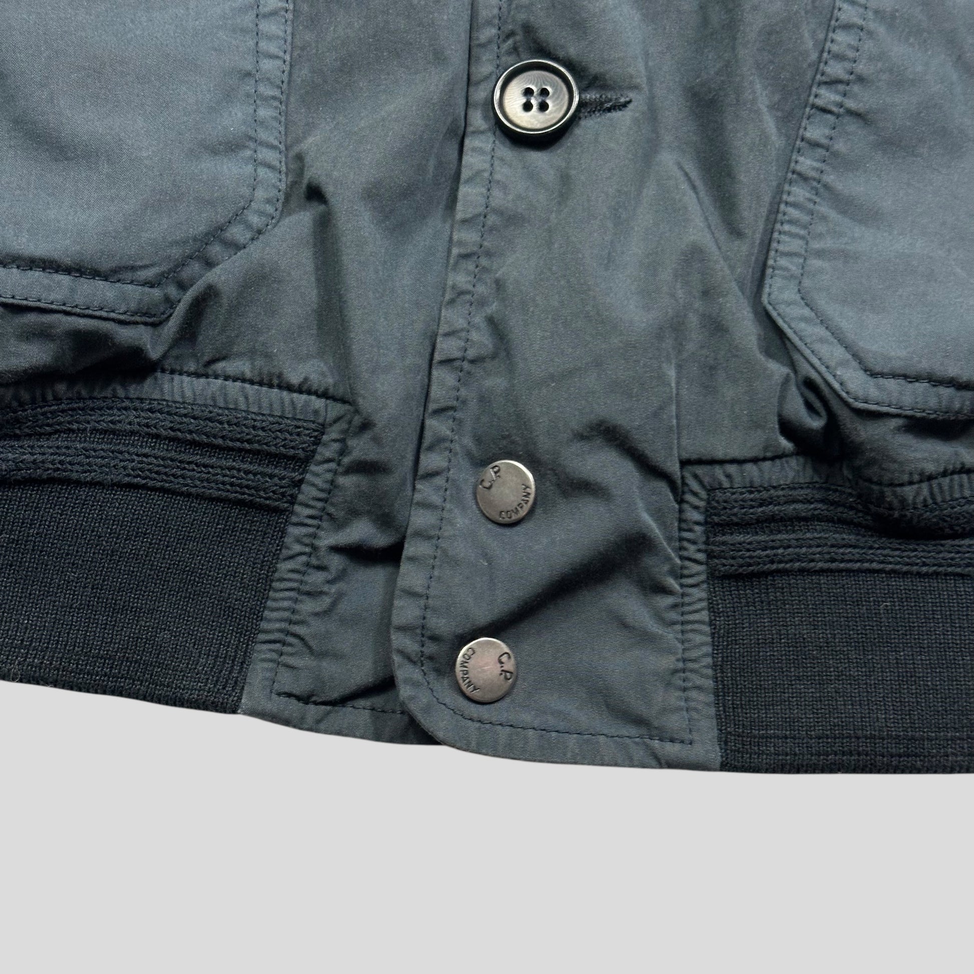 Beautiful spring summer 2006 cp company cotton nylon mixed lightweight bomber jacket, unique material that is slightly iridescent changing from shades of grey to blue in certain lighting, black mesh lining, CP Company branded metal buttons at bottom, cotton cuff, hem and collar.