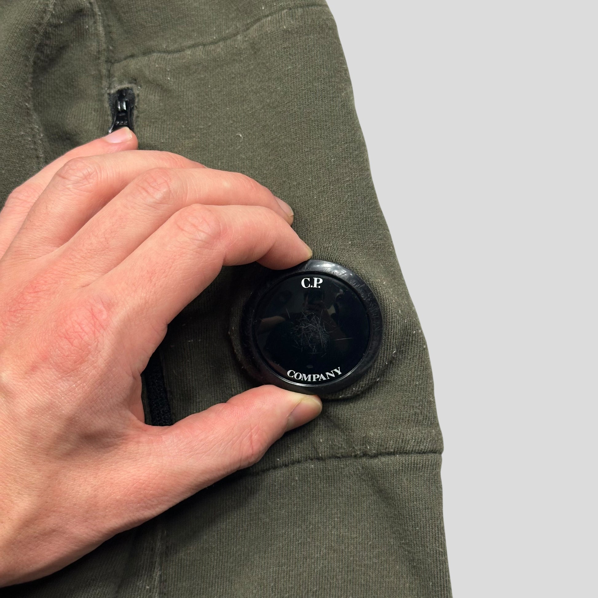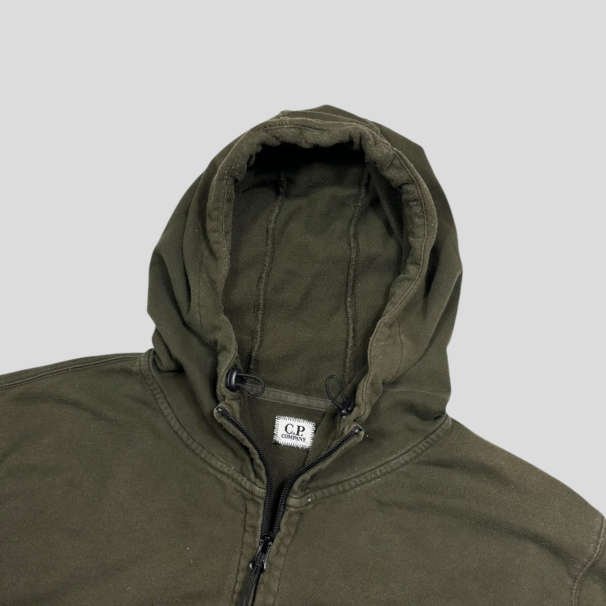 CP Company 2000’s Khaki Green cotton zip-up hoodie, lens goggle to arm pocket, huge zip pockets to front, adjustable toggles on hood.