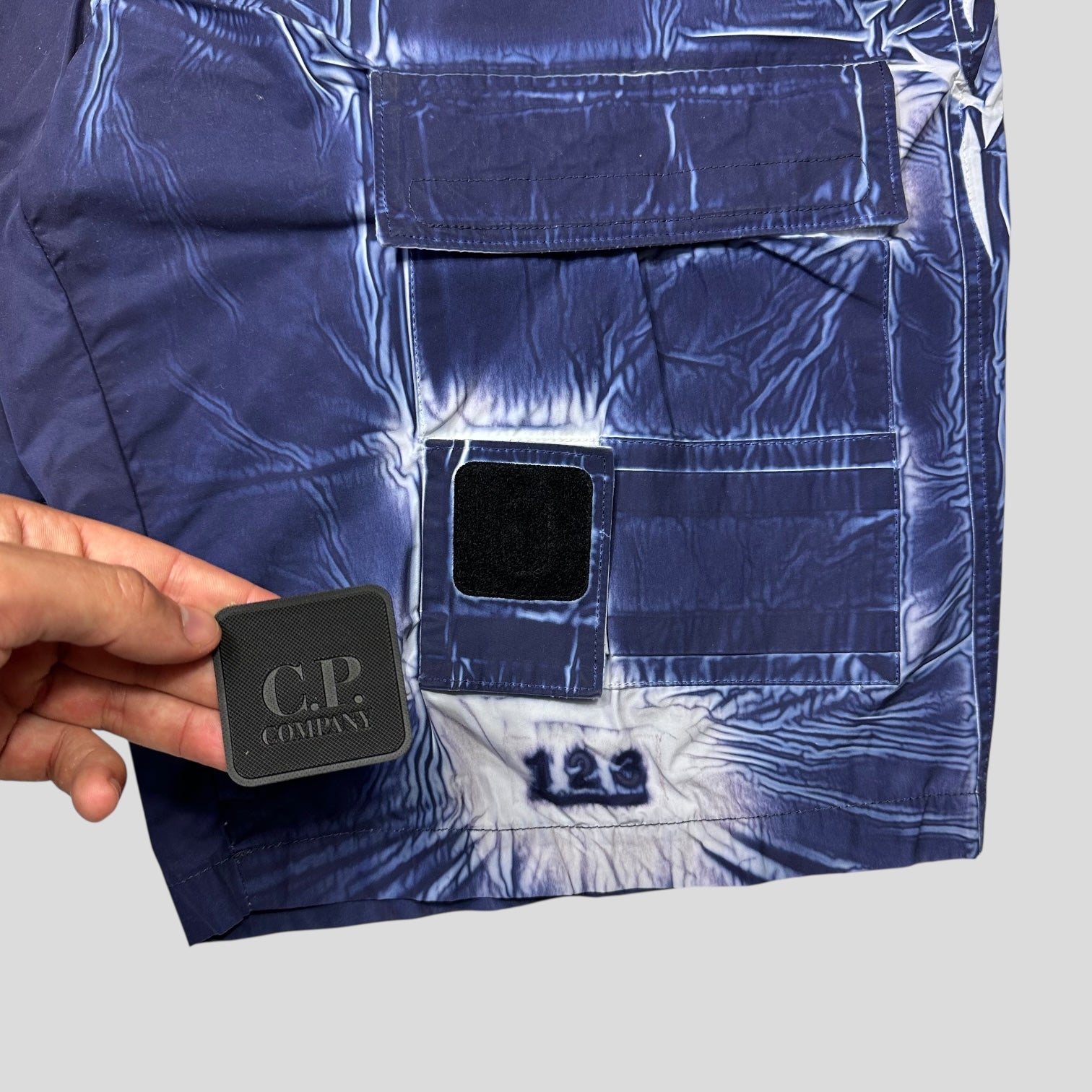 Very rare CP Company spring summer 2021 Metropolis series Bermuda cargo shorts, blue colourway with unique tracery pattern, tough nylon construction, removable CP Company black velcro patch.