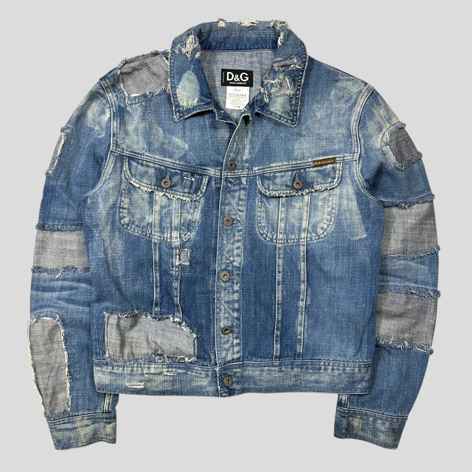 Rare Dolce & Gabbana Autumn Winter 2004 blue reconstructed panelled distressed denim jacket, leather logo tab to chest and lower back, metal branded buttons, Made in Italy.