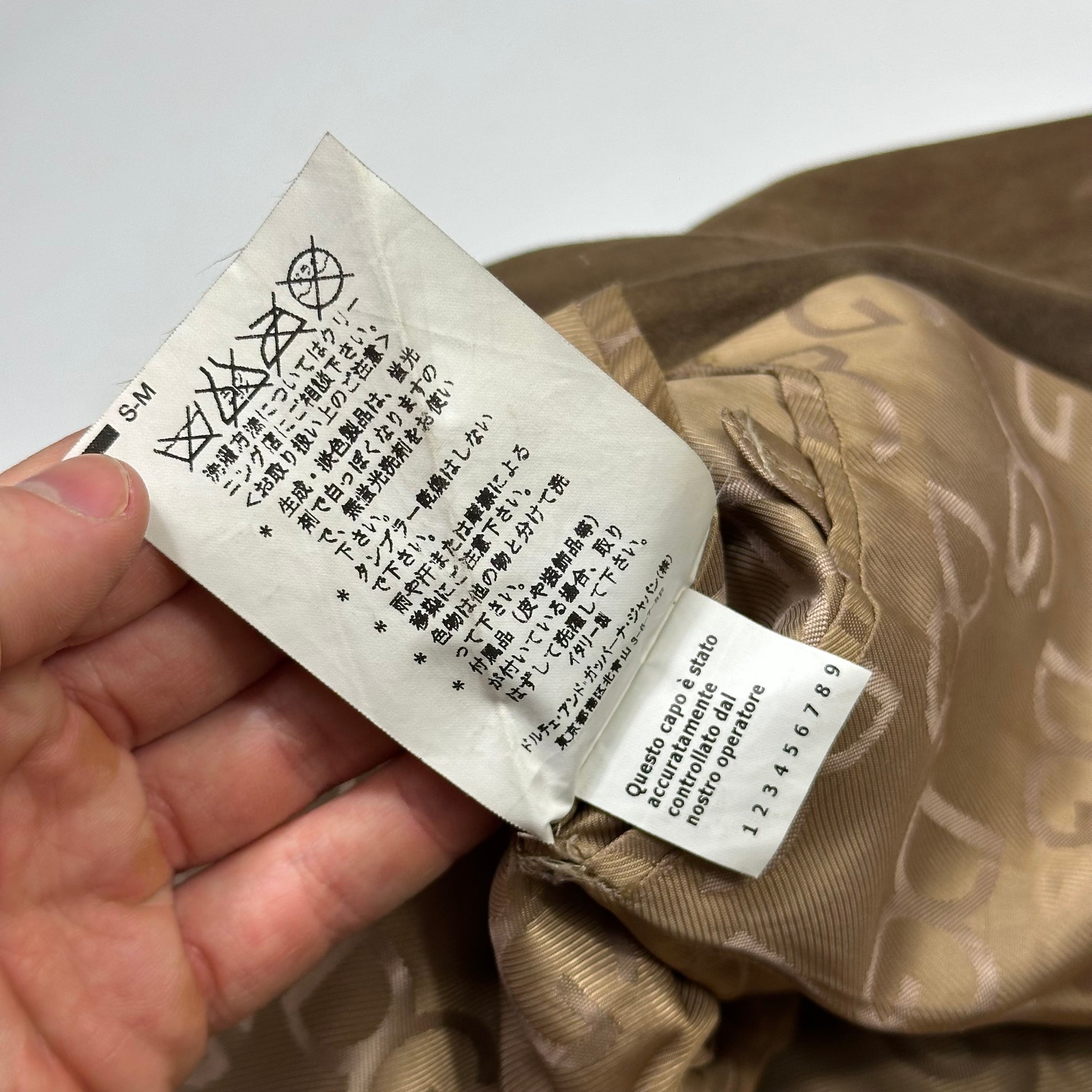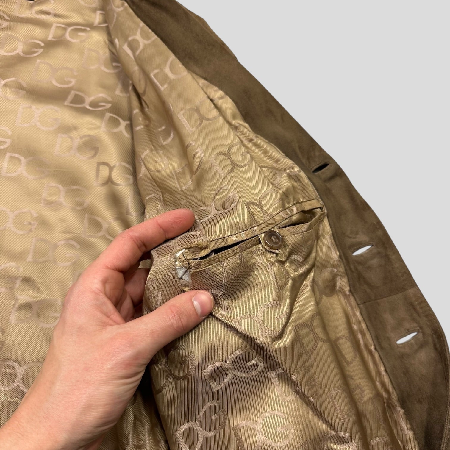 Beautiful early 2000’s Dolce & Gabanna mainline leather tan brown suede open collar trucker work jacket, very unique style that’s reminiscent of a blazer and work jacket, 70’s style, cowboy western influence.