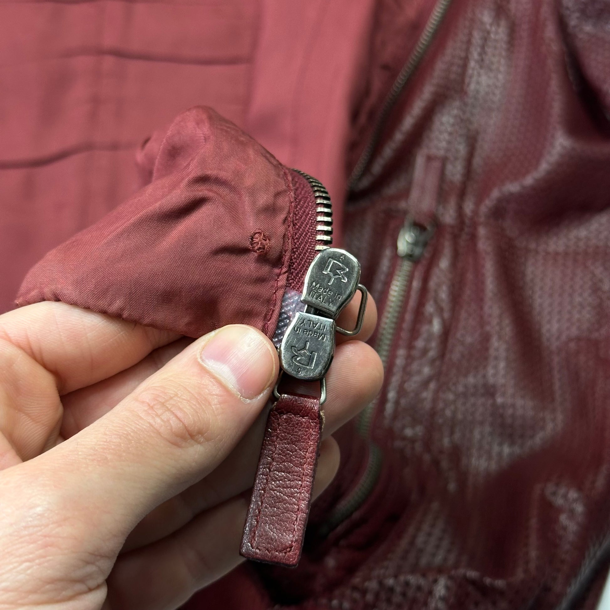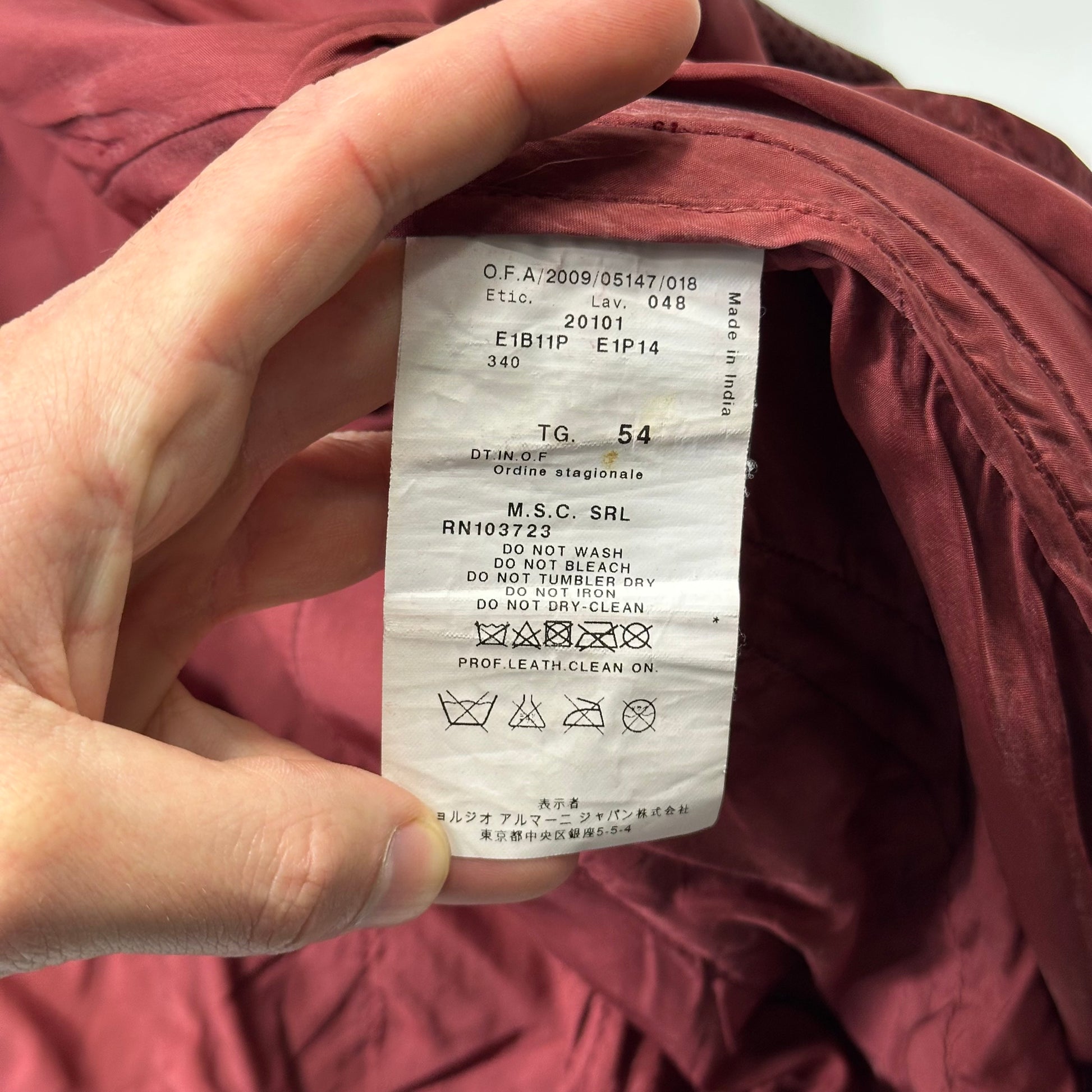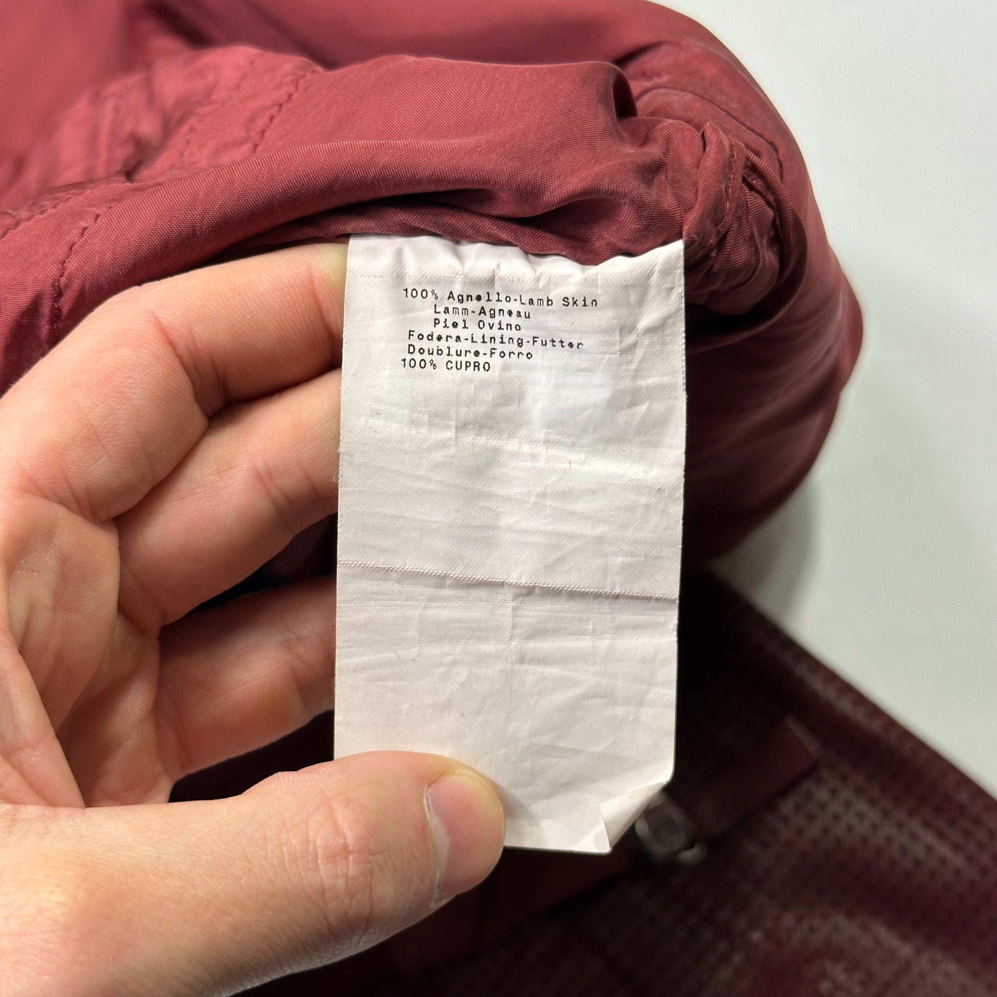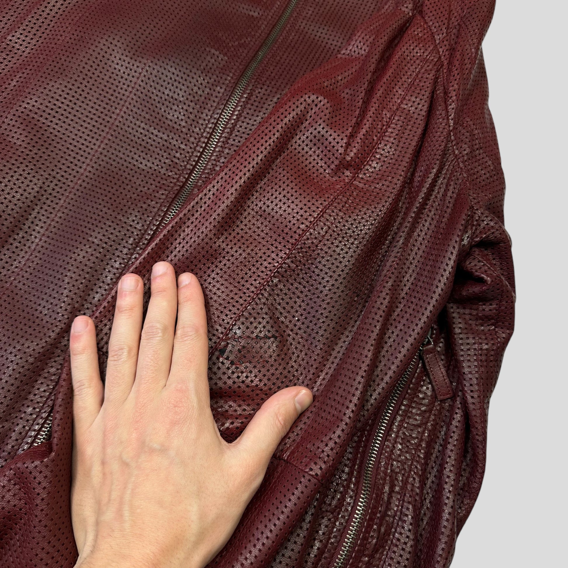 Rare 2009 Emporio Armani burgundy red moto bomber jacket, soft Lambskin leather, chunky made in Italy zips on front and wrists, moto biker style, lovely all over textured perforation that makes the jacket breathable, rayon lined for comfort, Armani logo tab to back neck.