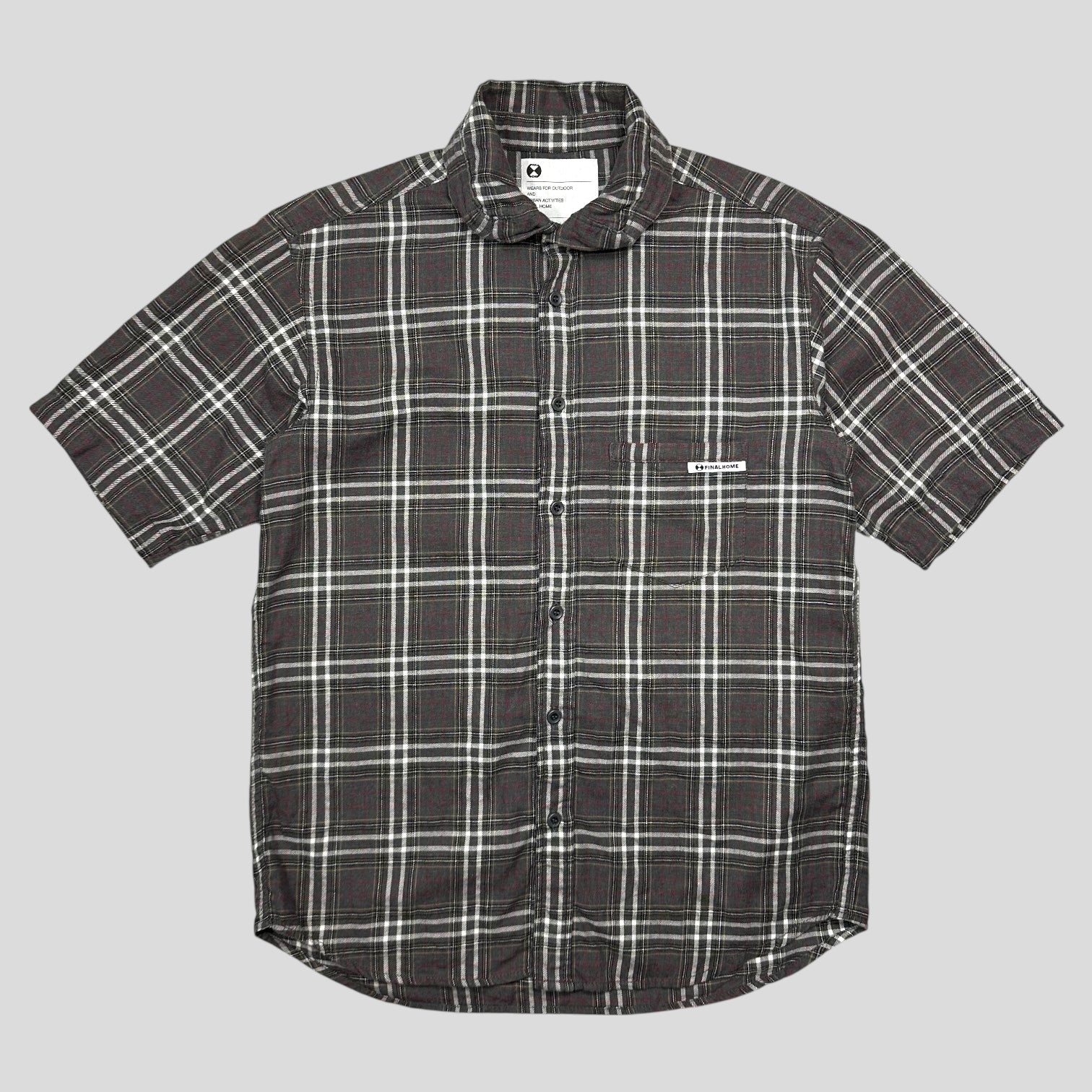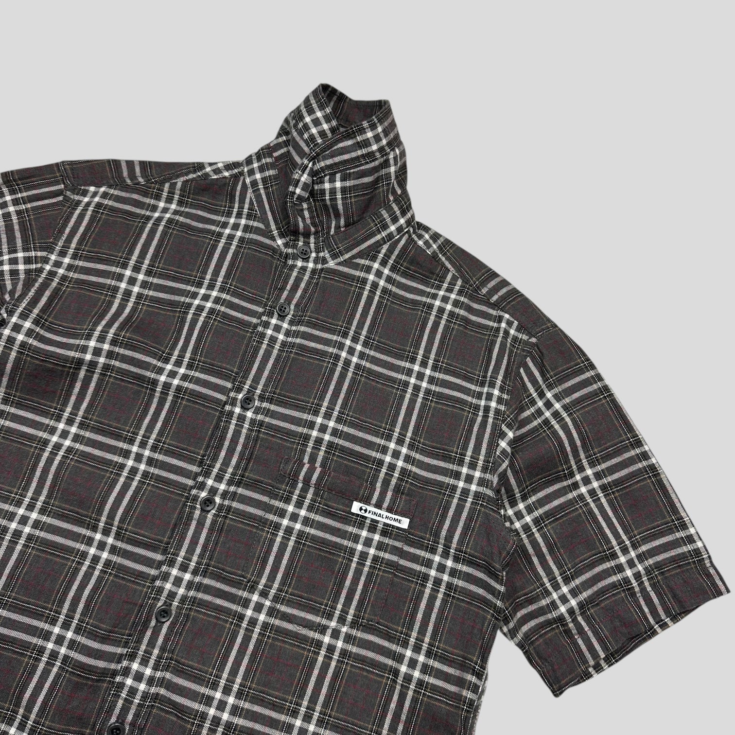 Final Home by Issey Miyake AW 2008 grey nova check cotton short sleeve survival shirt, logo tab to pocket, lovely quality made in Japan.