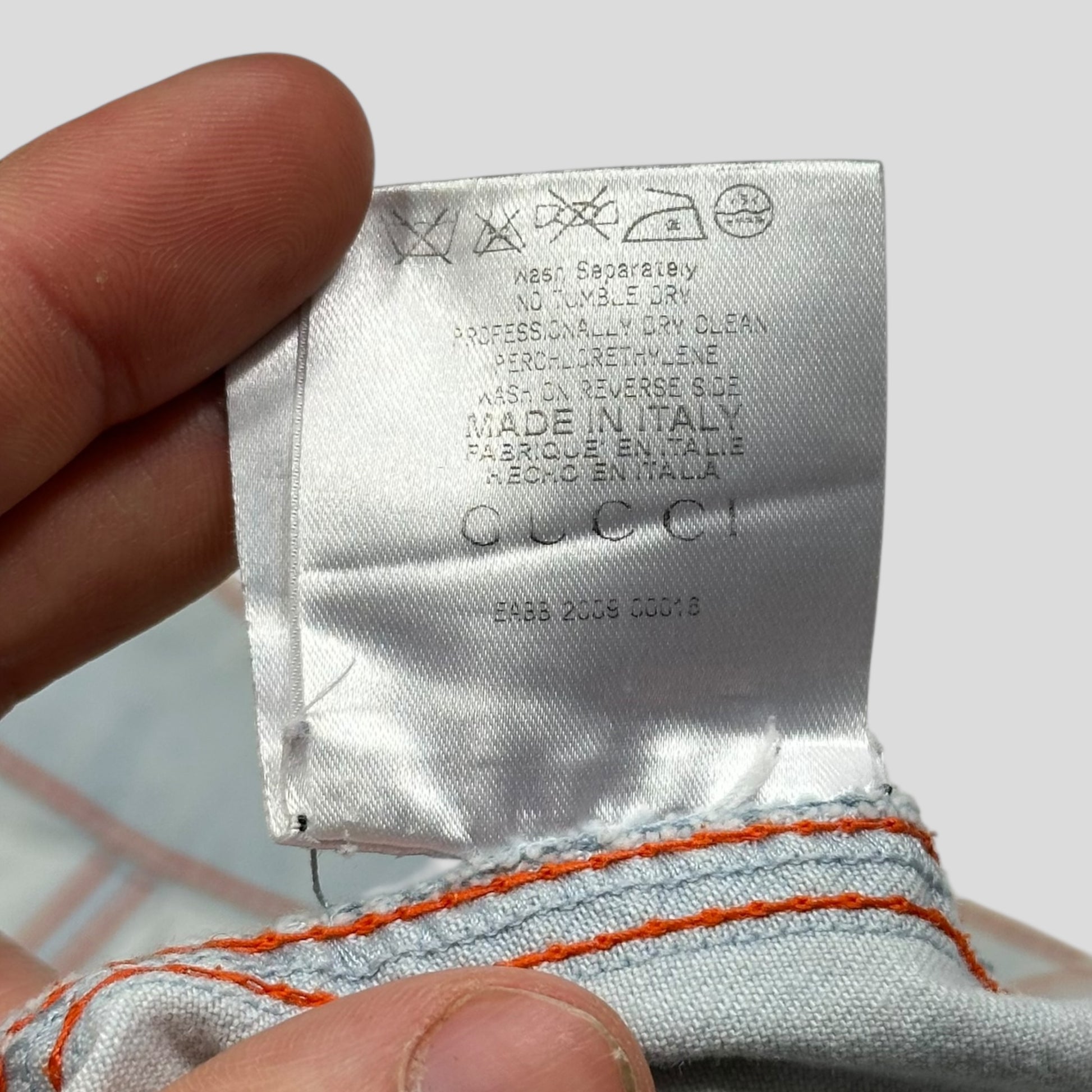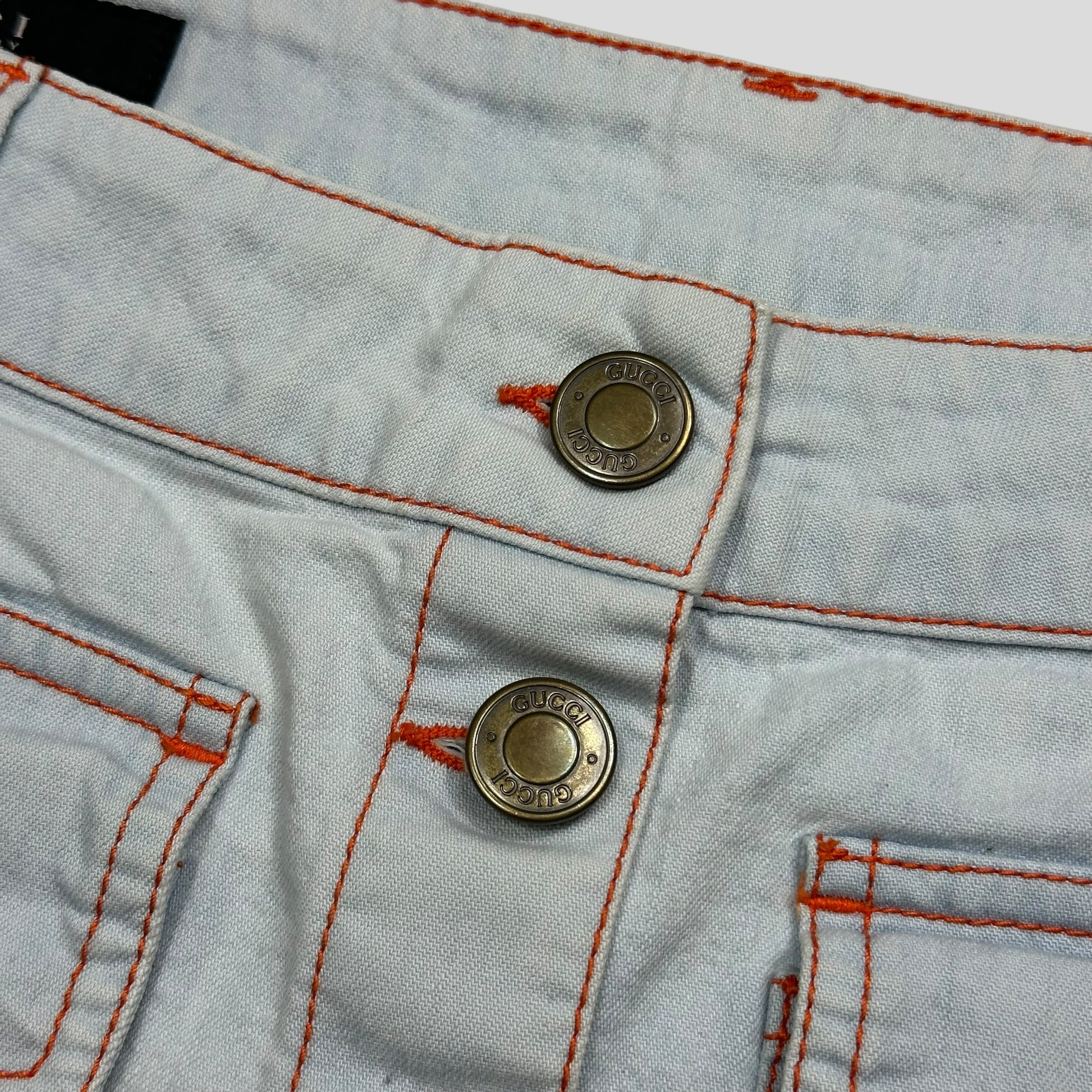 Very rare 2009 Gucci western cowgirl style pale light wash baby blue denim miniskirt, unique contrasting orange stitching, cargo flap pockets, Gucci metal buttons and a leather logo back tab.