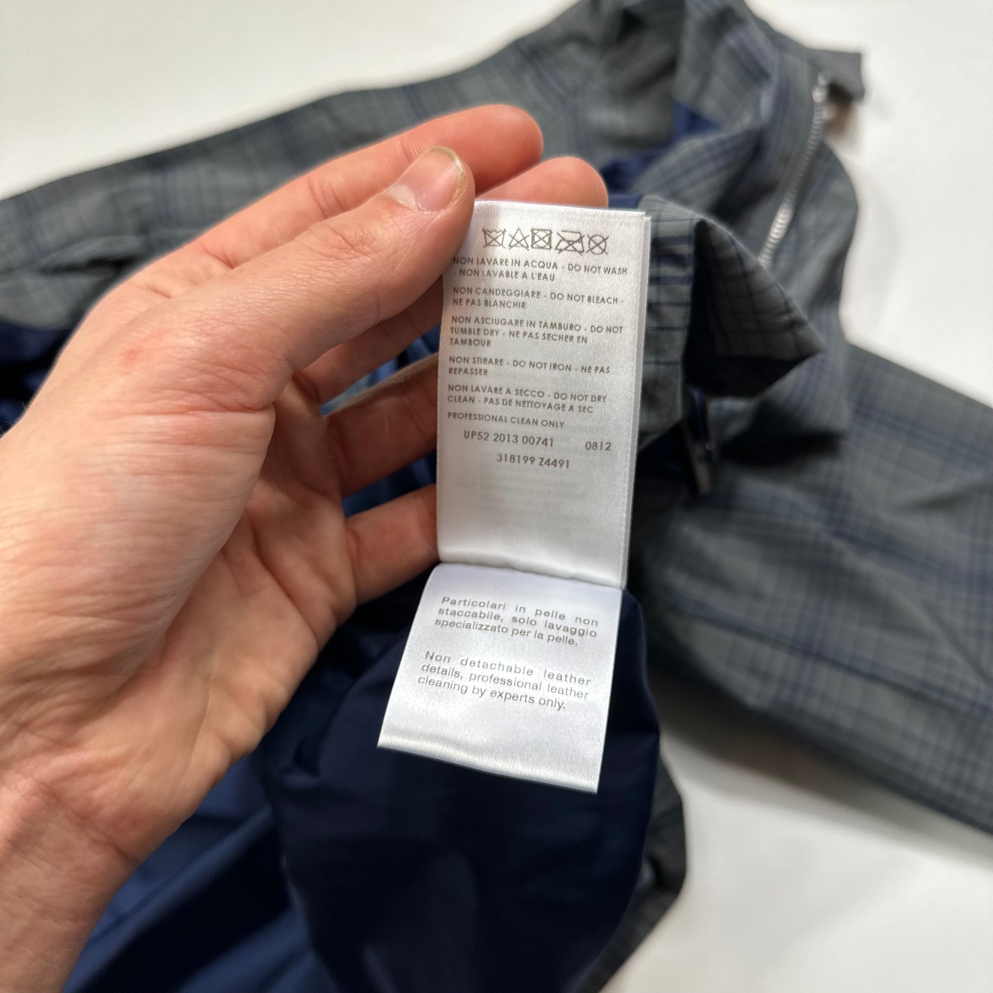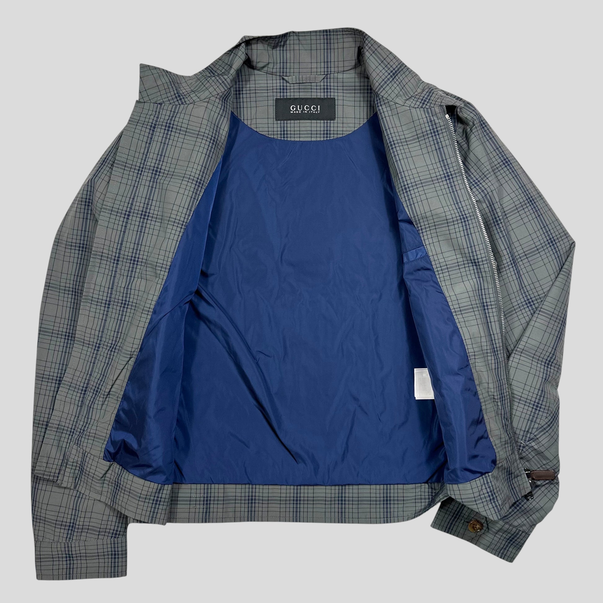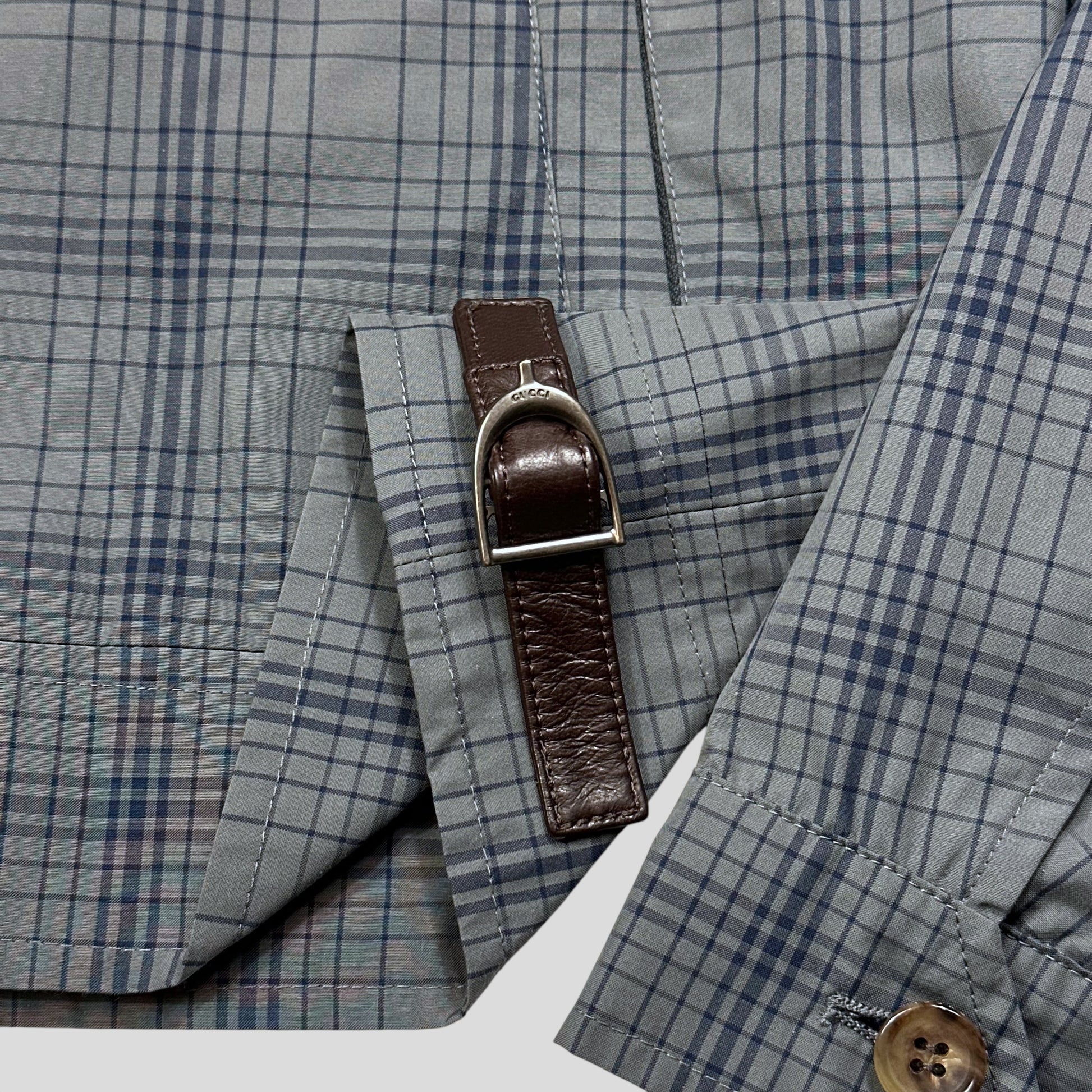 Absolutely impeccable 2013 Gucci grey and blue grid check plaid boxy jacket, leather Gucci horsebit buckle details to the sides to adjust the fit, leather Gucci zip pull, buttoned collar and cuffs, silky polyester lining.