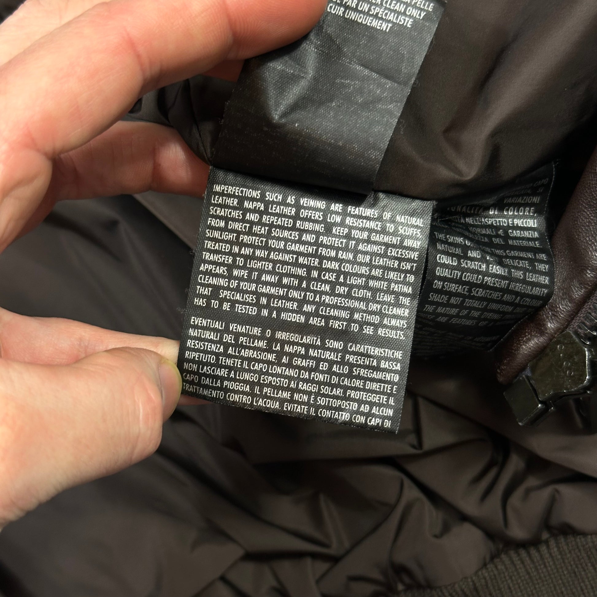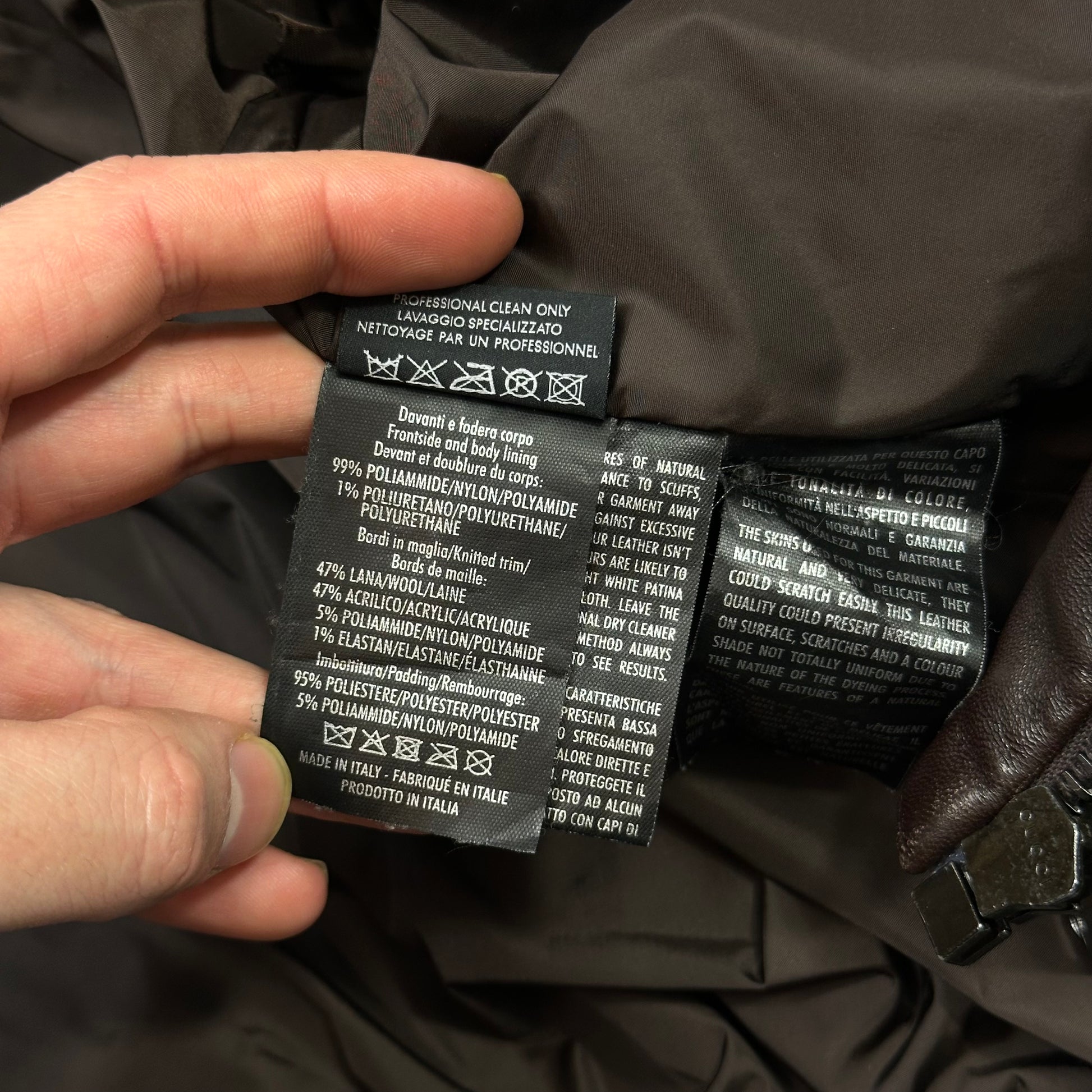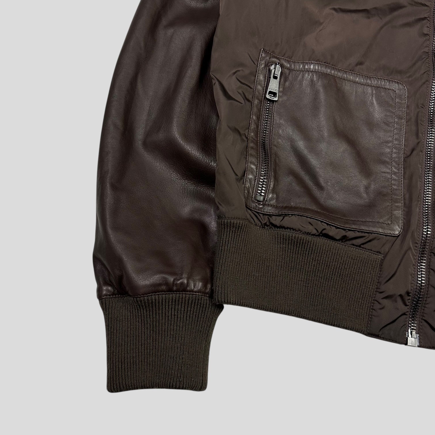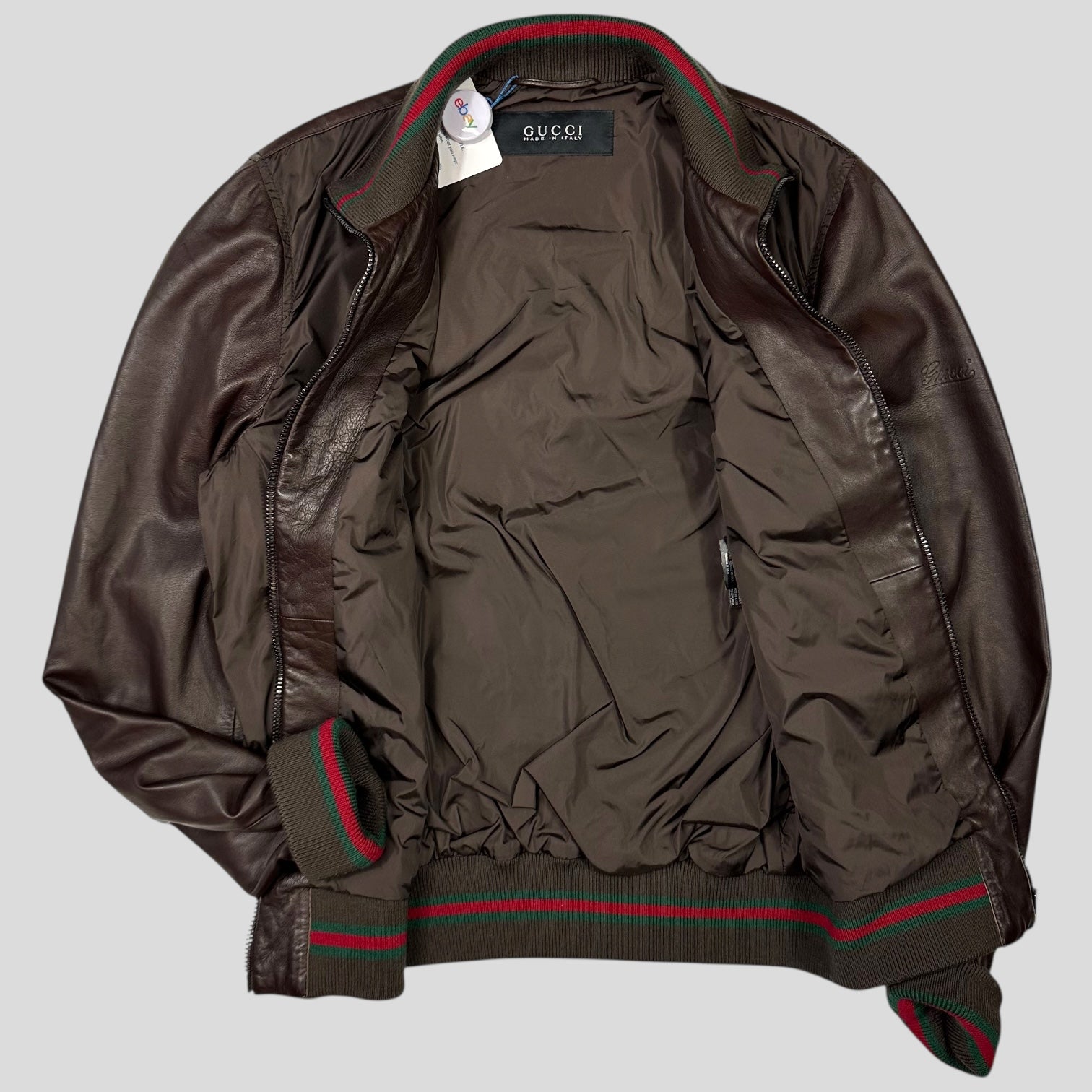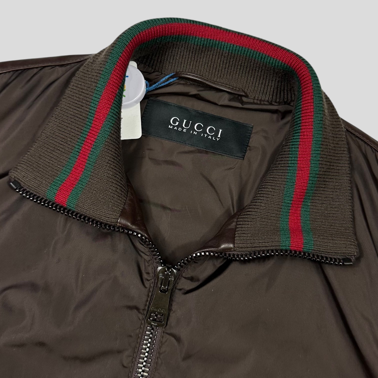 Beautiful premium Gucci ebony brown Nappa leather bomber biker jacket with hybrid nylon panelling to front and leather arms and back, embossed italics Gucci logo to arm, web stripe logo to cuffs and inside collar, leather zip hand pockets to front, chunky metal Gucci zippers, made in Italy extremely soft buttery leather, comfy nylon lining.