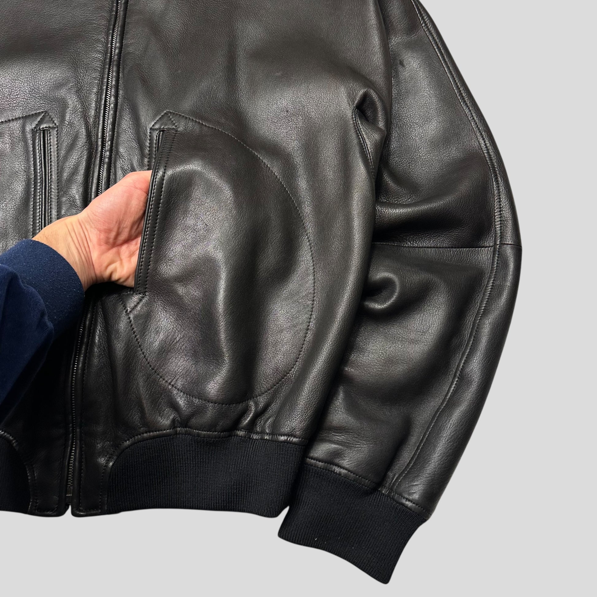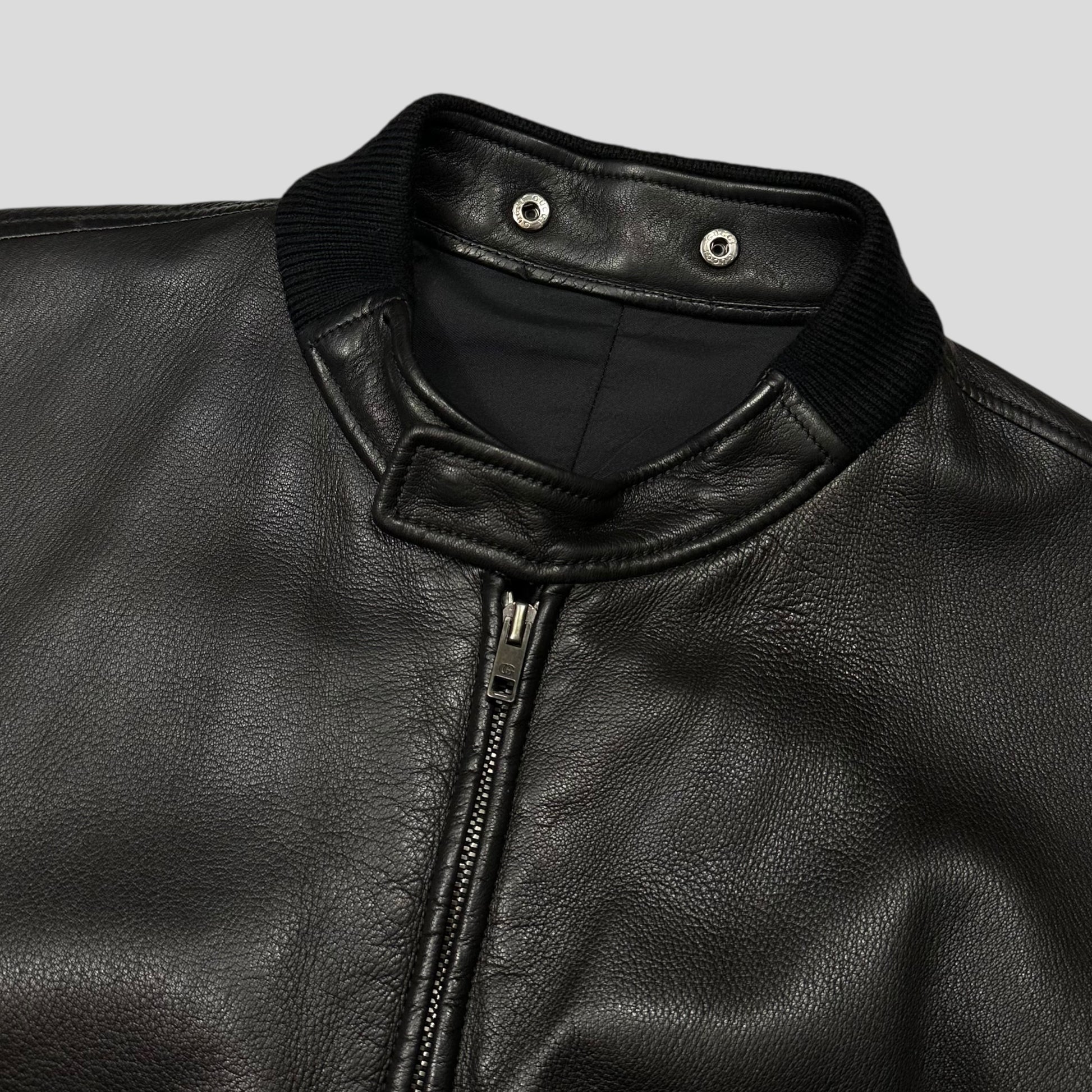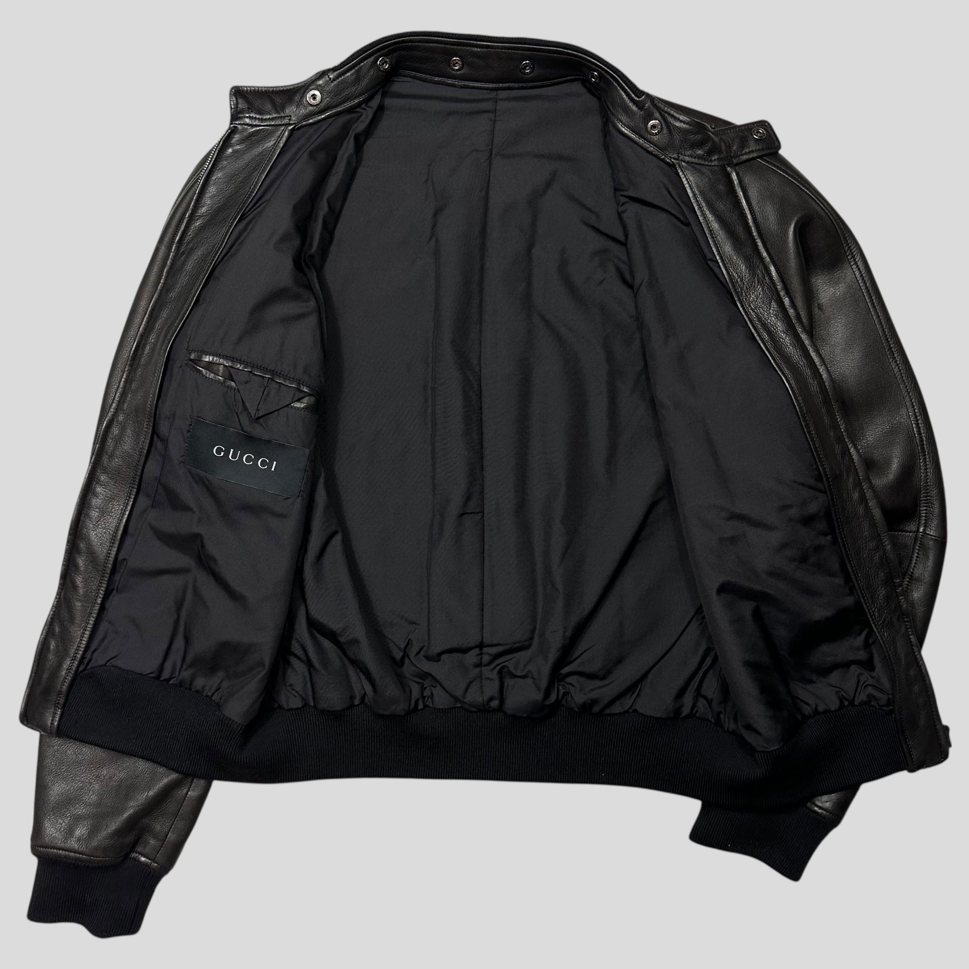 Extremely rare and beautiful black Gucci by Tom Ford lambskin leather bomber flight jacket, unique lungs style pockets at the front that are accessed by the opposing arm, beautiful big open pleat detail on the back synonymous with the fall winter 2003 Tom Ford season.