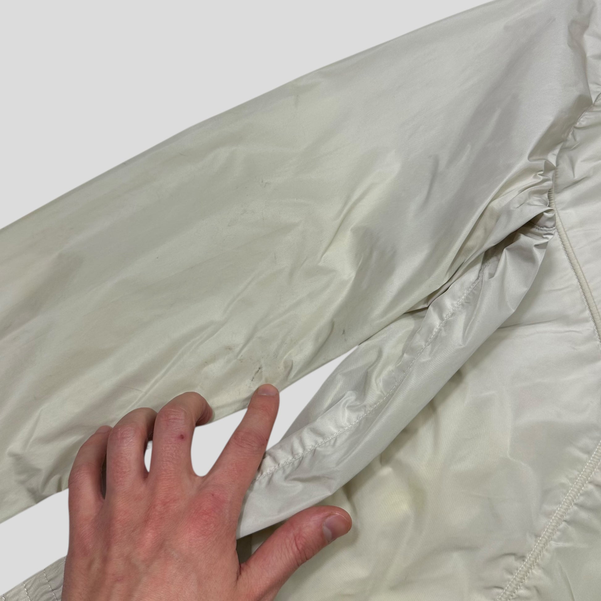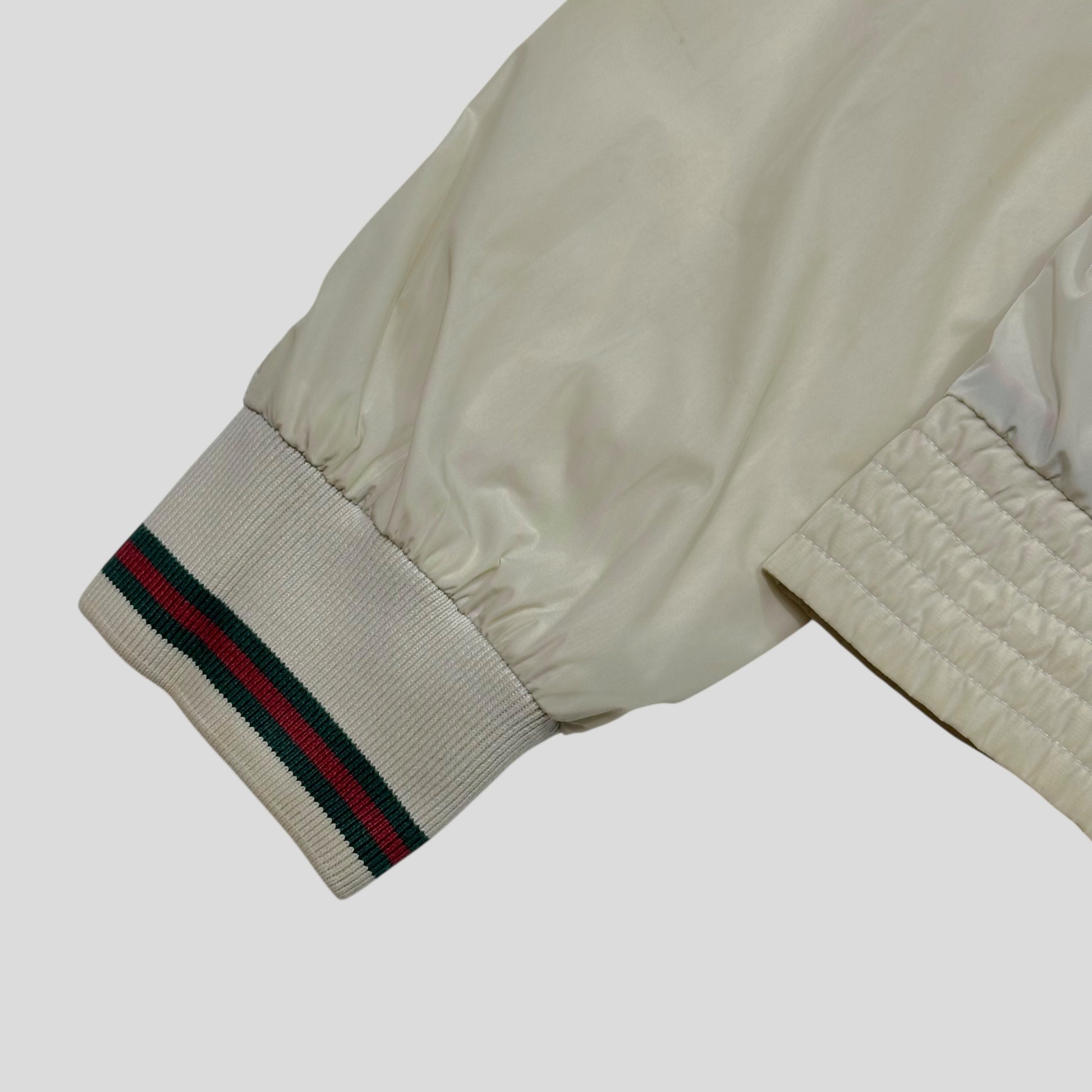 Rare early 2000’s Gucci by Tom Ford opal white nylon bomber jacket windbreaker, military style, Gucci web stripes to cuff, inner and outer pockets.