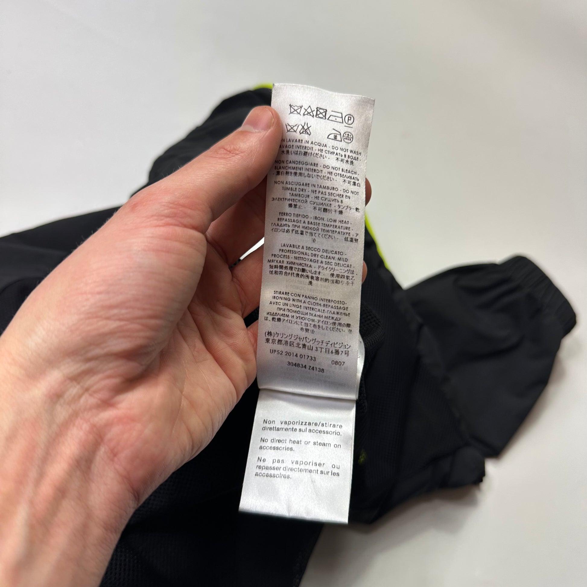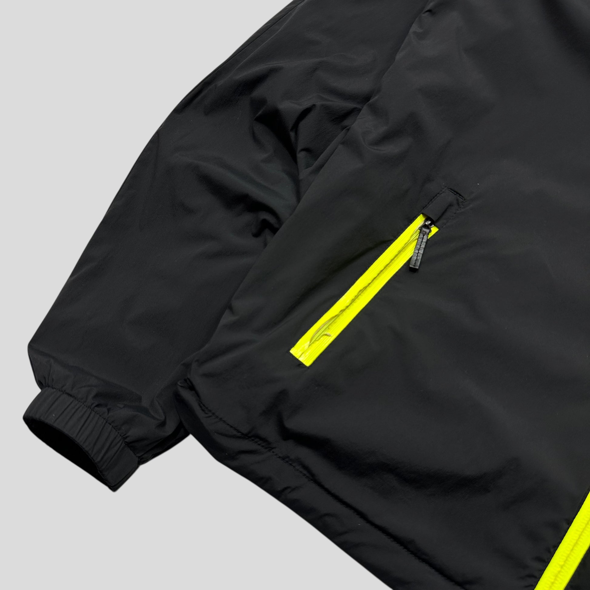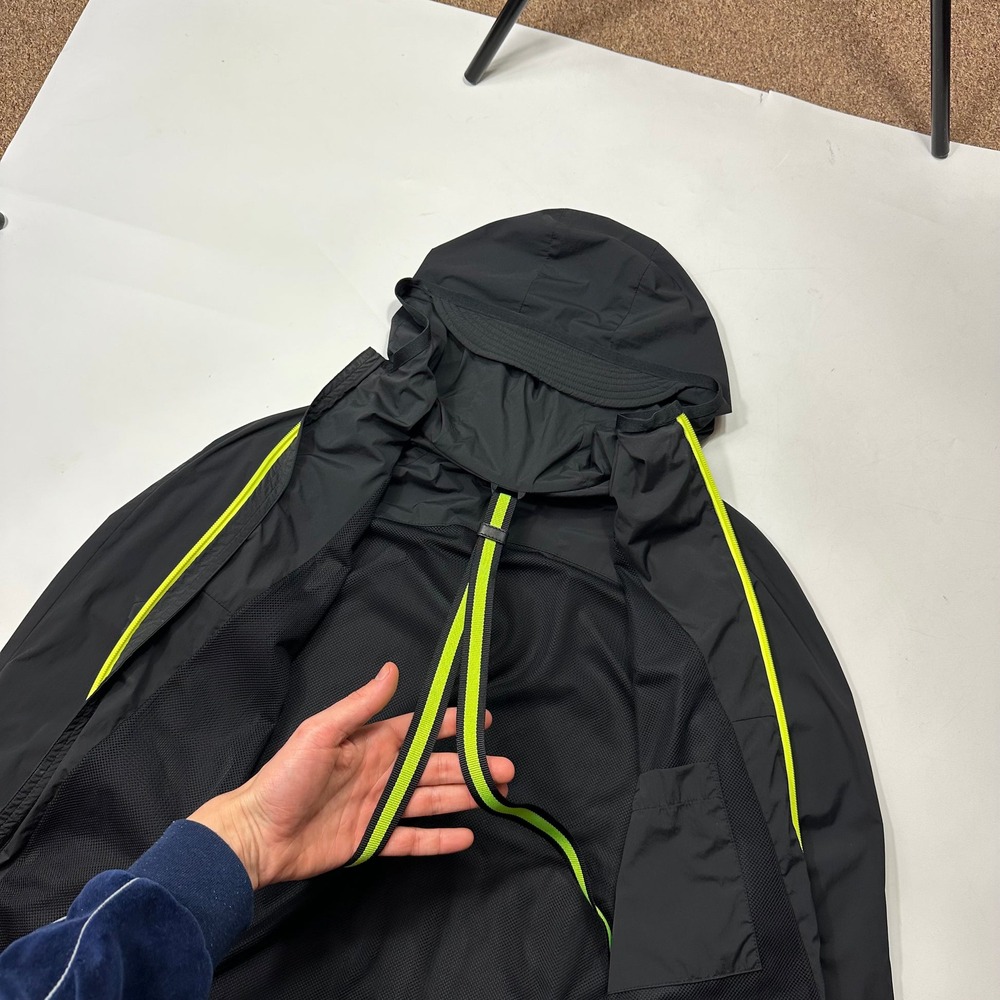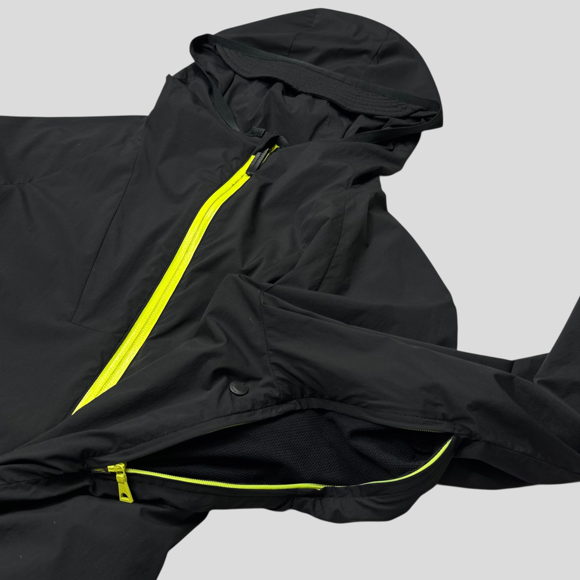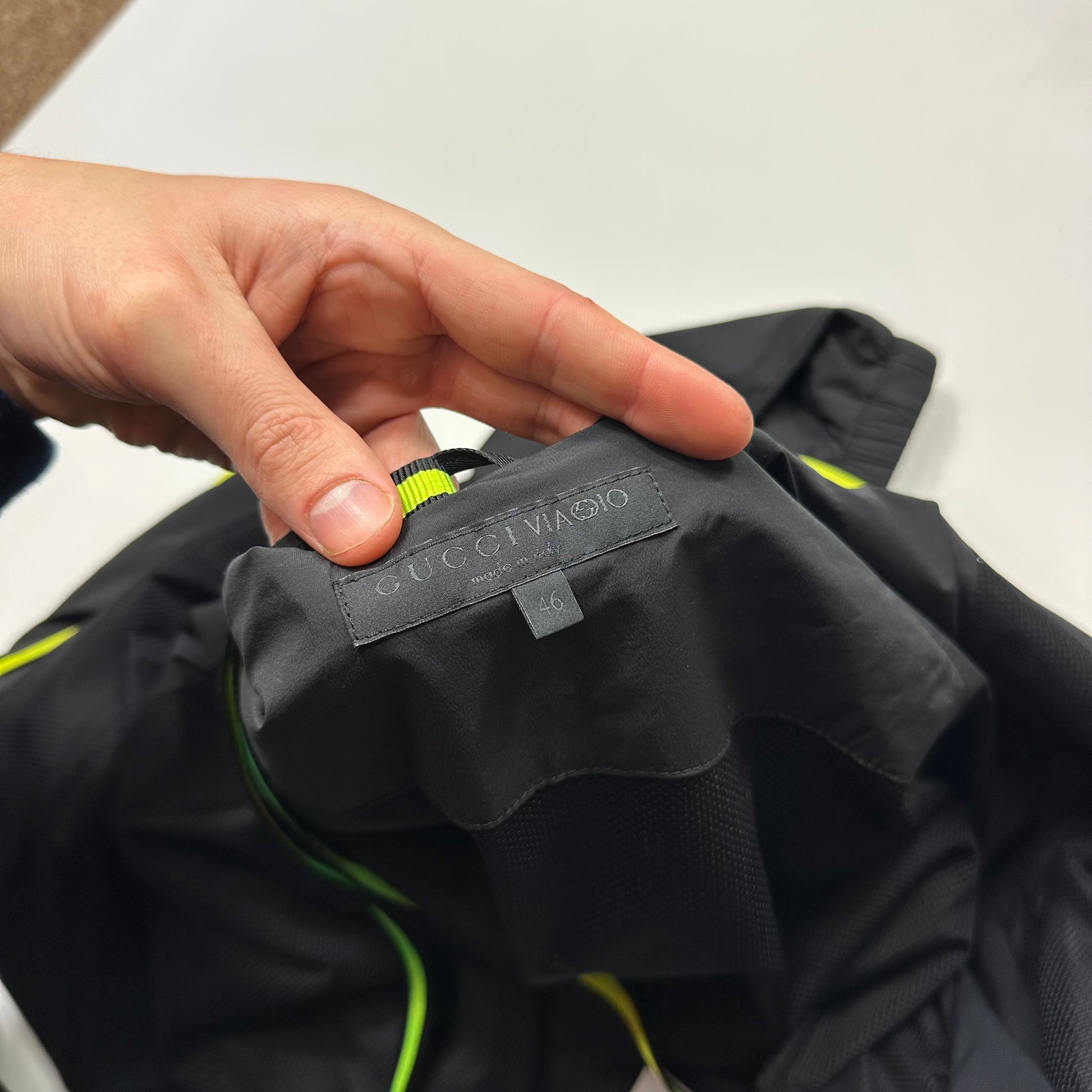 Very rare black and neon nylon Gucci Viaggio 2014 collection windbreaker, designed with travel in mind this windbreaker has backpack straps built in to easily carry it while not in use, peaked hood to keep rain off, cinch cords at hem, inside pocket and ventilated zips at armpit.