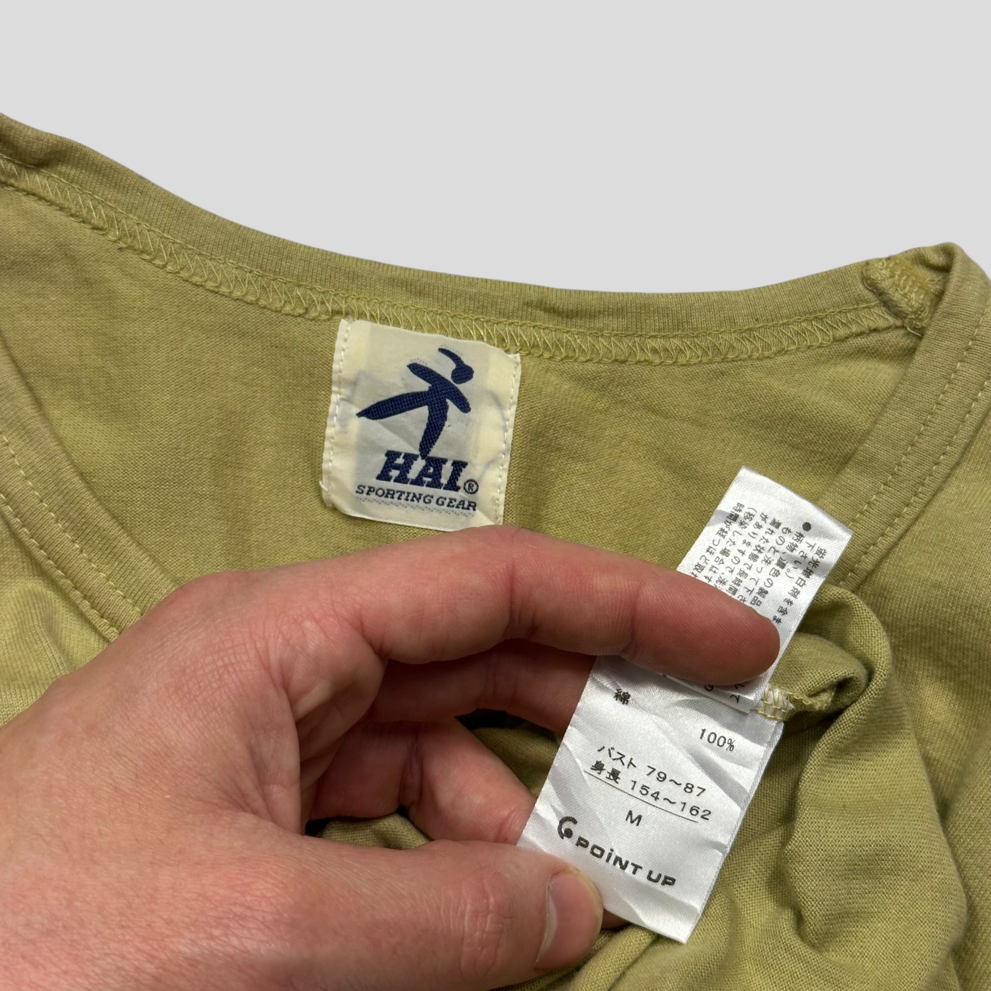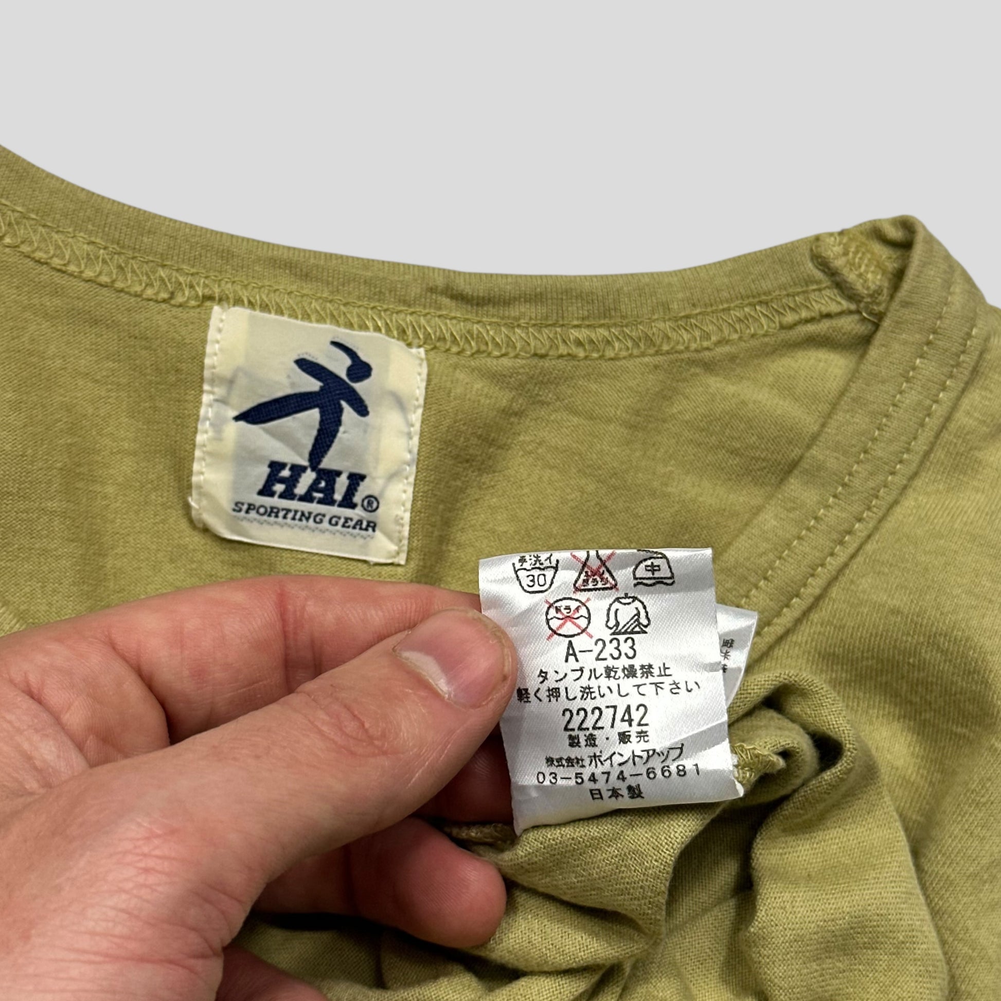 Rare 1990’s Hai Sporting tee, washed sand green / yellow colourway, embroidered logo Spellout, reconstructed patchwork plaid paisley.