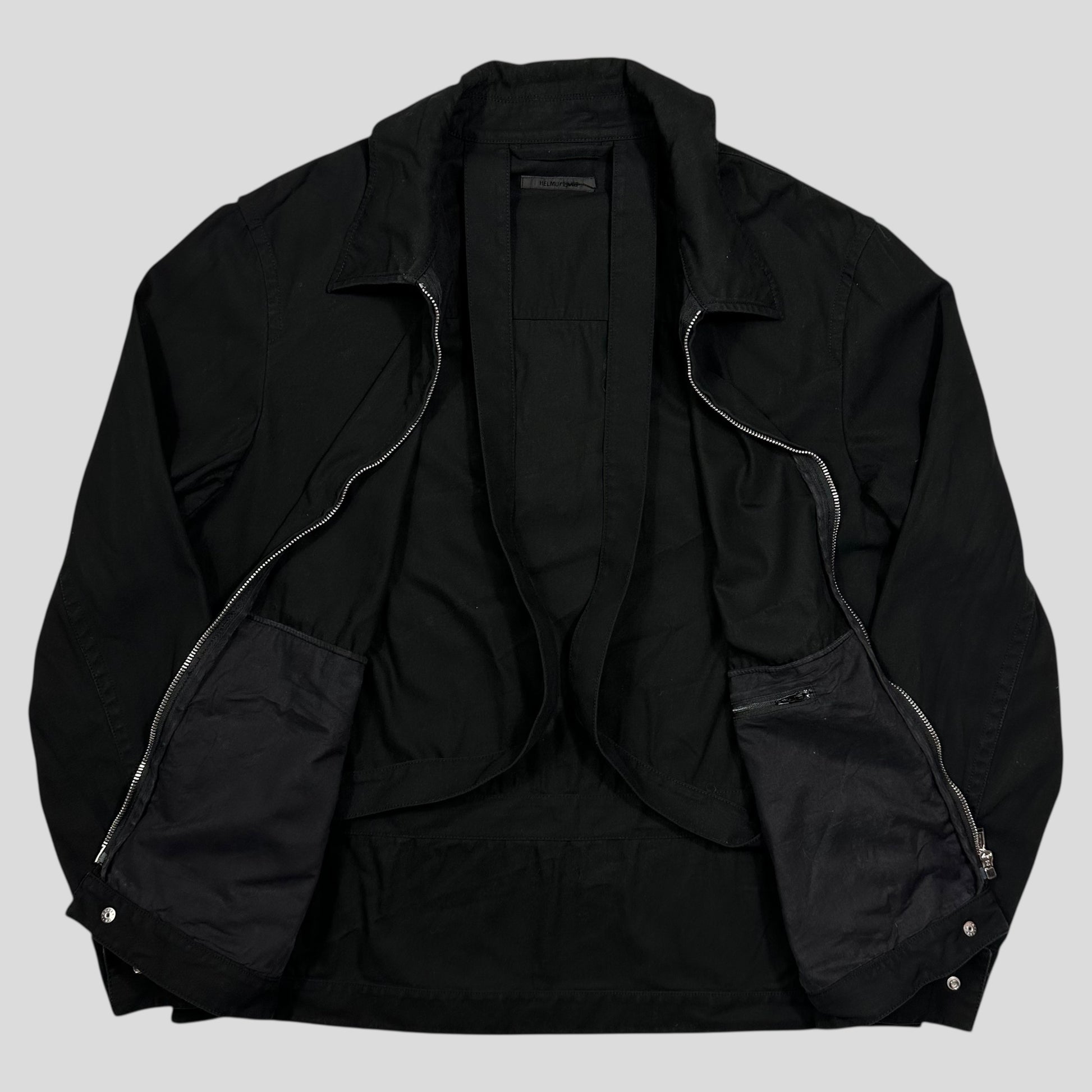 Very rare SAMPLE Helmut Lang cotton black work jacket, features the iconic parachute straps inside to wear it on your back when not in use, metal exposed hardwear and popper hand pockets.