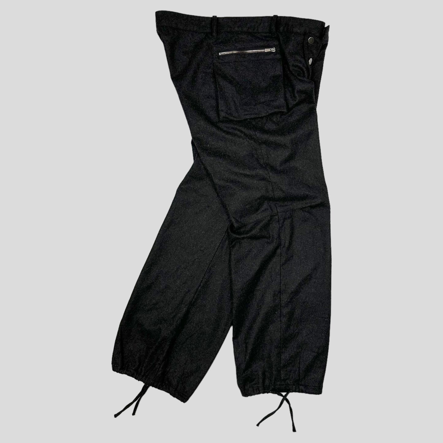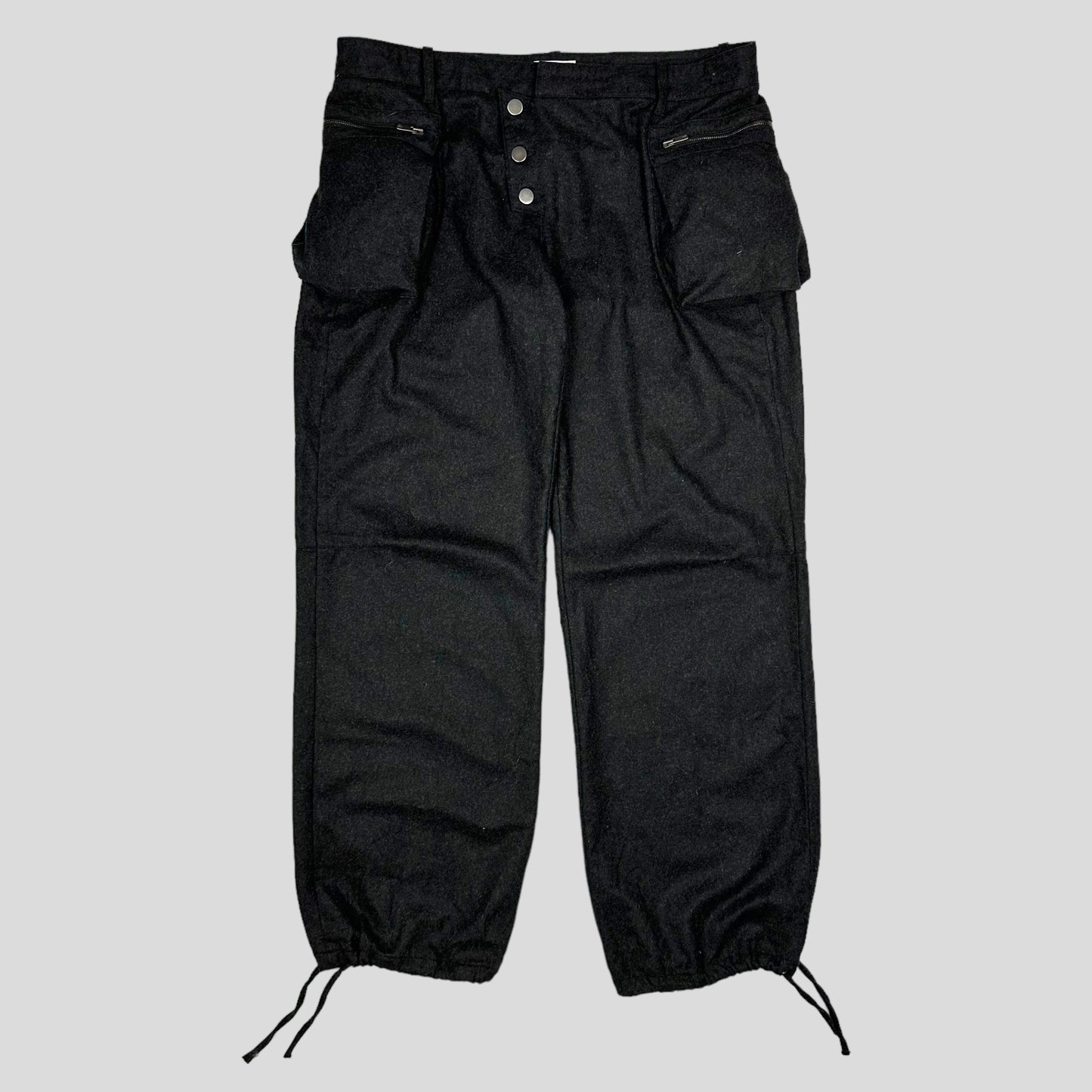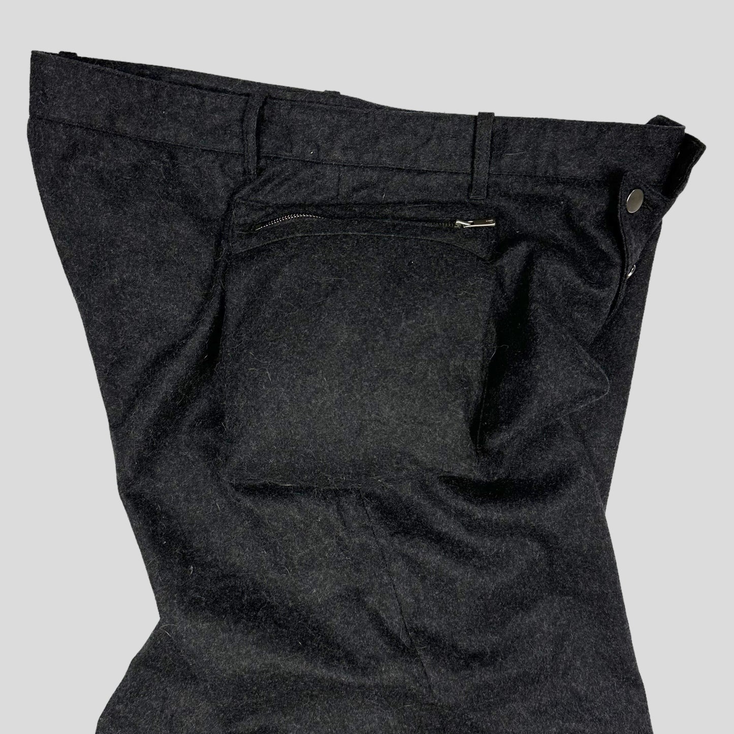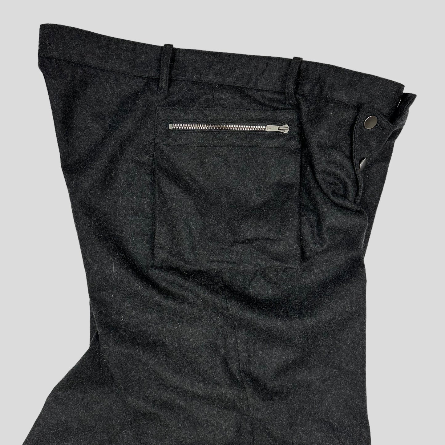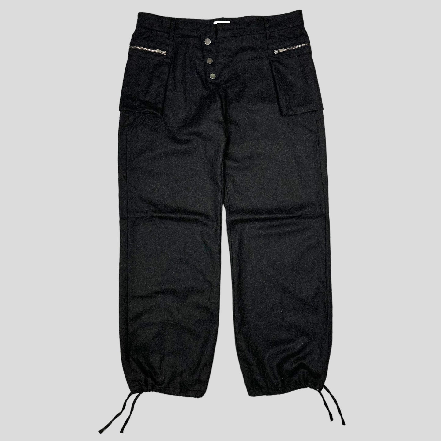 Extremely rare Italian charcoal grey wool and cashmere blend cargo trousers by Iceberg, gorgeous material with interesting exposed metal zip 3D pockets placed on the outsides of the belt line and an asymmetrical exposed button fly.