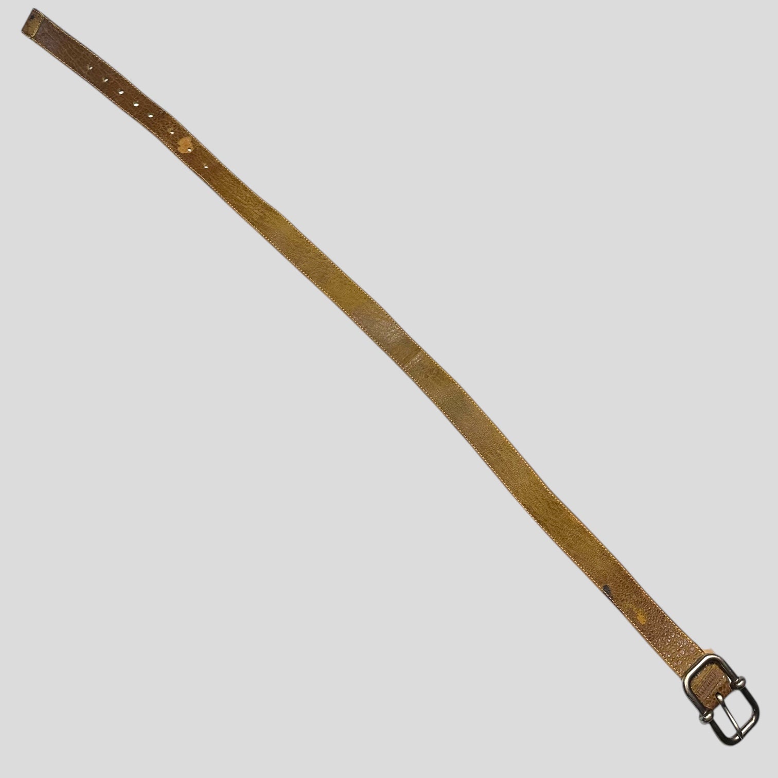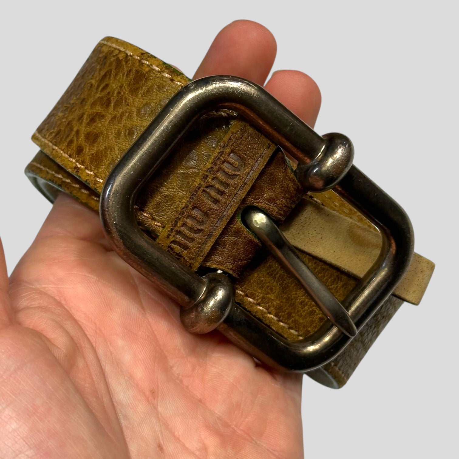 Very nice mens belt from 2000’s Miu Miu by Miuccia Prada, textured brown leather with Miu Miu logo loop, chunky metal buckle, green contrast stripe to belt edge.
