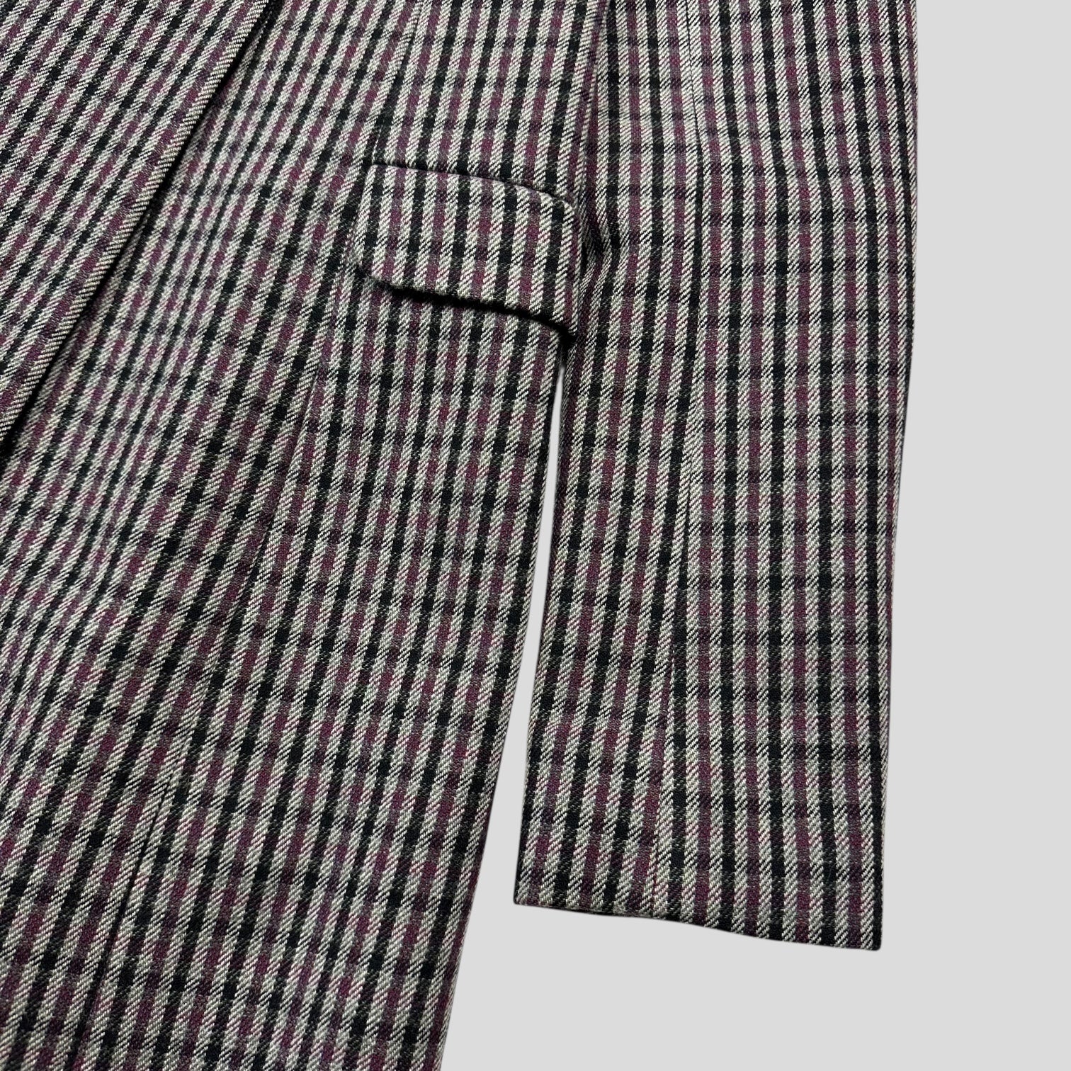 Beautiful 2000’s Virgin Wool Purple and Grey plaid micro checker trench coat, black removable sheep fur very rare to find one with this still included, silky soft lining, leather hook and key closure detailing on the front.