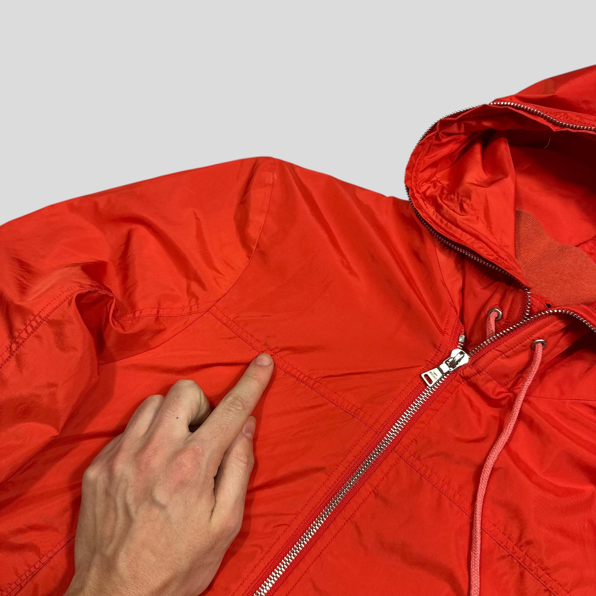 Rare Neil Barrett (Ex Prada Designer) orange nylon polyester windbreaker jacket, unique twin zip front that can be zipped all the way up to cover your face, Bape style, can also be zipped onto the second zipper cinching the jacket fit inwards, bomber zip pocket with pen slots to arm, Neil branded chrome zips.