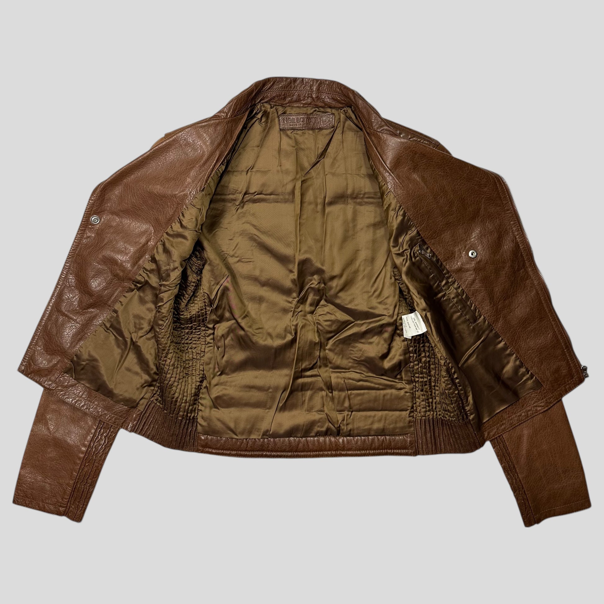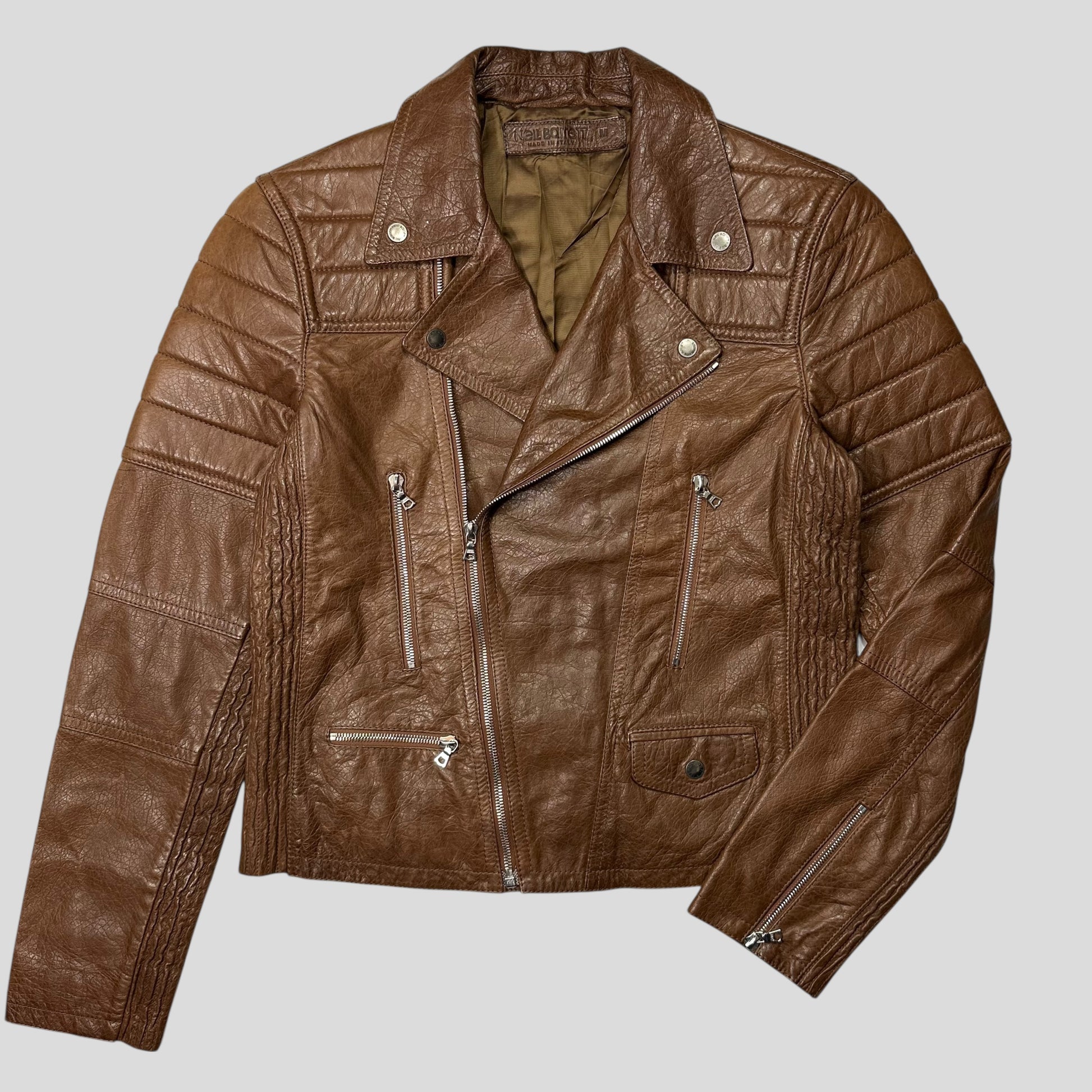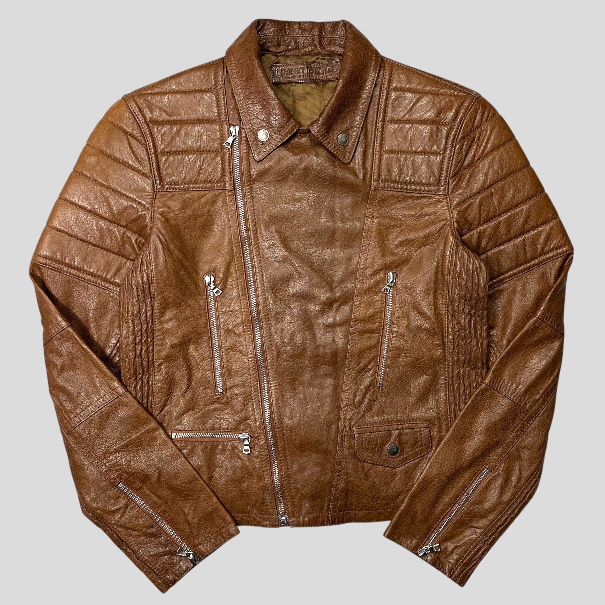 Beautiful Crispe Natural Brown Spring Summer 2012 Neil Barrett leather double riders motorbike jacket, buttery soft supple leather with moto padded detailing throughout, unique multipocket design with mini pocket and exposed metal RIRI zips, silky suit like lining.