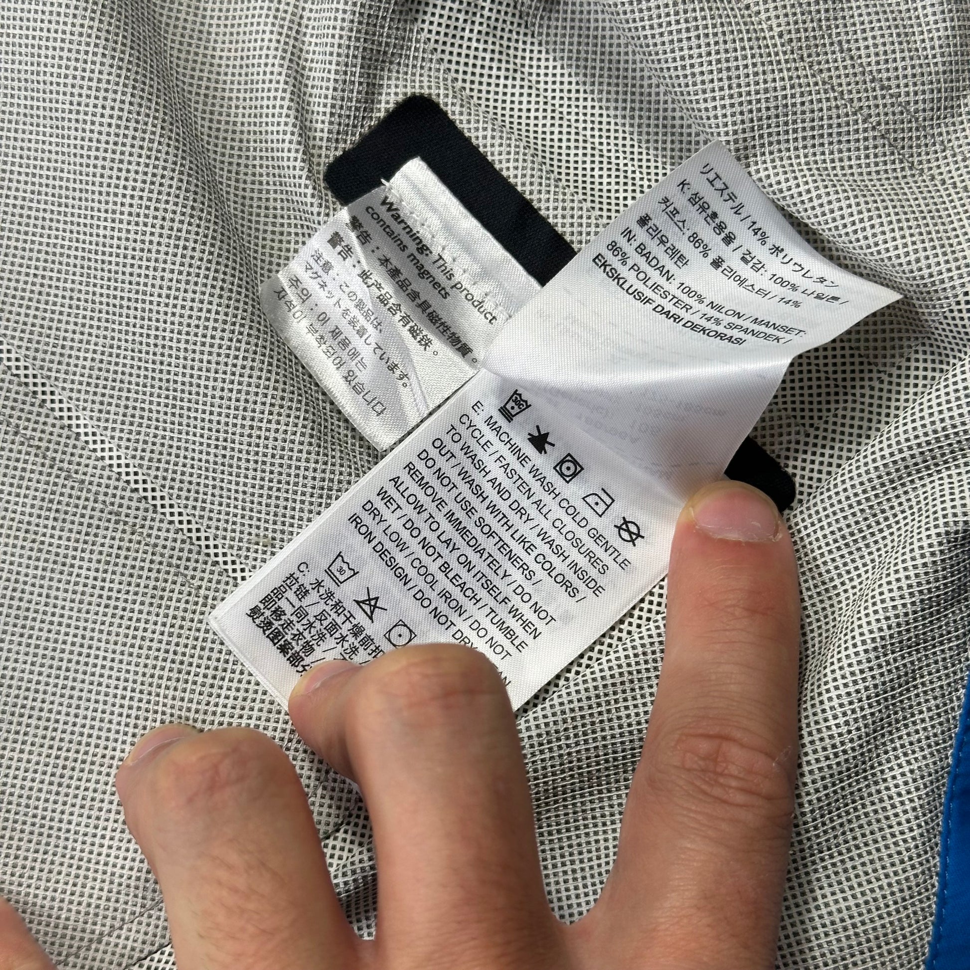 Very rare 2015 Nike Gyakusou x Undercover Japan taped seam waterproof jacket with 3m reflective diamond print, ninja balaclava hood, asymmetrical hidden zipper with magnetic closure, printed 3m logo to back, thumb gloves at wrist, hidden stash pocket on back, grey and blue colourway, breathable pit zips, crazy piece.