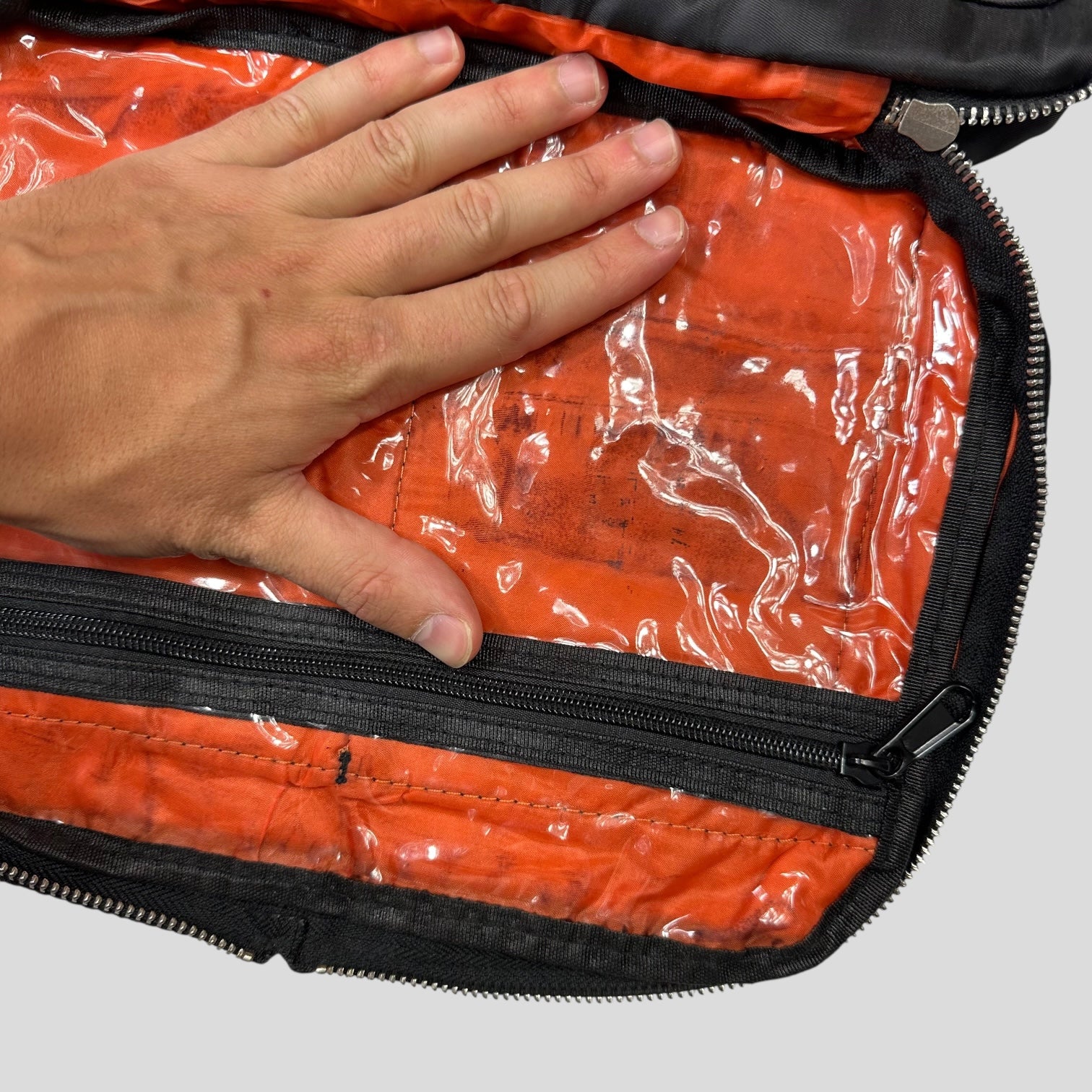 Rare 2000’s Porter Yoshida Black Nylon Tanker Bag, crossbody style which zips out completely revealing the orange inner with multiple storage compartments and a clear vinyl slot. Two main zipper pockets and two button pockets on the front.