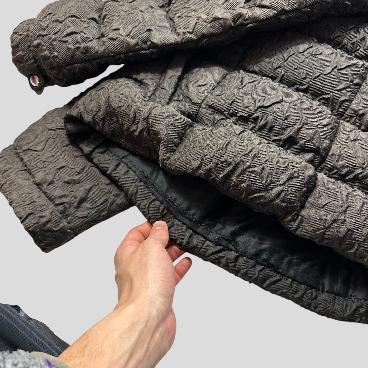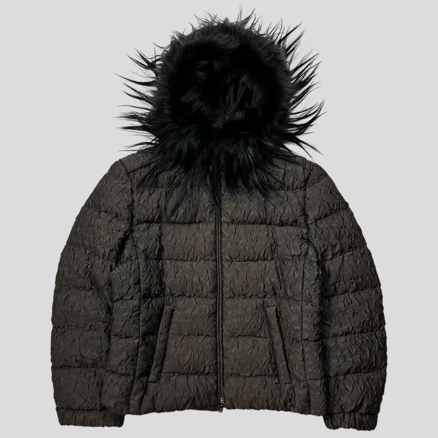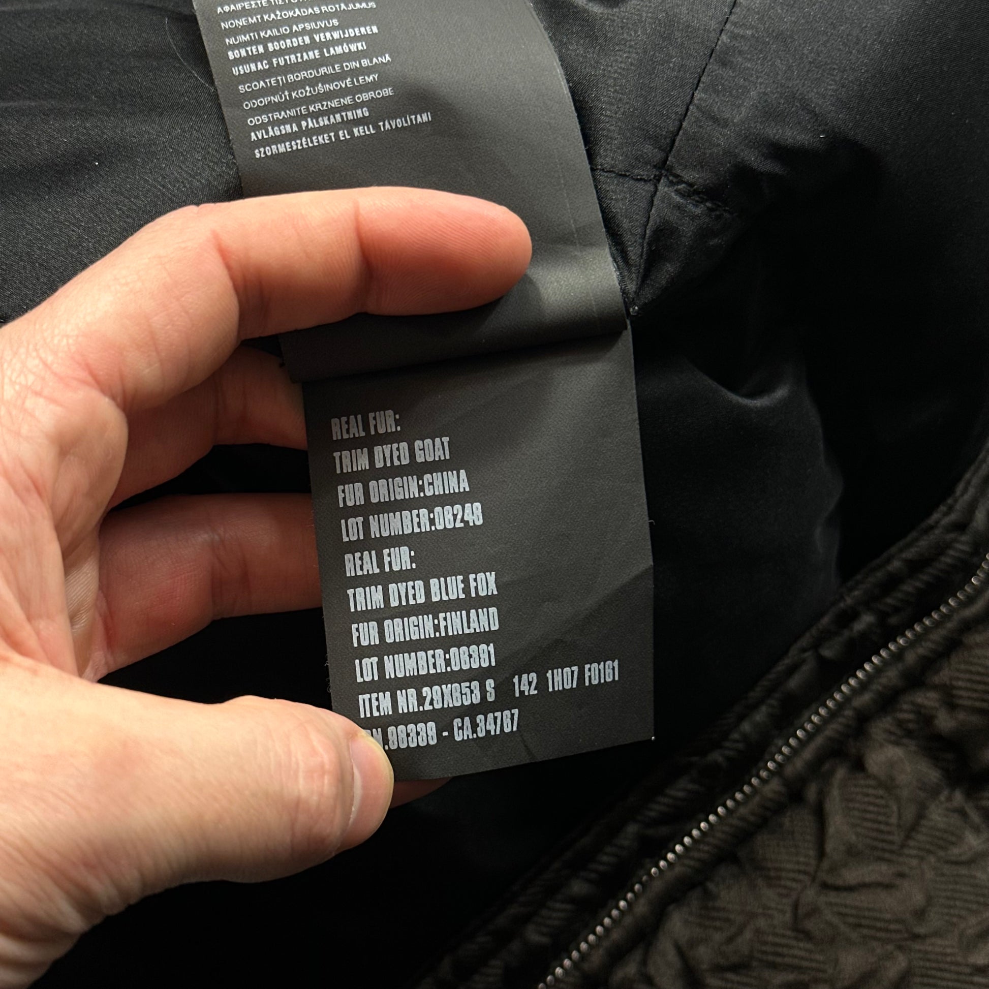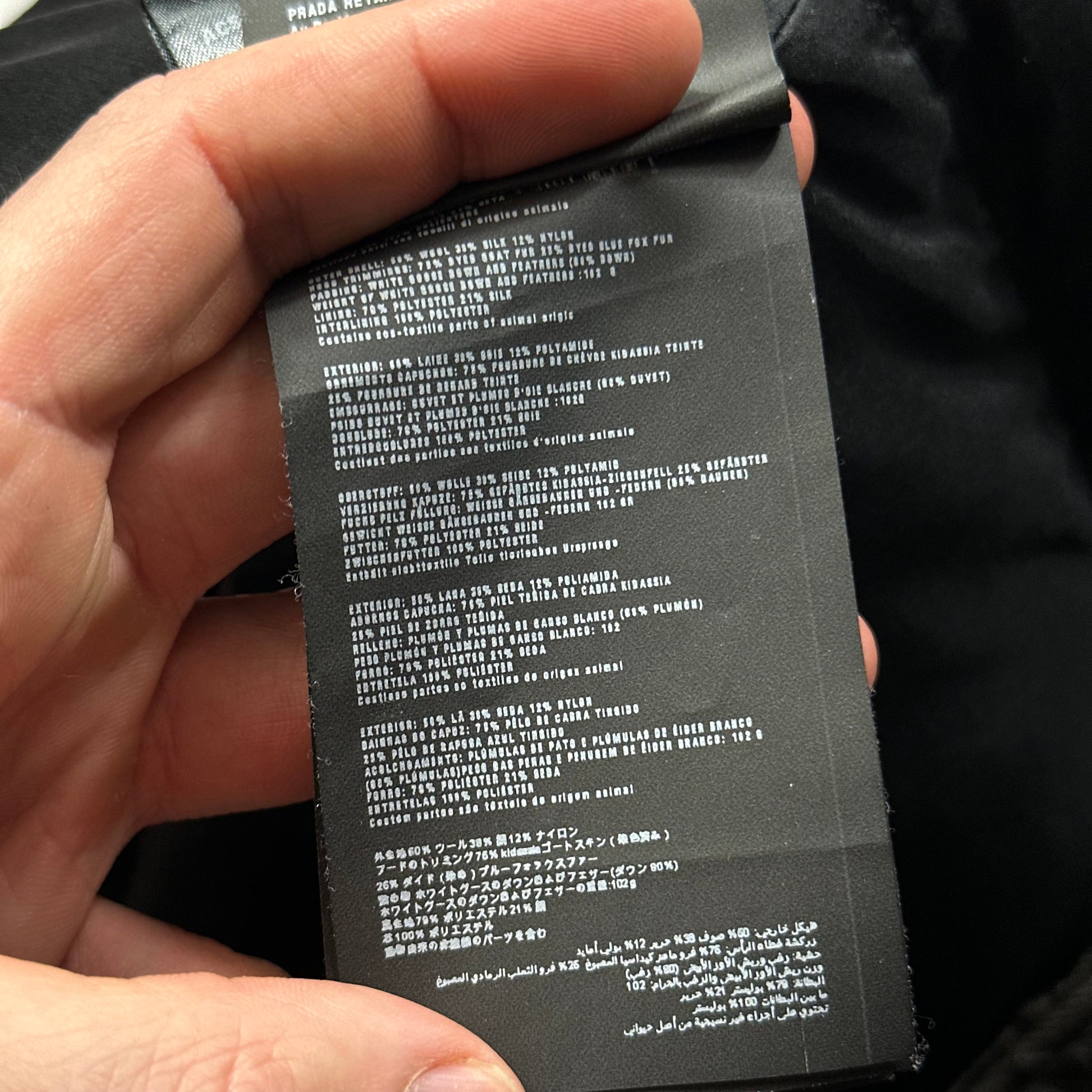 Very rare 2014 Prada Milano mainline puffer jacket with a crazy exaggerated draping fur hood made of Goat and Blue Fox fur, unique textured material that’s soft and padded constructed from a silk, nylon and wool blend, one of the most technically interesting and unique modern Prada jackets.