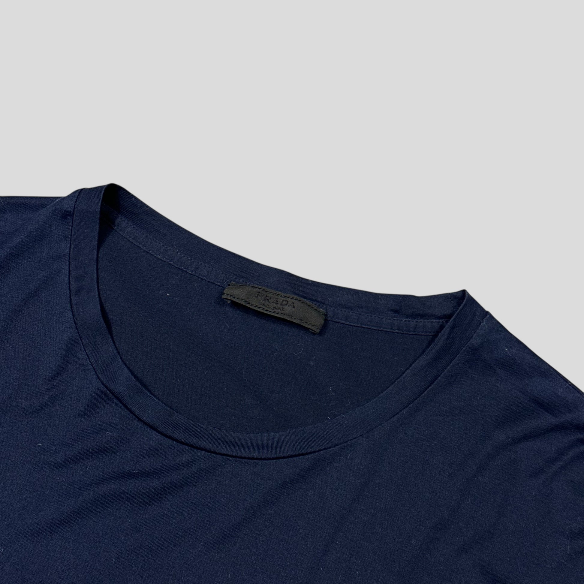 Prada Milano 2016 mainline rich navy tee, full soft cotton construction with black logo tab to pocket.