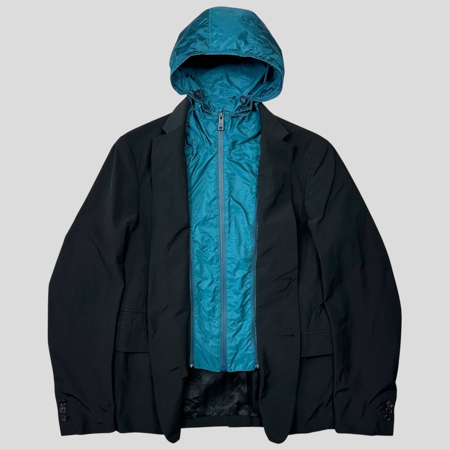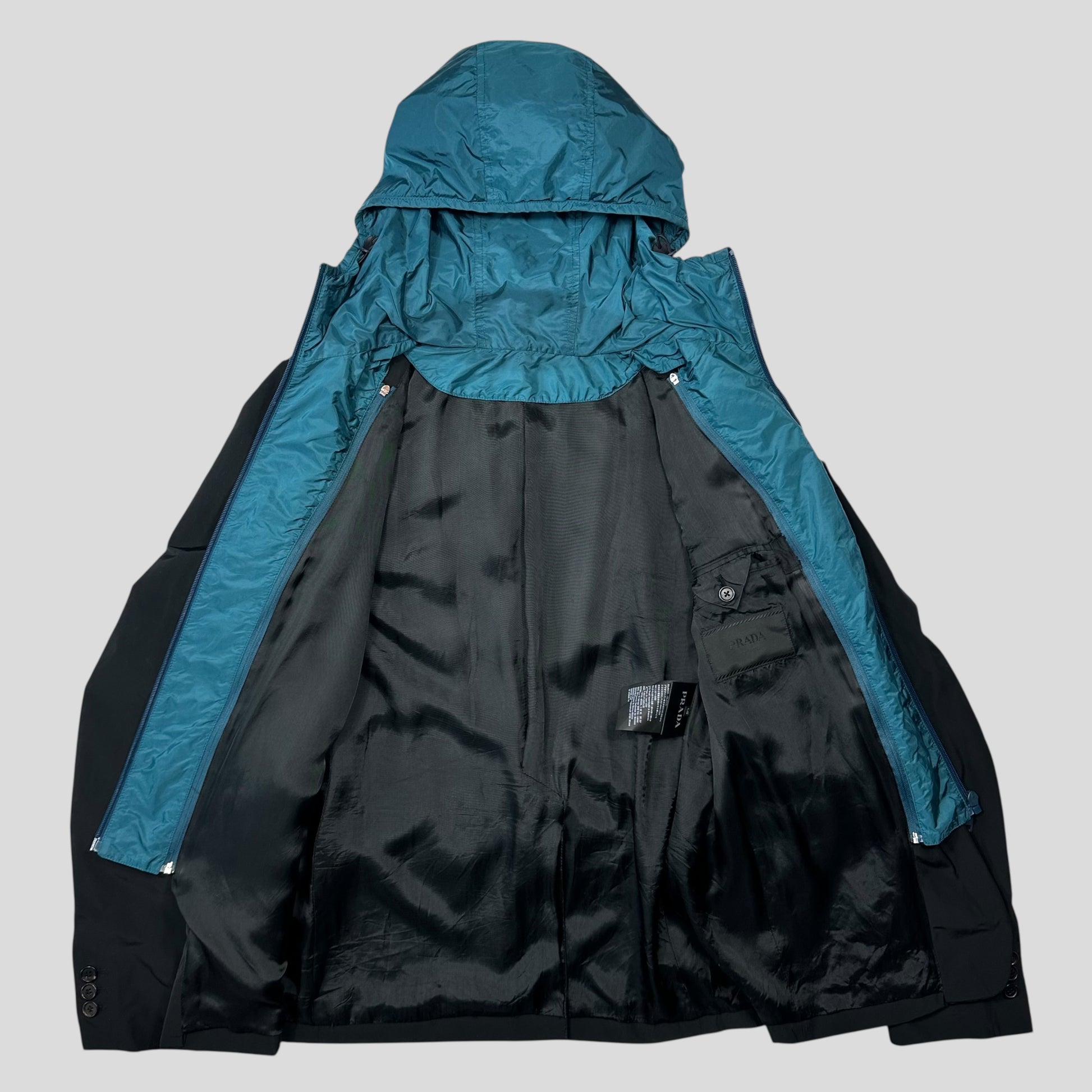 Very rare Prada 2017 mainline nylon black blazer jacket with teal blue nylon PU resin coated removable hood, zips inside the jacket providing a perfect mix of smart casual and technical, a real Prada head turner that makes so much sense for the brand.