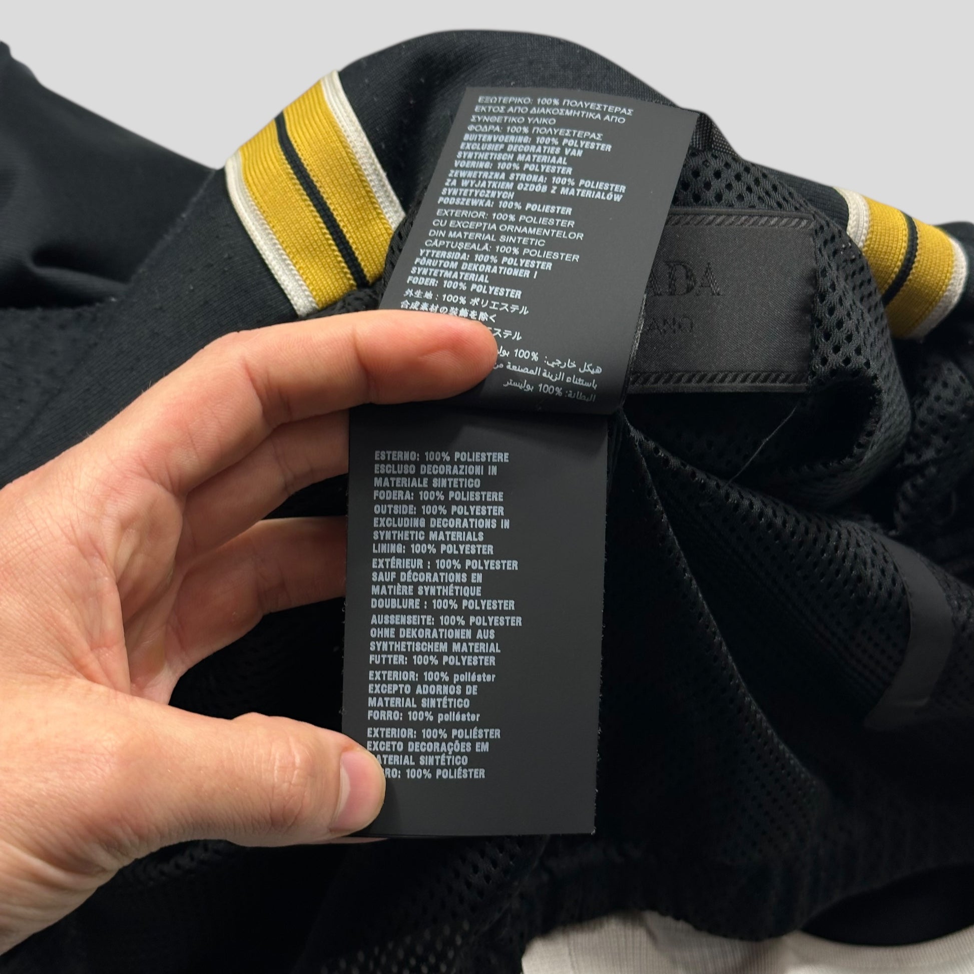 Beautiful 2018 black Prada mainline polyester track jacket with yellow and white piped striping down the arms which meets the neck, black rubber race logo to lower right, zip hand pockets and inside pockets, mesh lined for comfort.