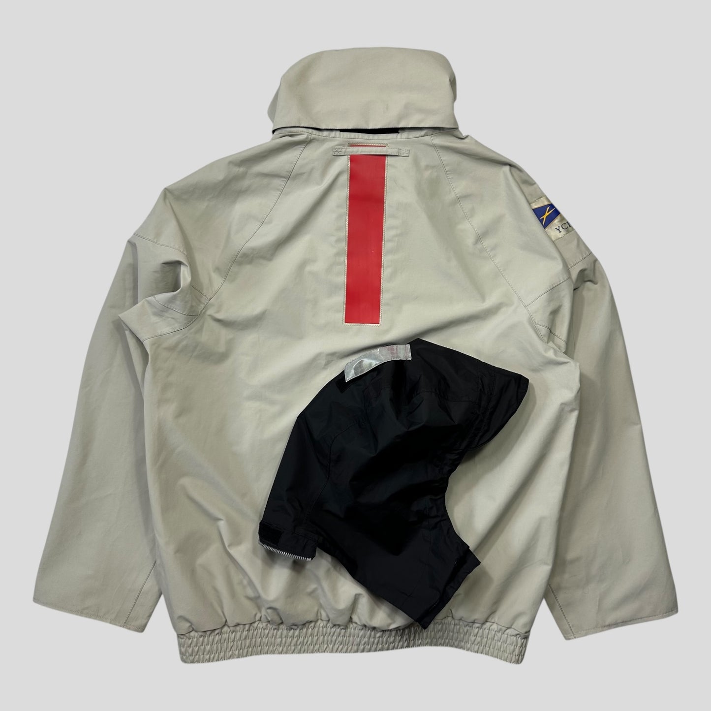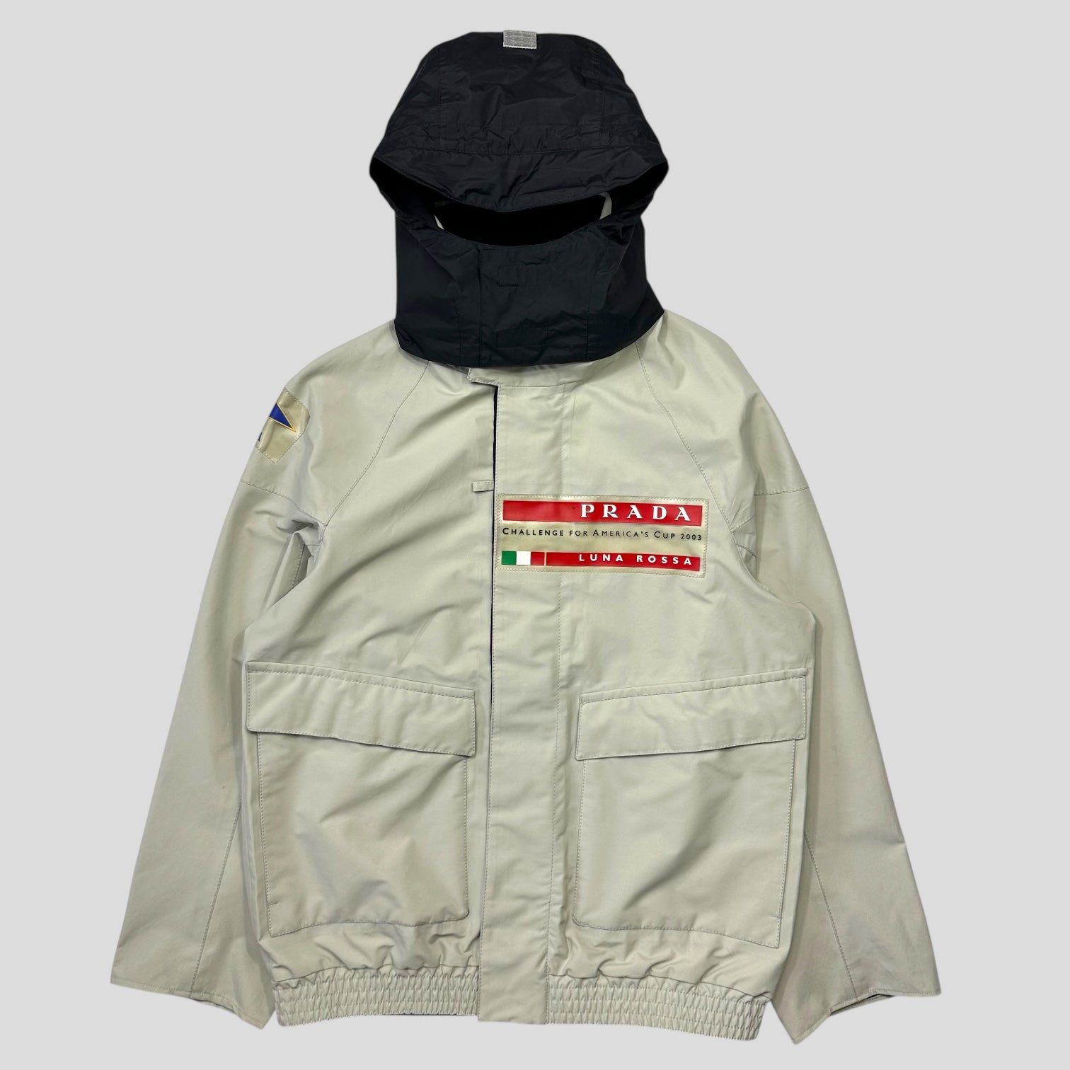 The ‘YCPA’ patch on the arm is representative of the Yacht Club Punta Ala team. There are small differences between this and the version released to the public after the competition, such as slanted pockets, larger chest patches, a velcro reflective strip on the hood and the inclusion of the competition name on the logo.