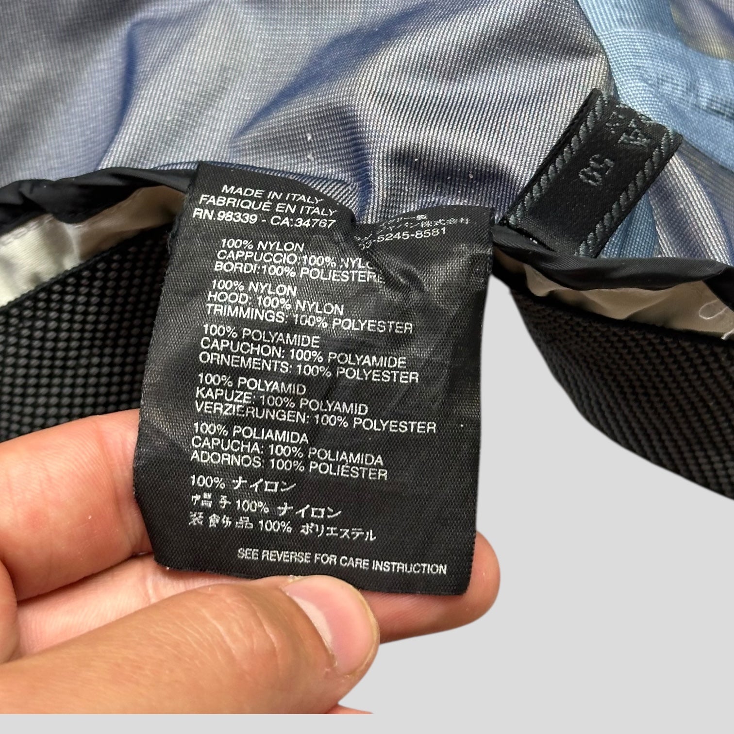 The jacket is modelled after Gore-Tex shells from the Prada Sport line, with two velcro hand pockets, that can be accessed alternatively from the side aswell and adjustable silk cuffs. It also features a detachable nylon hood with a reflective strip on the back, concealed within the collar, which is designed to fall away with ease for quick access by the wearer.