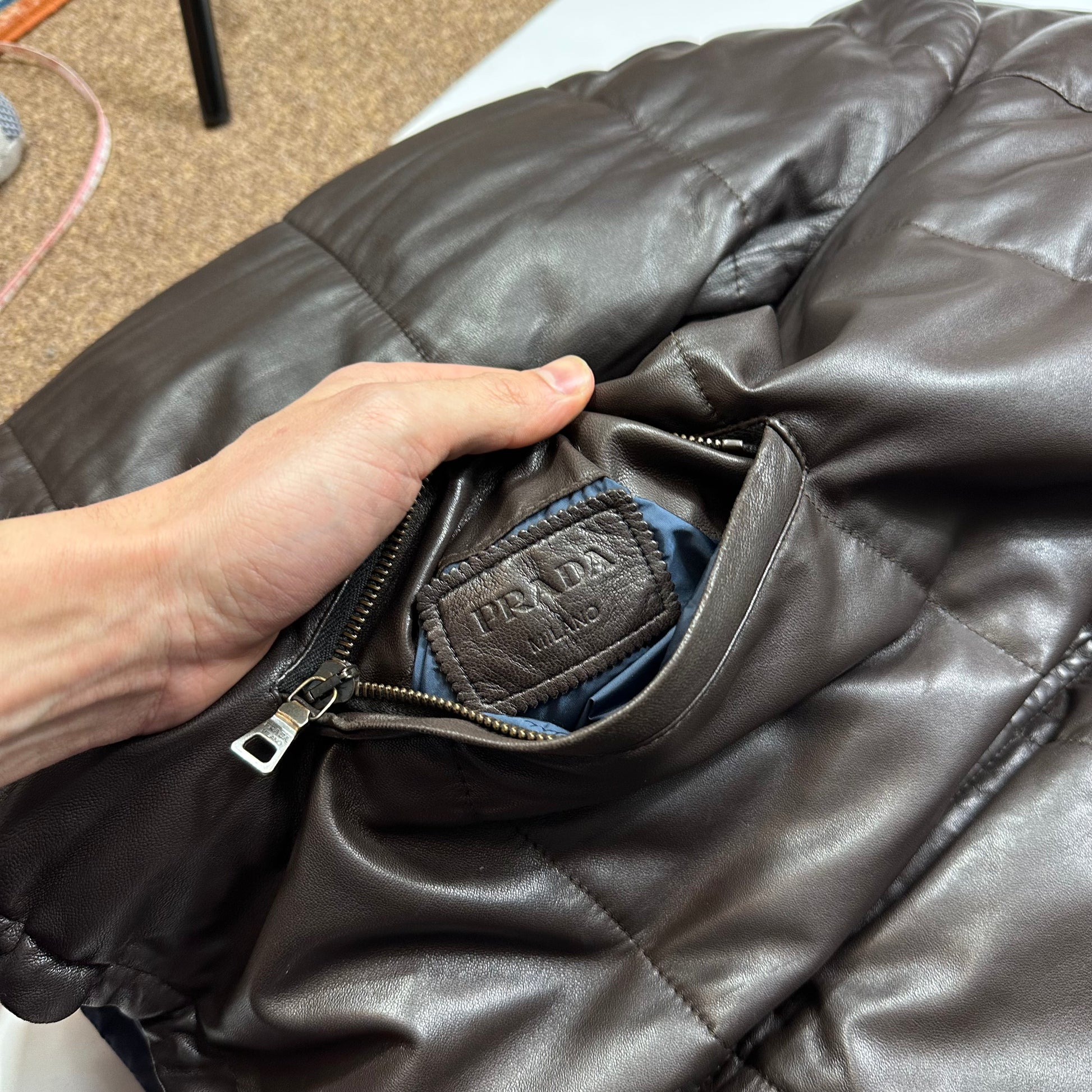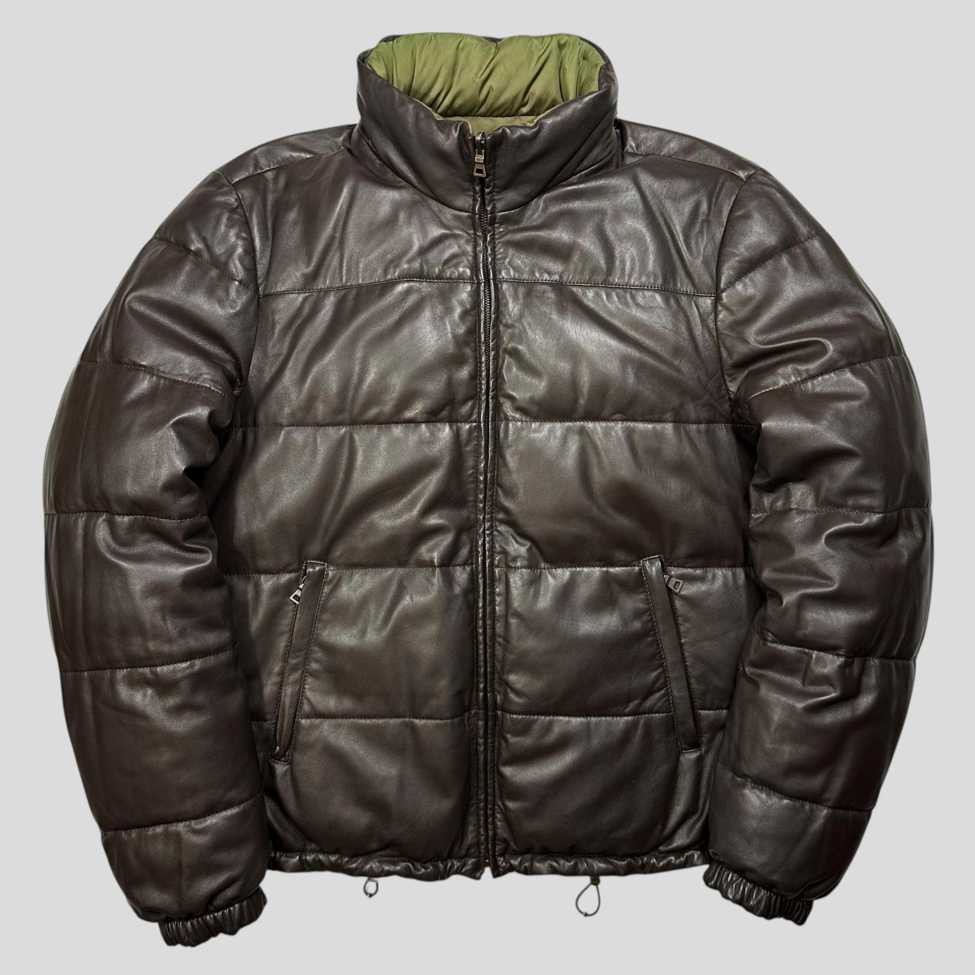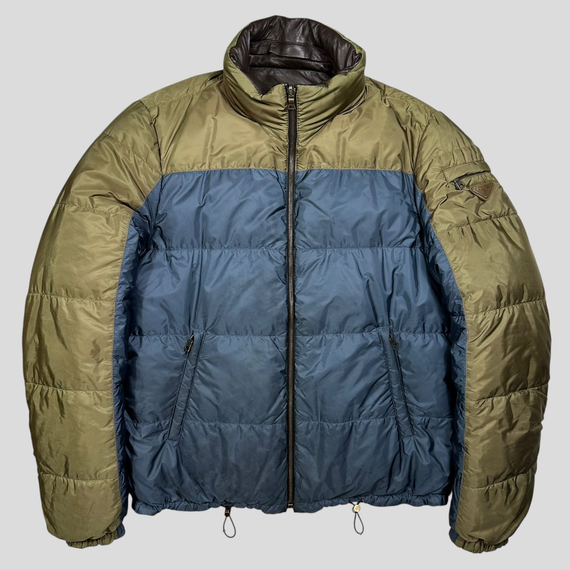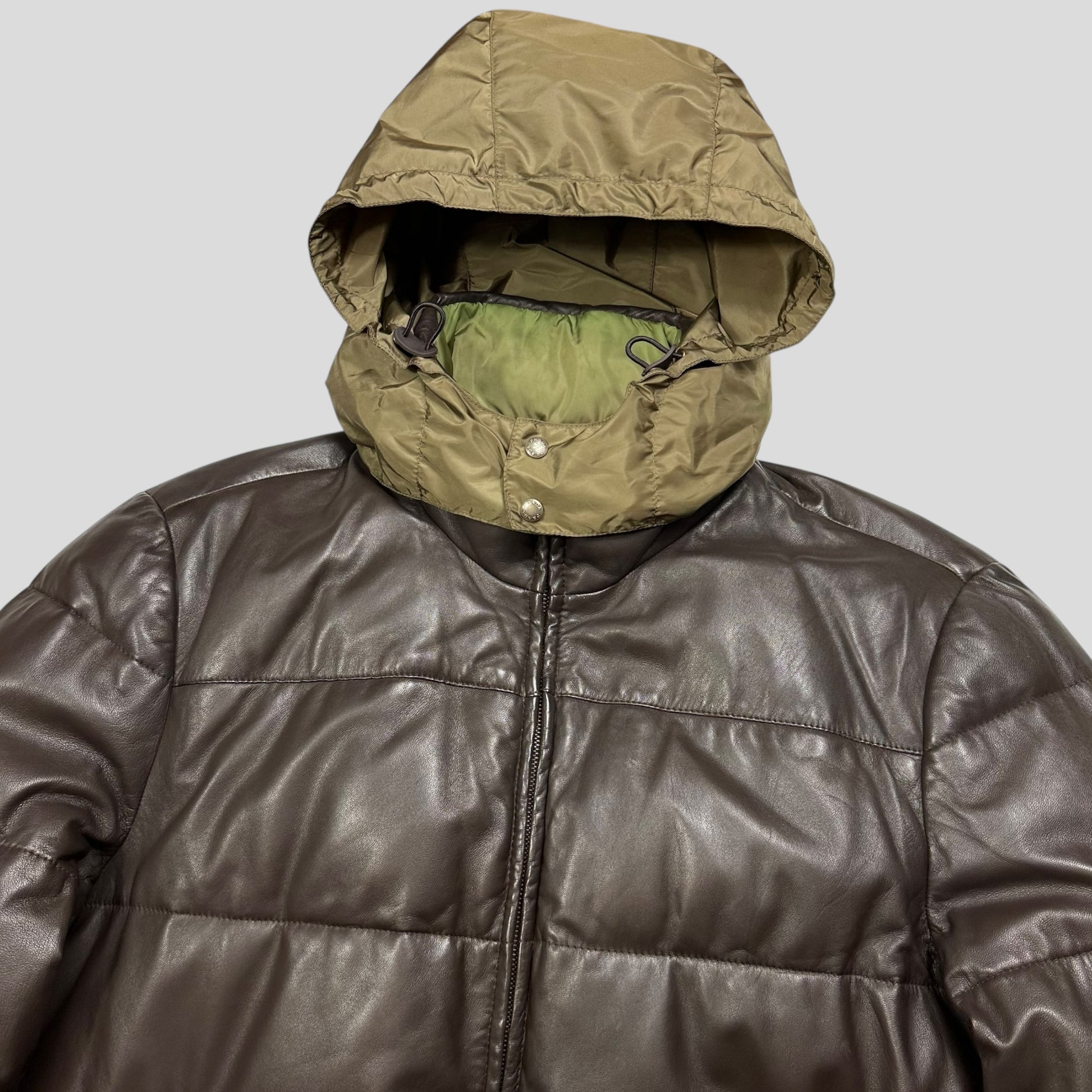 Extremely rare Prada Milano 2012 mainline supple brown lambskin leather down filled puffer jacket, beautifully soft brown leather with a packable khaki nylon hood, jacket reverses into a bi-colour green and blue nylon side with the iconic triangle plaque logo to the sleeve pocket.