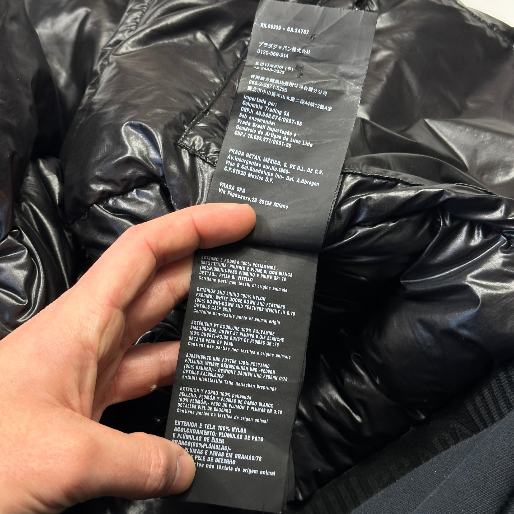 Super puffy warm white goose down-fill, TAT metal Prada branded zippers, micro square ripstop, rare branded Prada monogram elasticated waist inside.