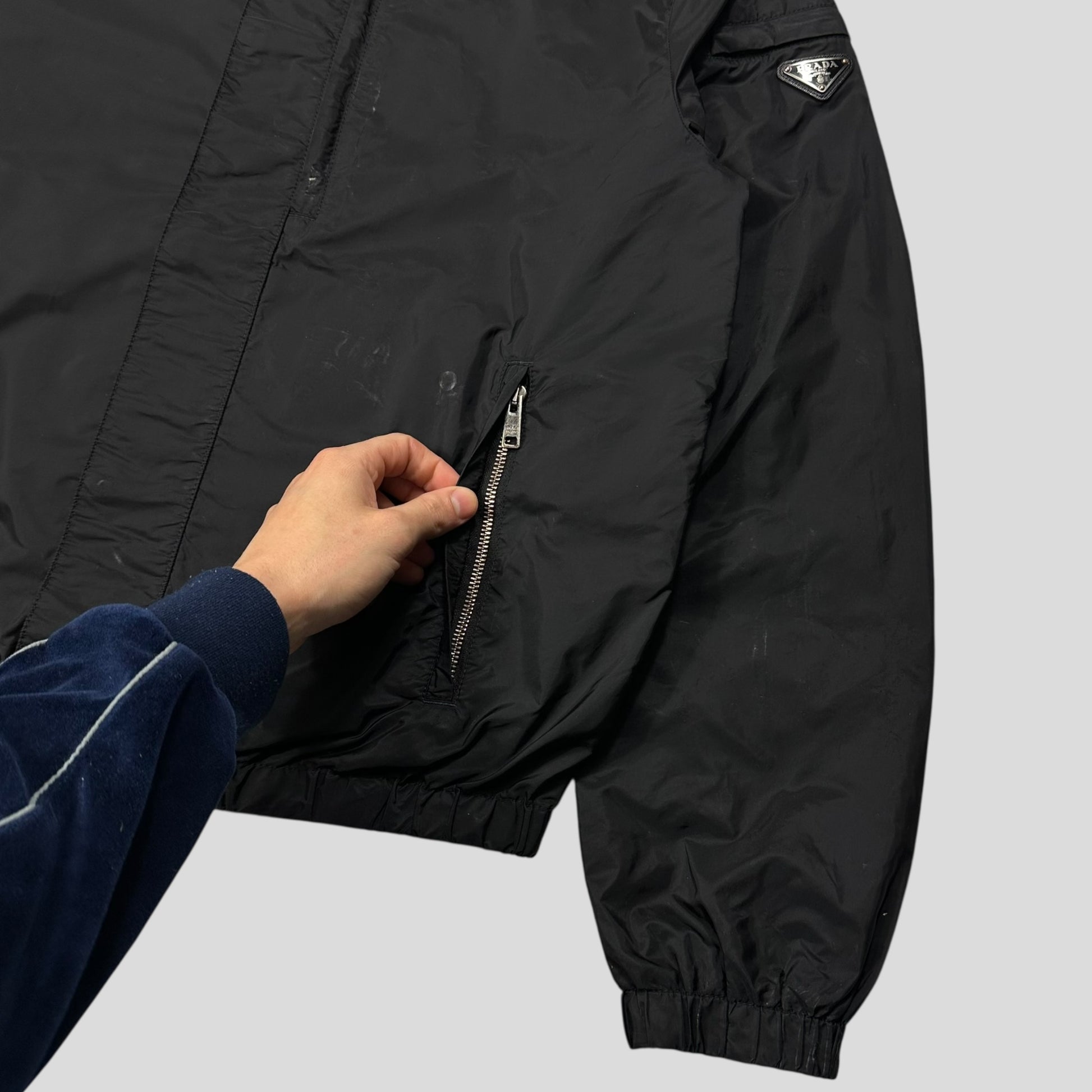 Prada Milano 2017 mainline Nero black k-way windbreaker jacket, triangle plaque logo to sleeve pocket, inside and outside pockets, lovely lightweight piece.