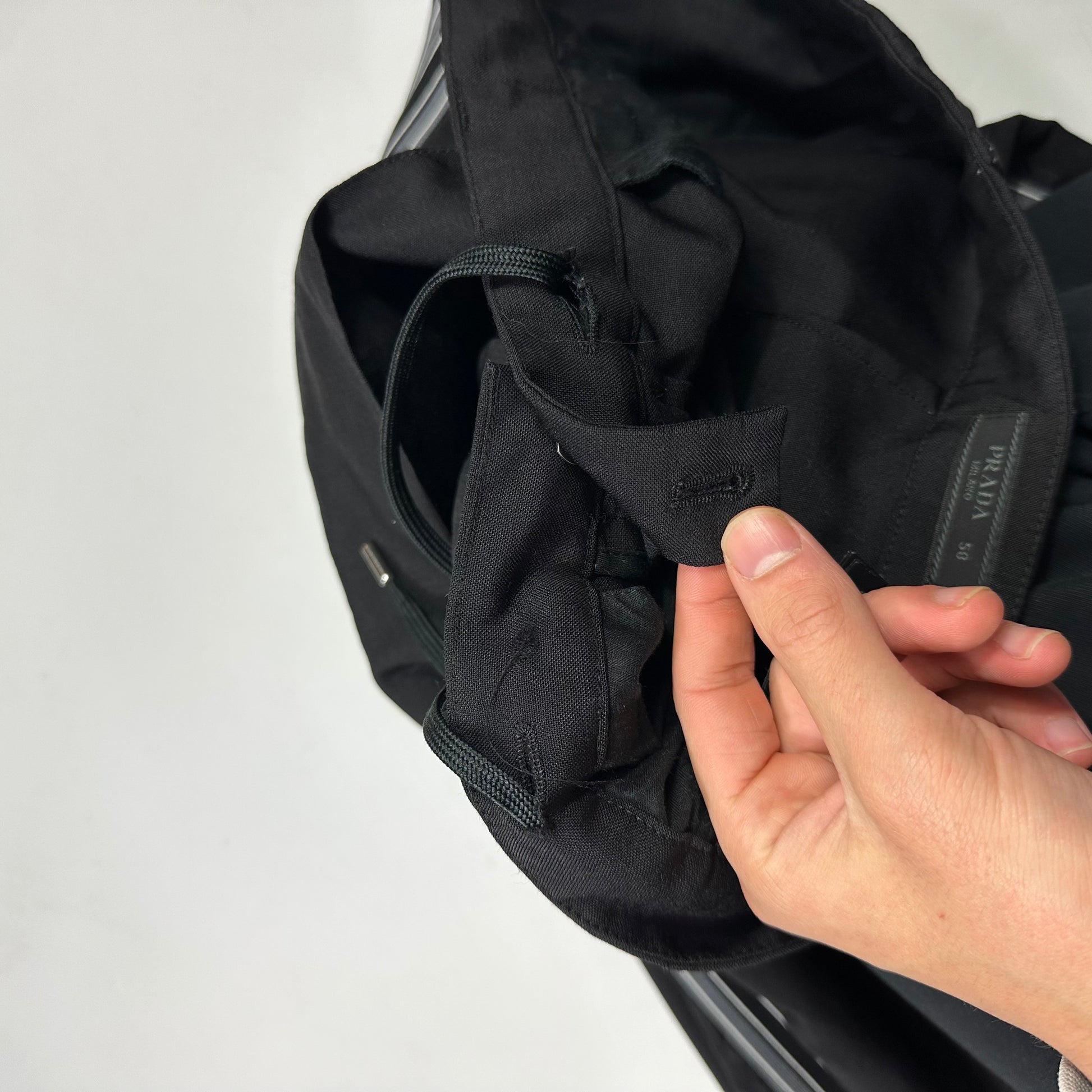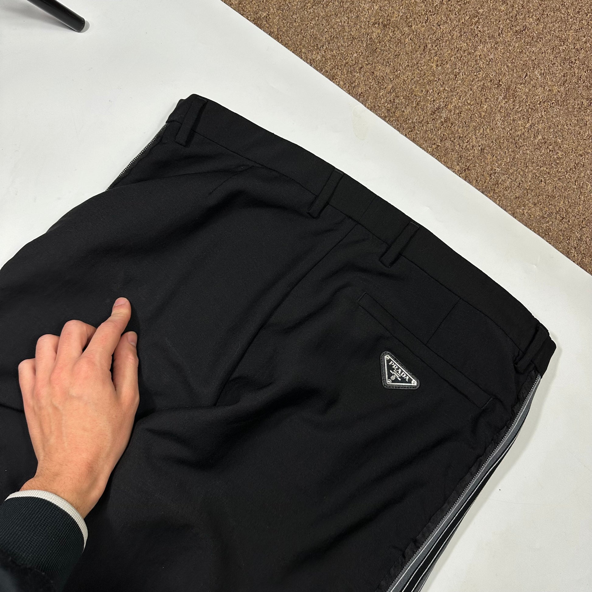 Iconic Prada triangle badge to back zip pocket, lovely silk stripe detailing down each leg, can zip open to be worn as flares, constructed from 60% mohair and 40% wool and made in Italy these ooze quality.