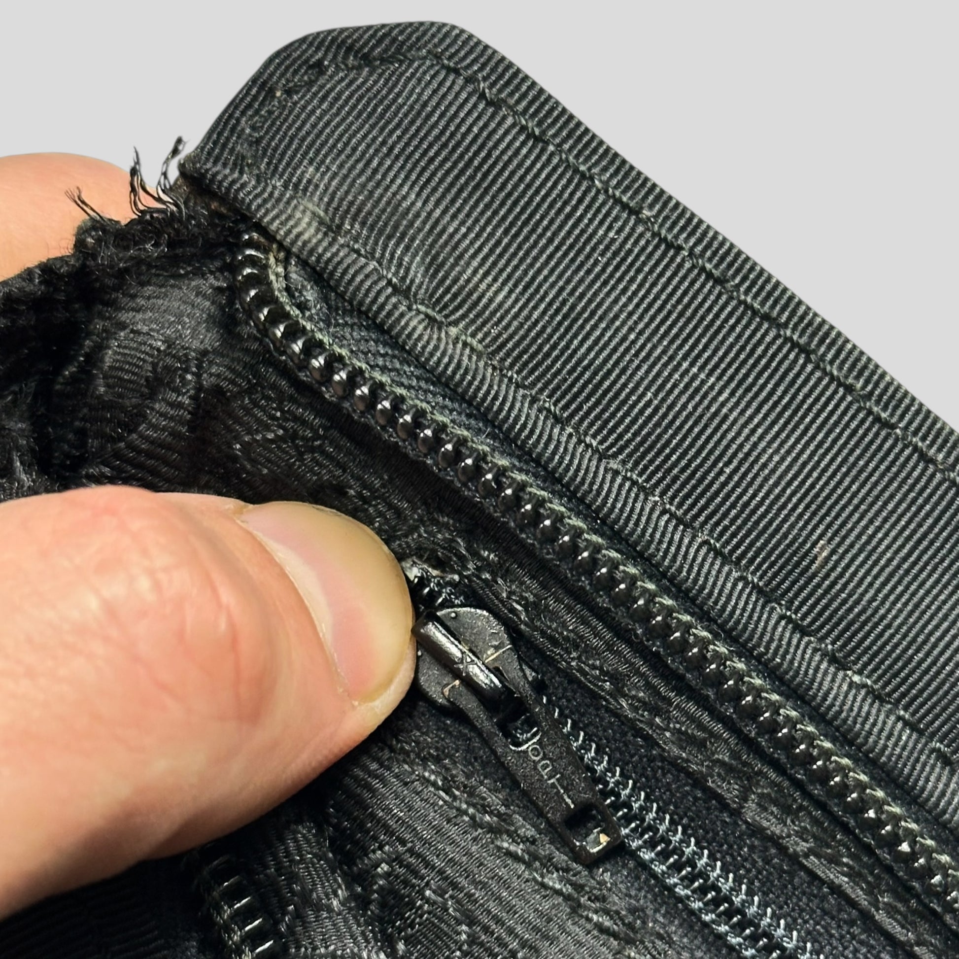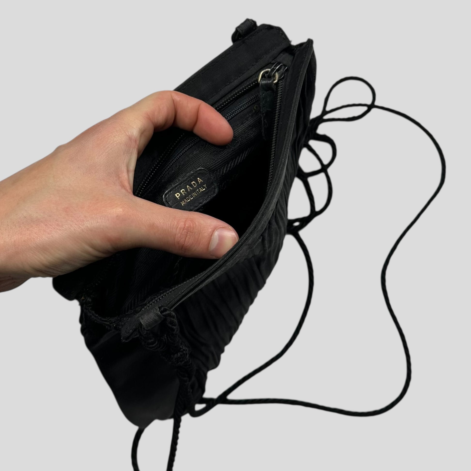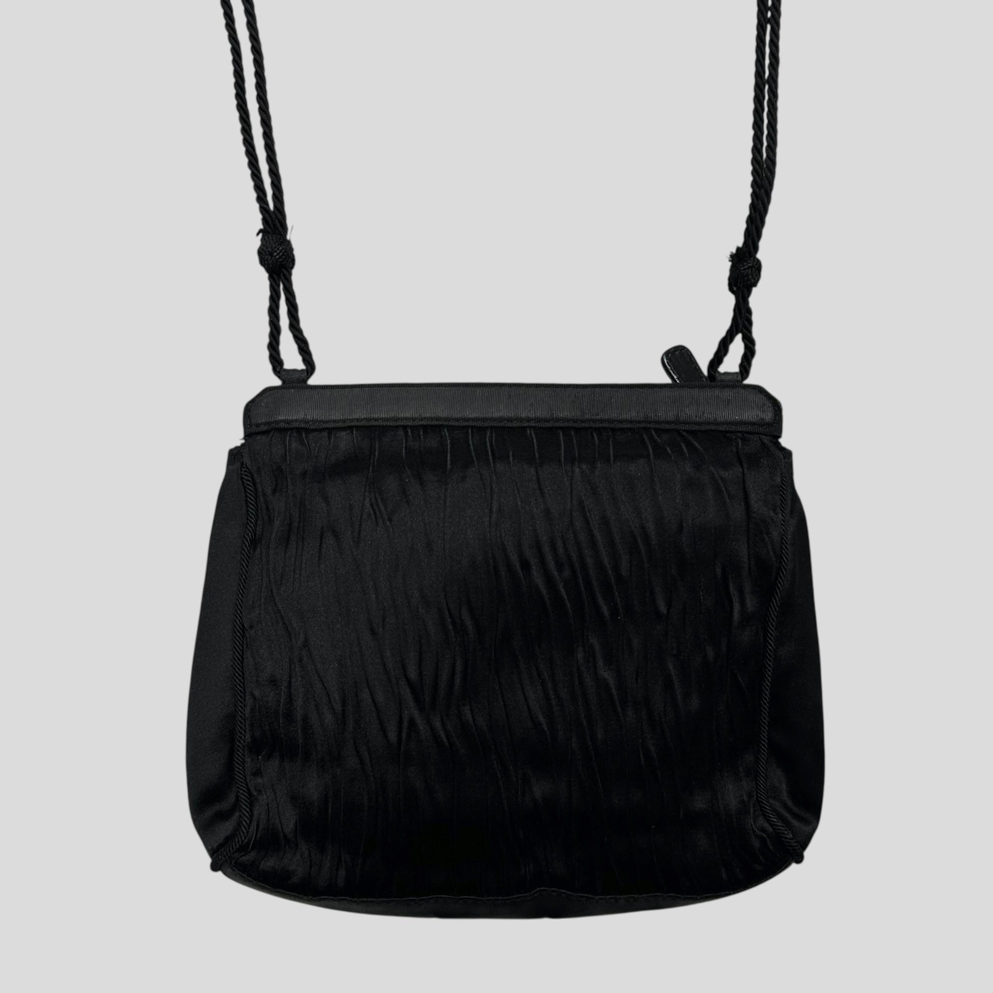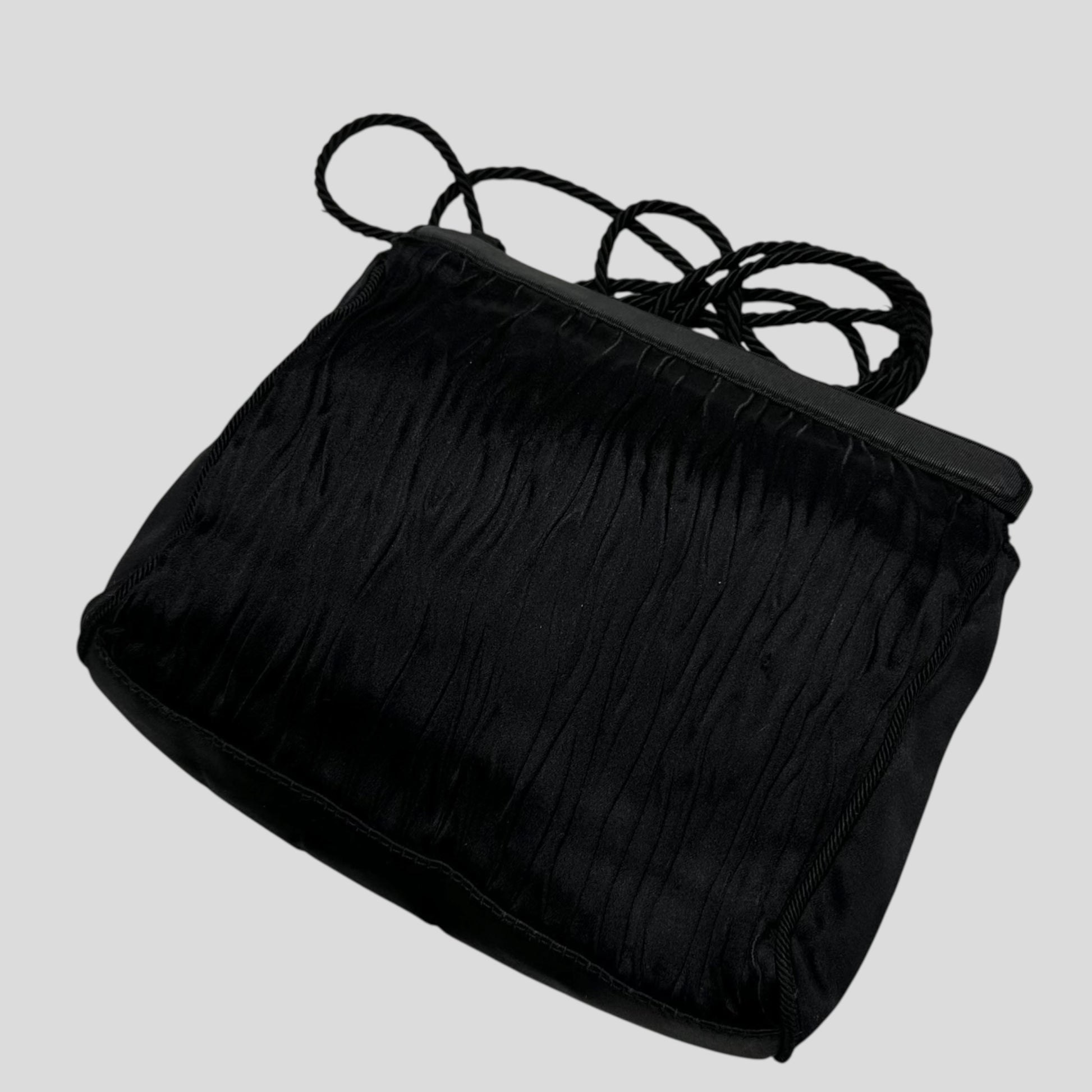 Cute and chic 1990’s Prada mainline crossbody velvet velour textured black purse bag, 3D zebra type stripes in all black, two zip compartments for storage, rope style strap.