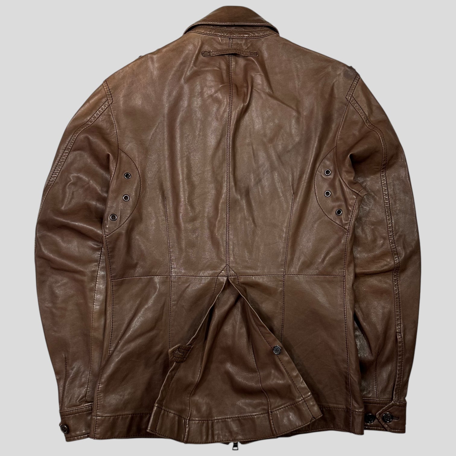 Rare early 2000’s tobacco brown Prada Sport leather jacket, unique military detailing throughout the entire jacket, modular neck that can be strapped up for wind cover and a button up modular tail to allow more flexibility when sitting down / riding motorbikes etc.