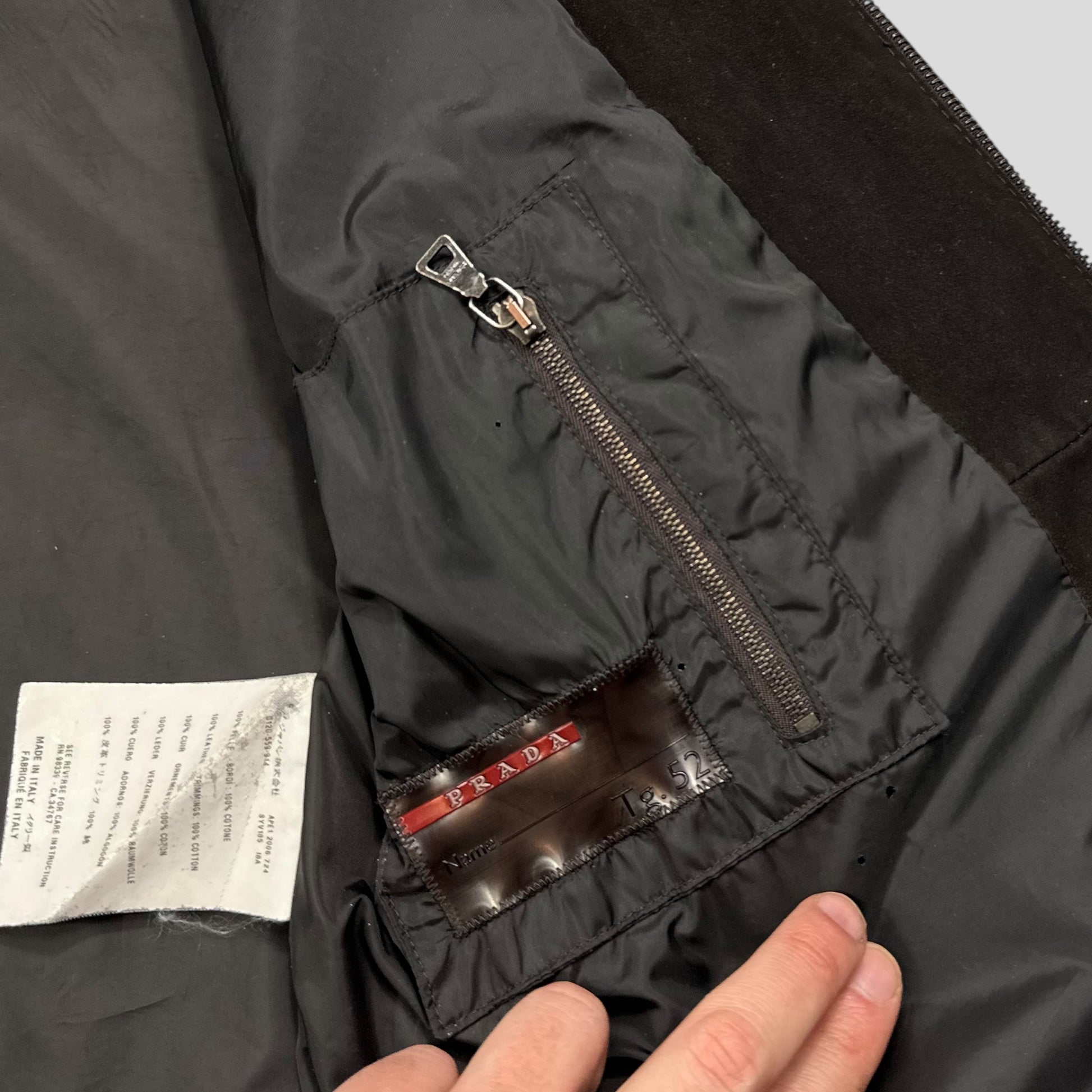 Extremely rare Prada Sport fall winter 2006 brown suede leather jacket, western cowboy style Harrington with a beautiful boxy fit, embossed western style logo to arm, leather logo tab to hip and zip at the collared neck, incredible perforated semi transparent leather mesh to chest and back, pointed panels adding to that cowboy feel.