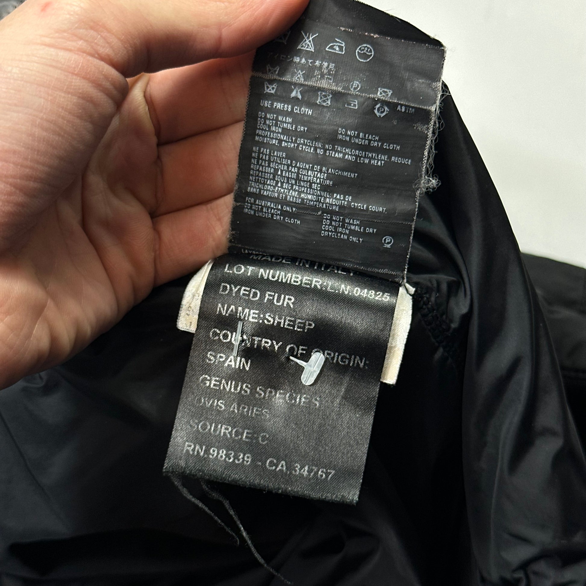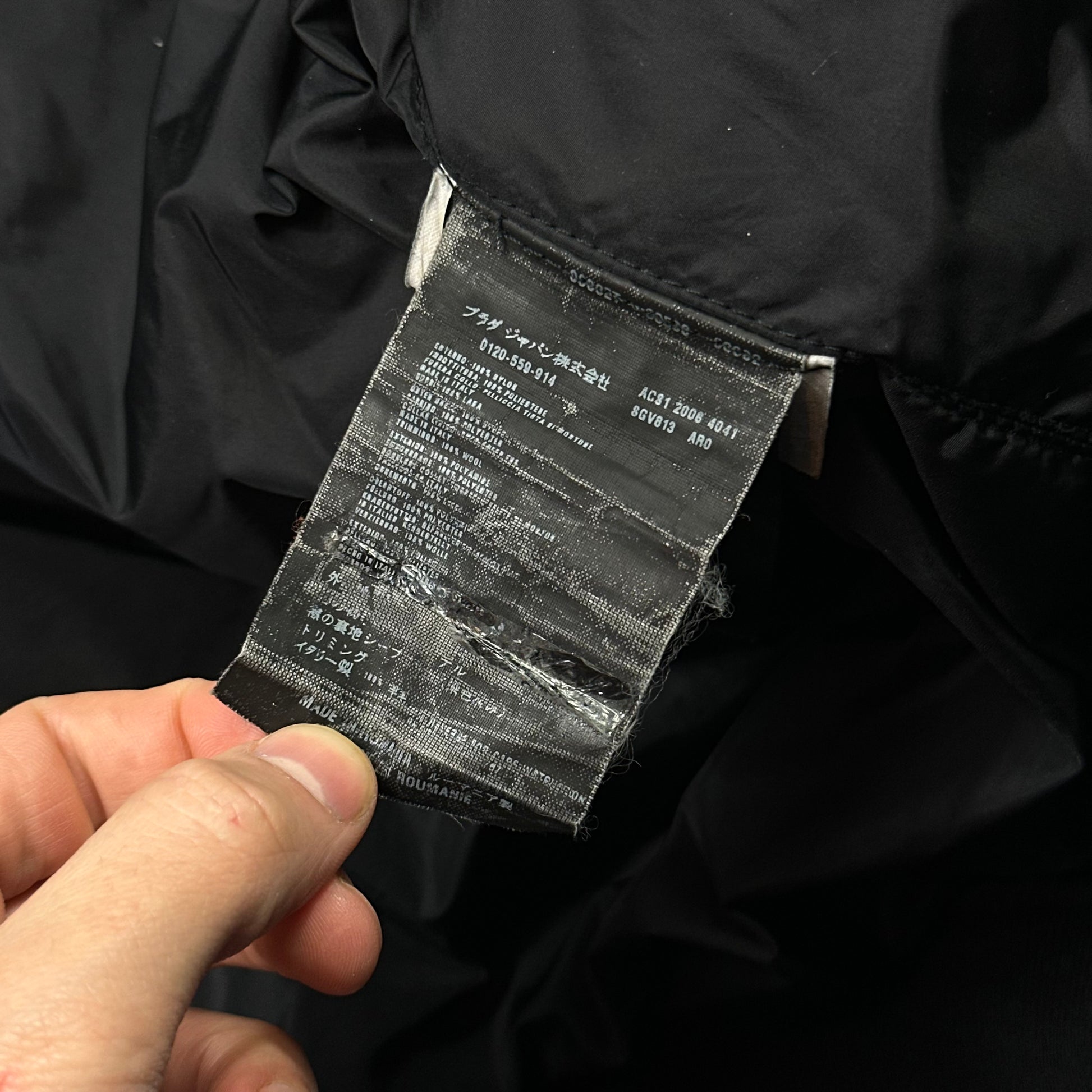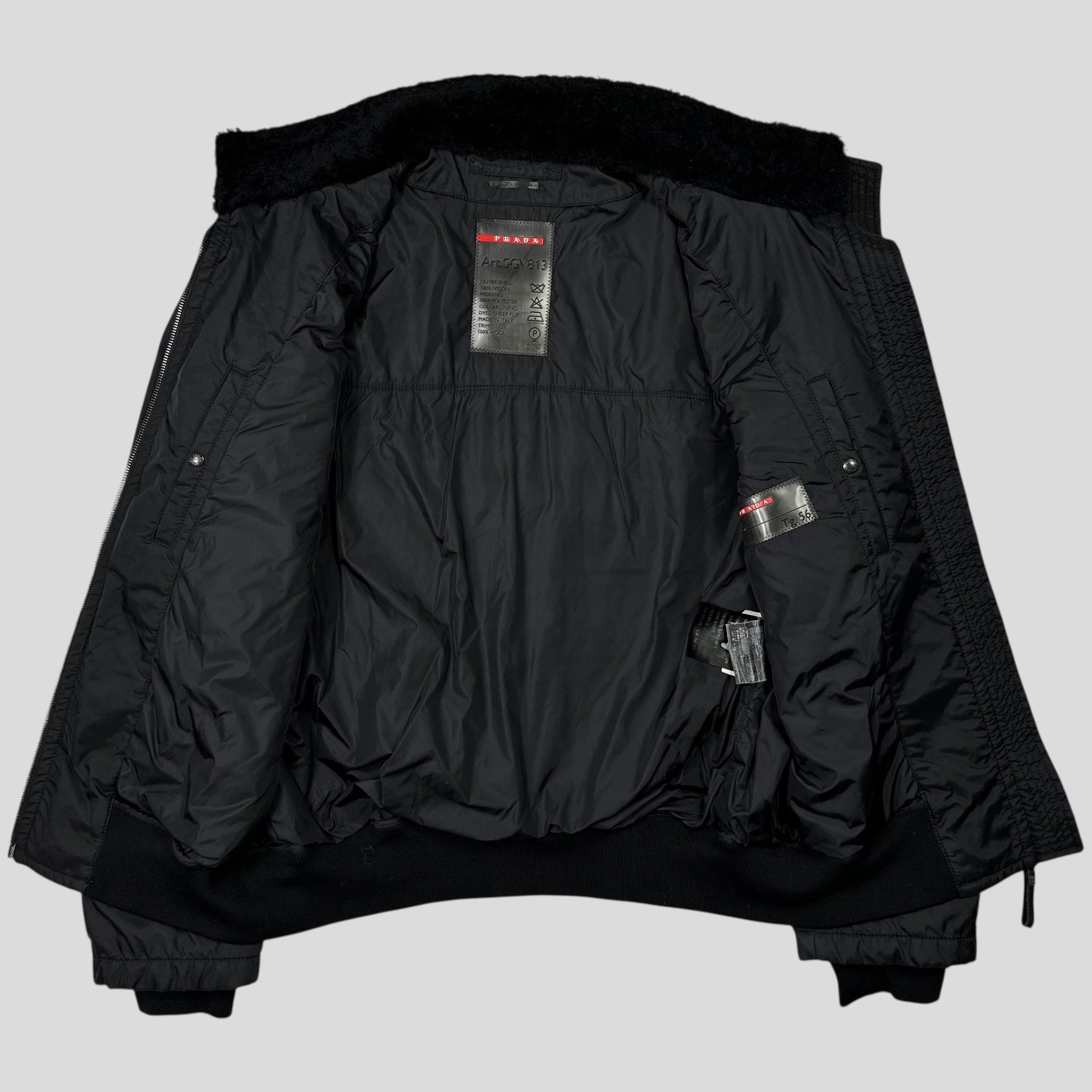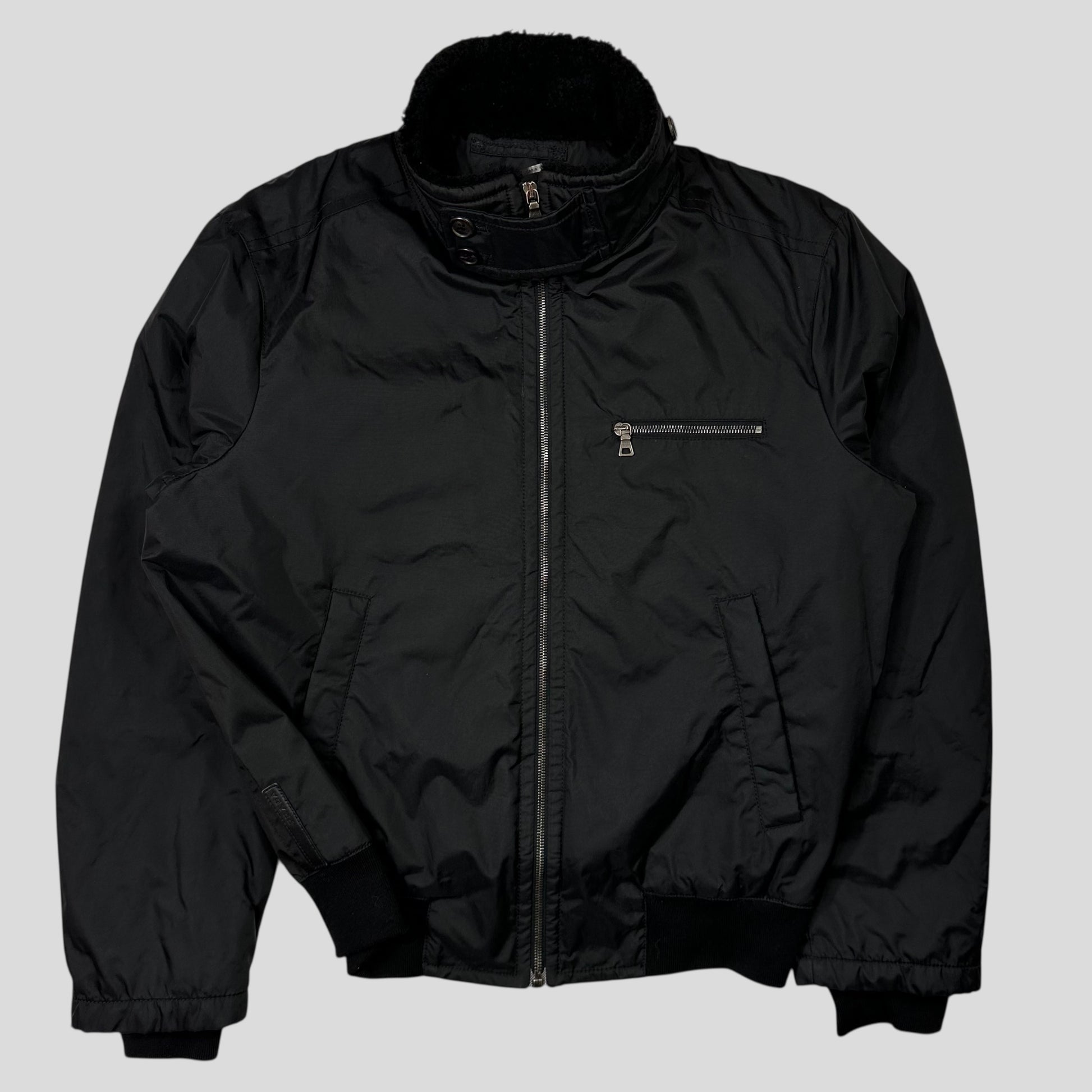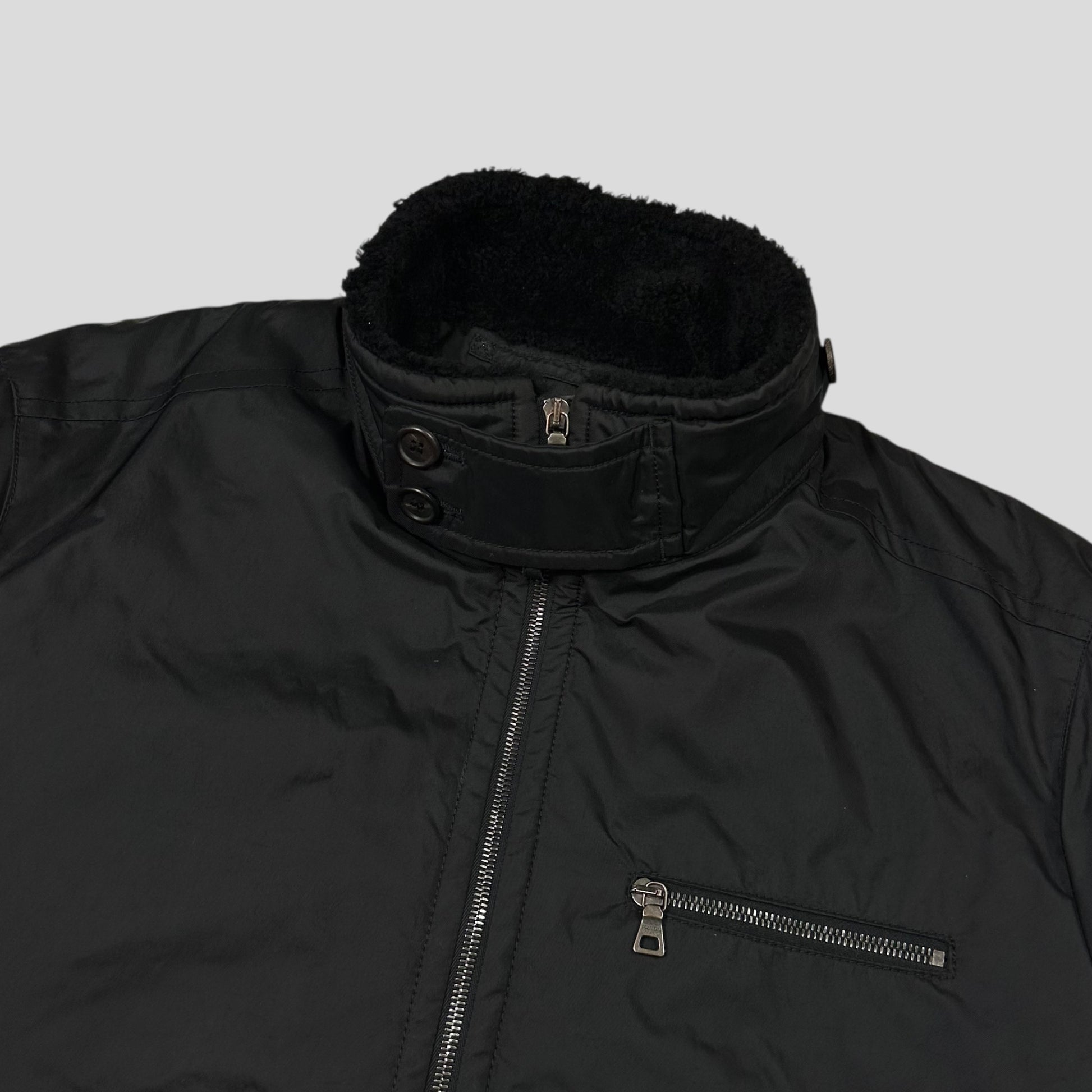 Beautiful and rare Nero black Prada Sport 2006 Giubbuto Nylon Lucido Uomo jacket, high end piece constructed from extra rough canvas nylon similar to Stone island formula steel, real sheep fur shearling collar and leather logo tab to hip and zip pull, warm padded jacket, bomber flight style with panelled back and button up neck strap for wind cover.