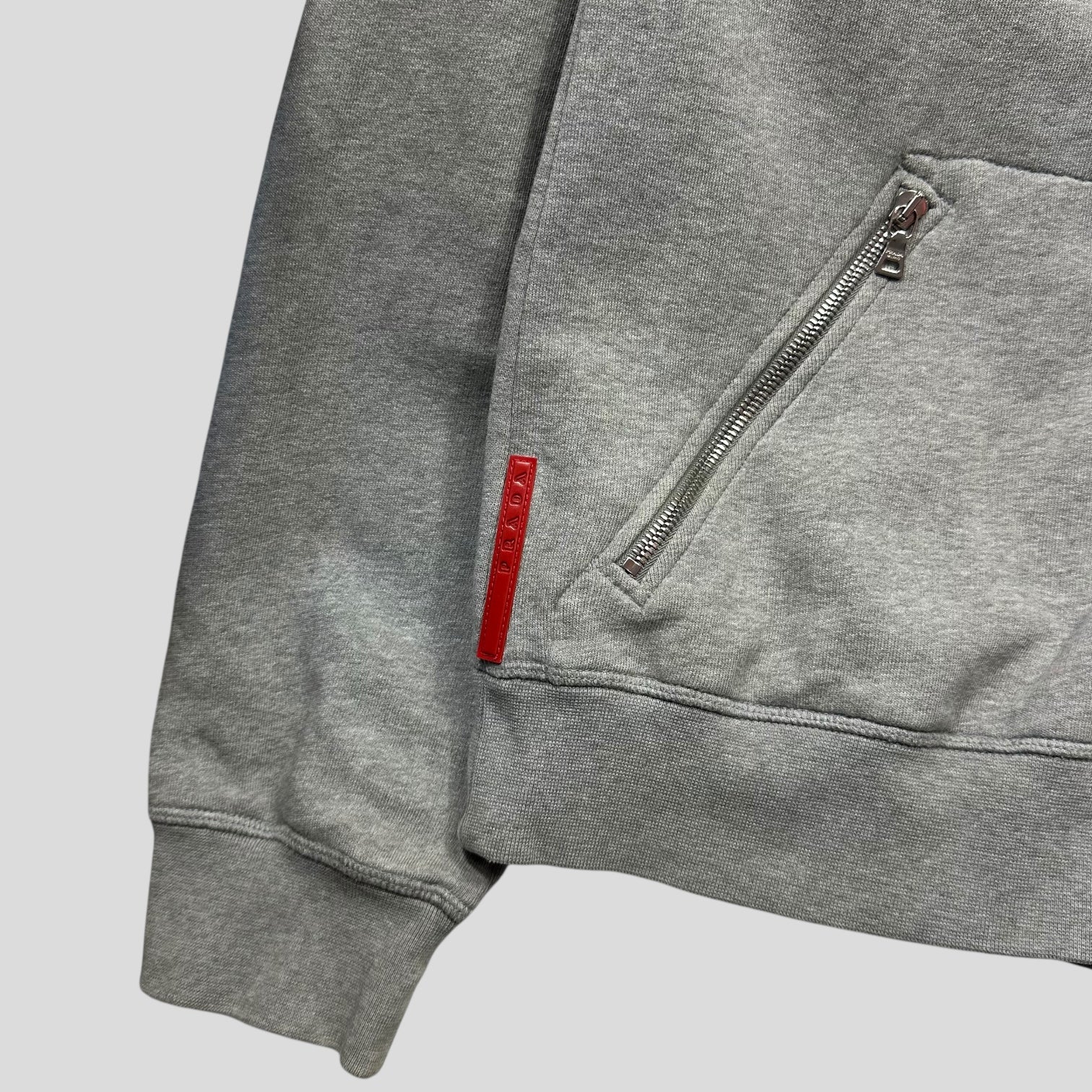 Rare 2007 Grey cotton zip up Prada Sport hoodie with silver grey nylon hood, zip pockets, Prada metal RIRI zippers and a red logo tab at the hip.