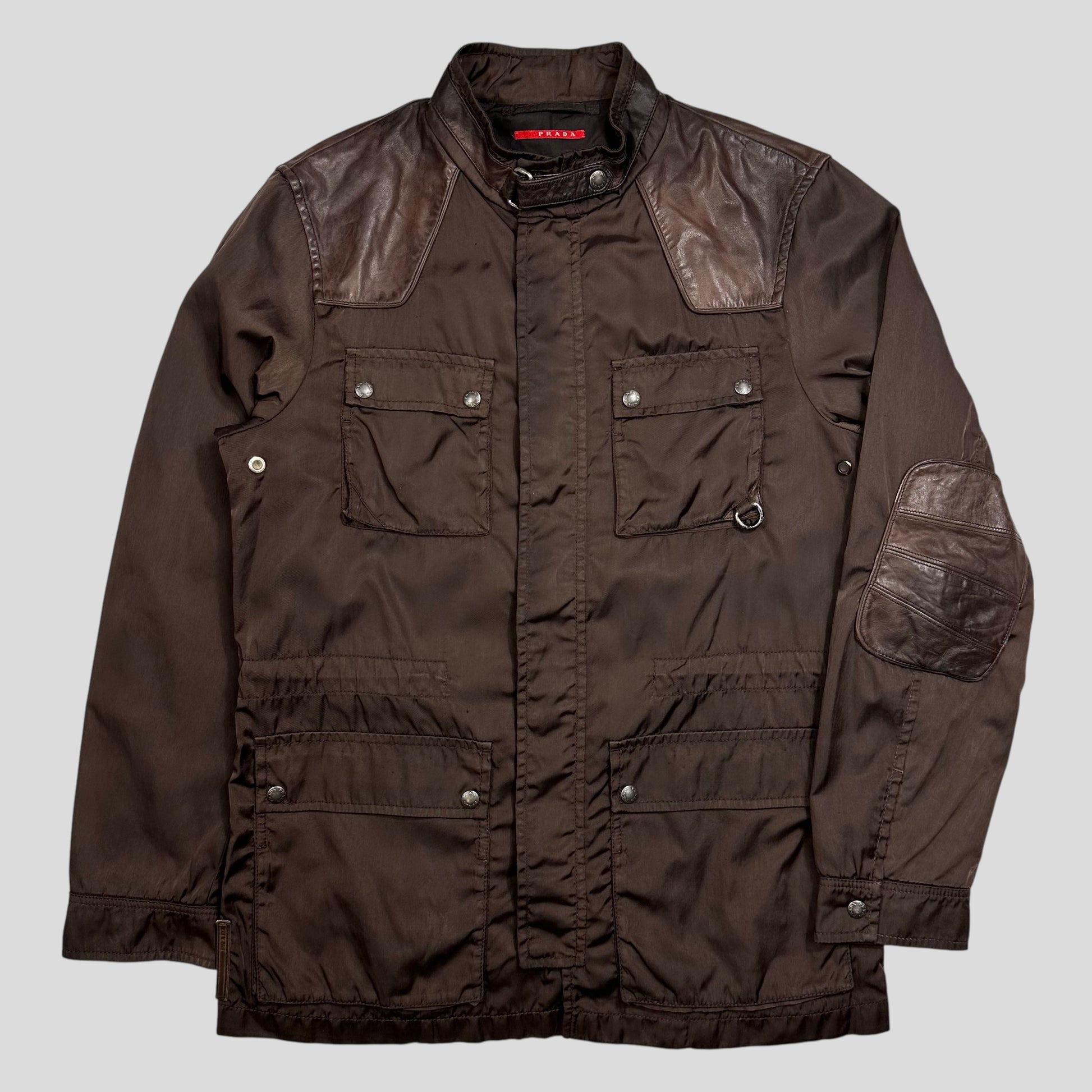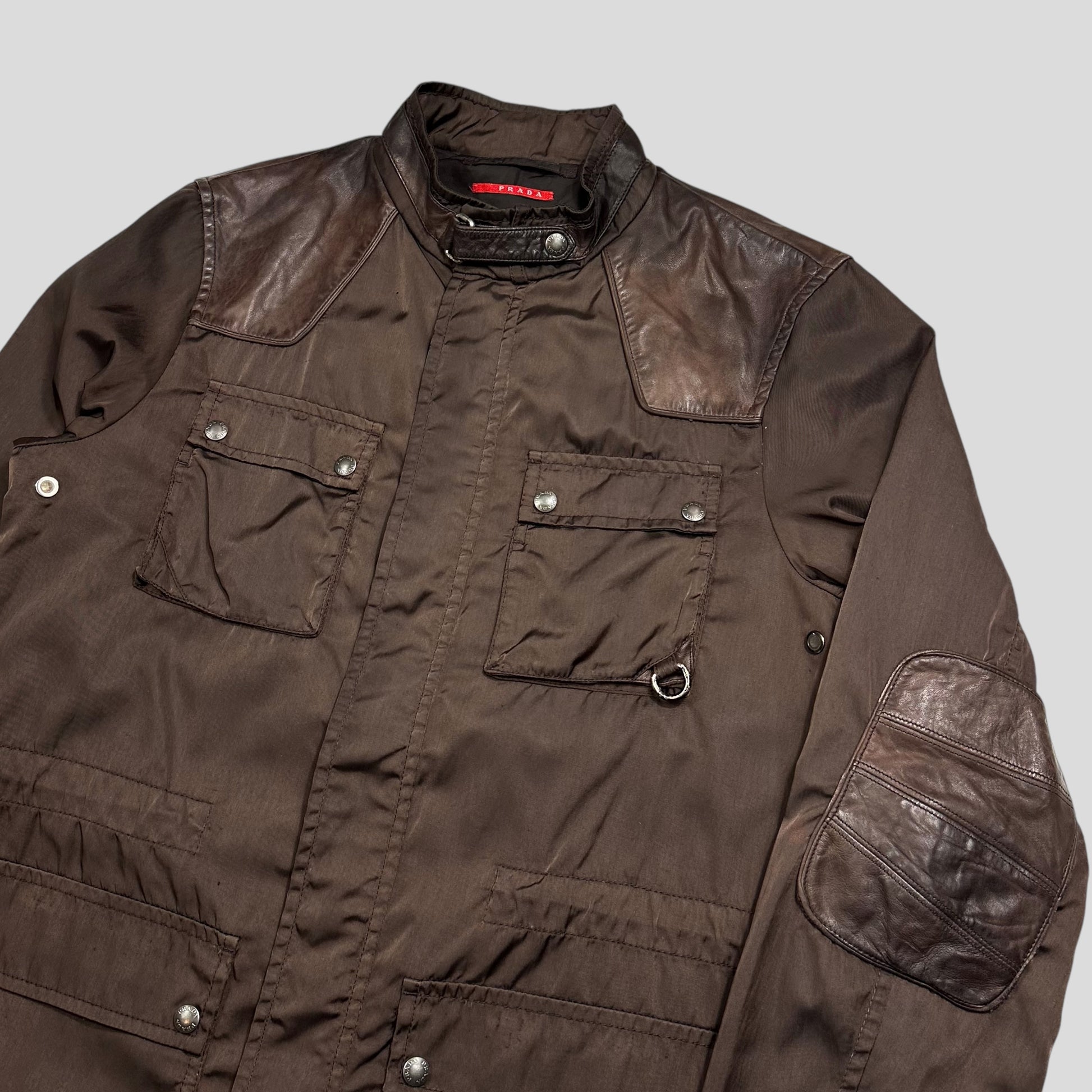 Rare 2008 Prada Sport brown canvas nylon military field jacket, leather panelled elbows chest and back, D-ring pocket, leather logo tab to left hip, made in Italy, superb quality.
