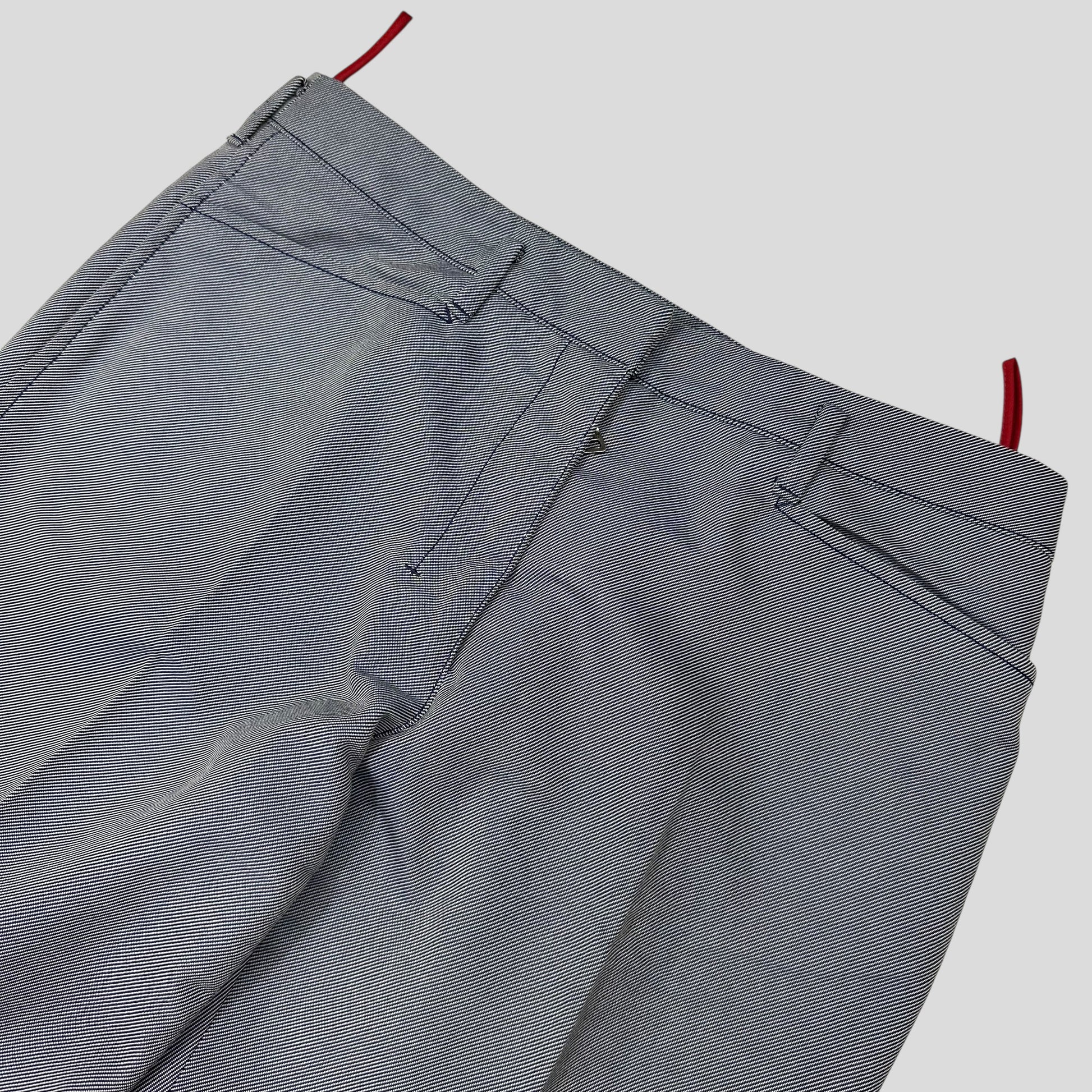 Rare Prada Sport autumn winter 2000 textured cotton poly mix trousers, unique material blending a two tone grey and black which creates an almost light blue blue denim colour to the eye, red sport logo to the ankle.