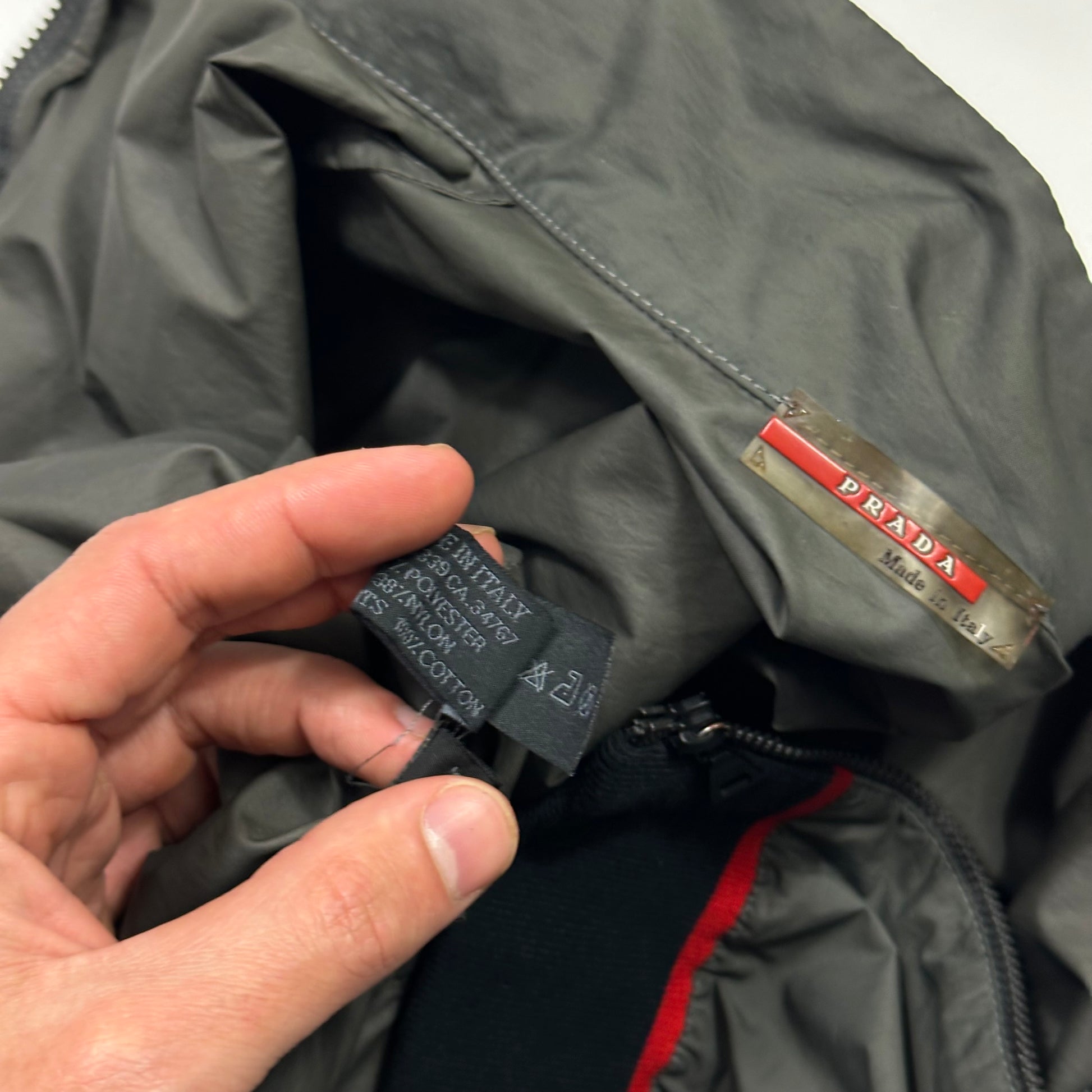 Very rare spring summer 2000 Prada Sport metal grey nylon vest gilet jacket with cotton ribbed arm and hem, red Prada Sport logo tab at the hip, zip stash pocket at the rear with Red Prada zip pull.