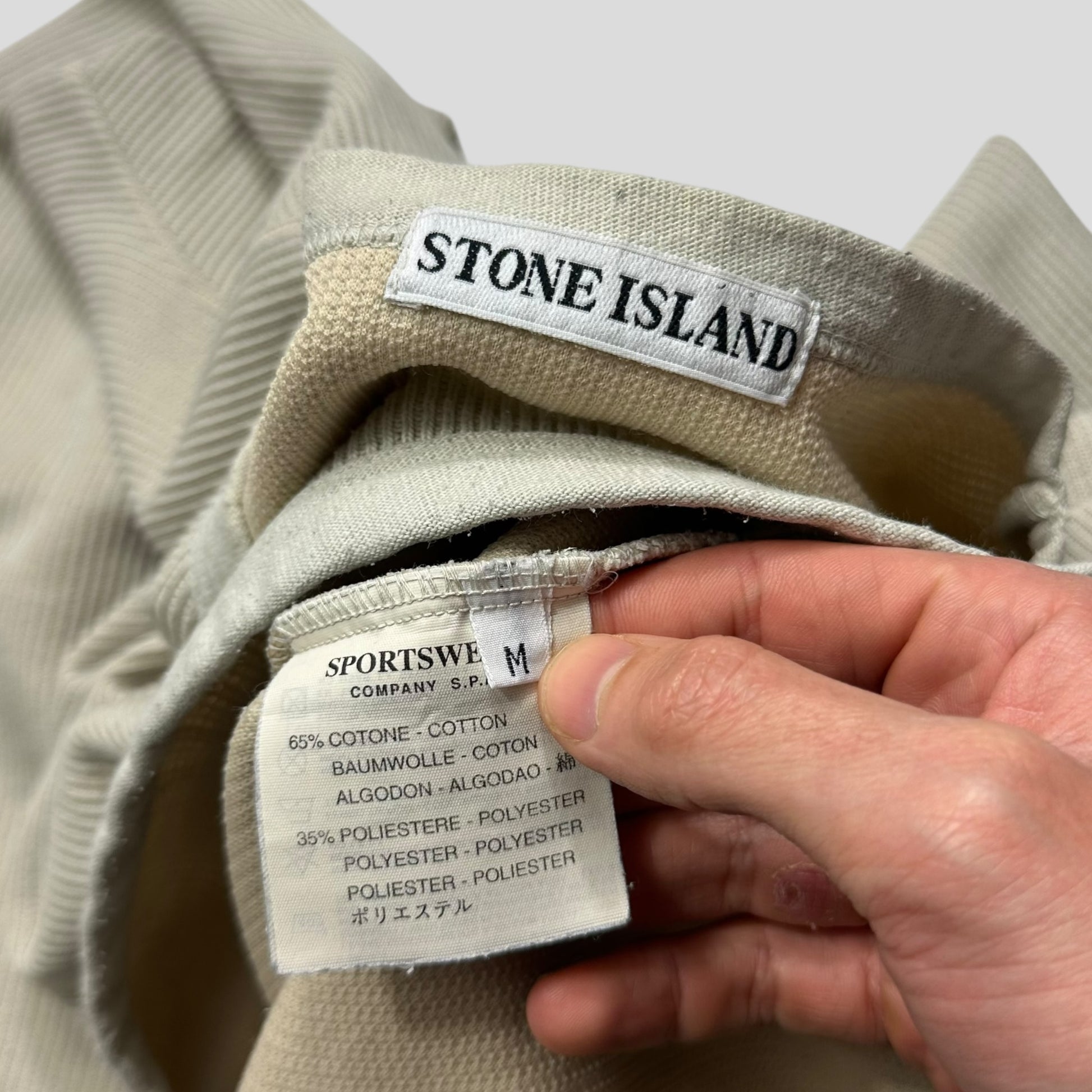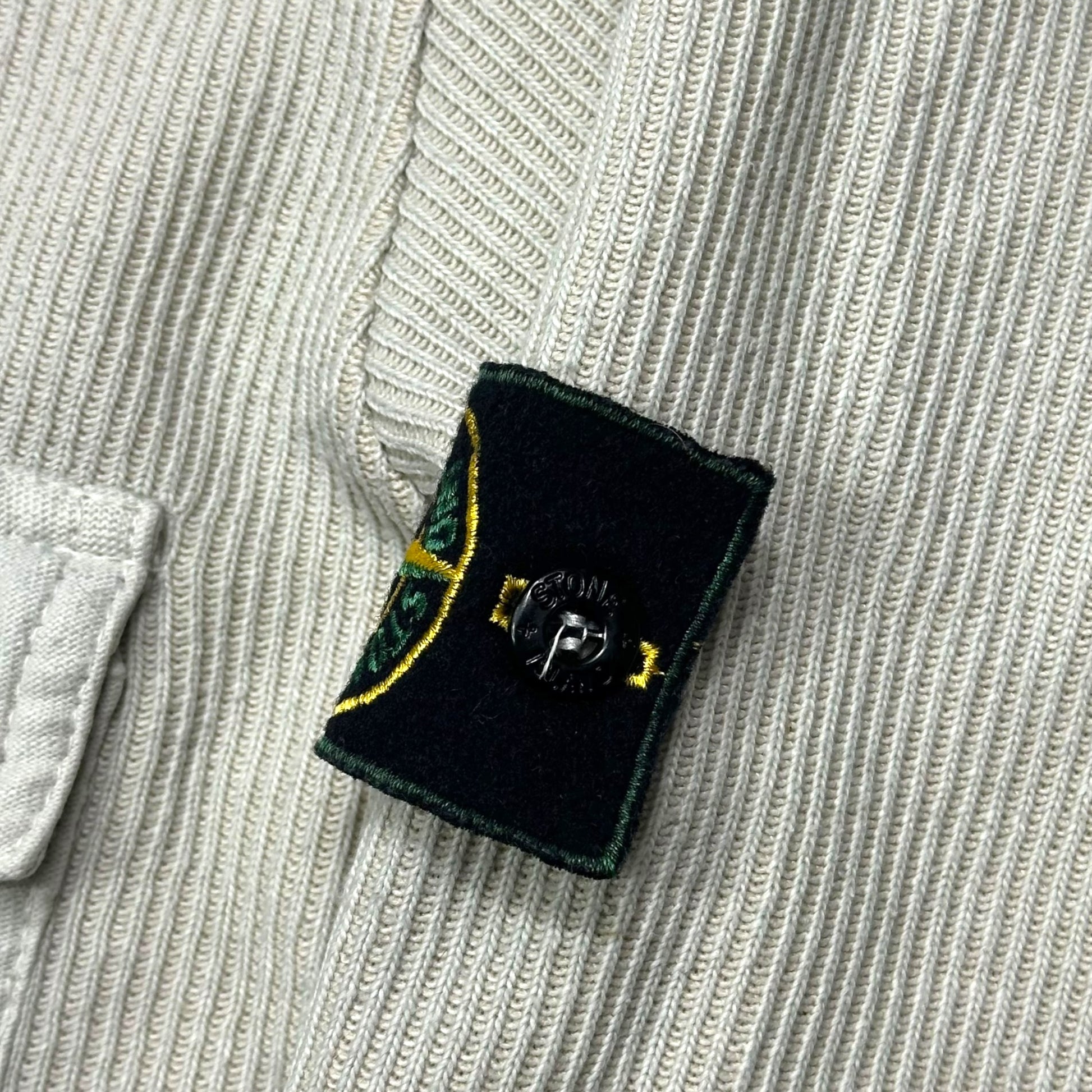 Very rare Stone Island dusty cream cotton ribbed sweatshirt jumper, one of the best they’ve done, round neck, velcro flap pocket to chest, green edge badge to arm.