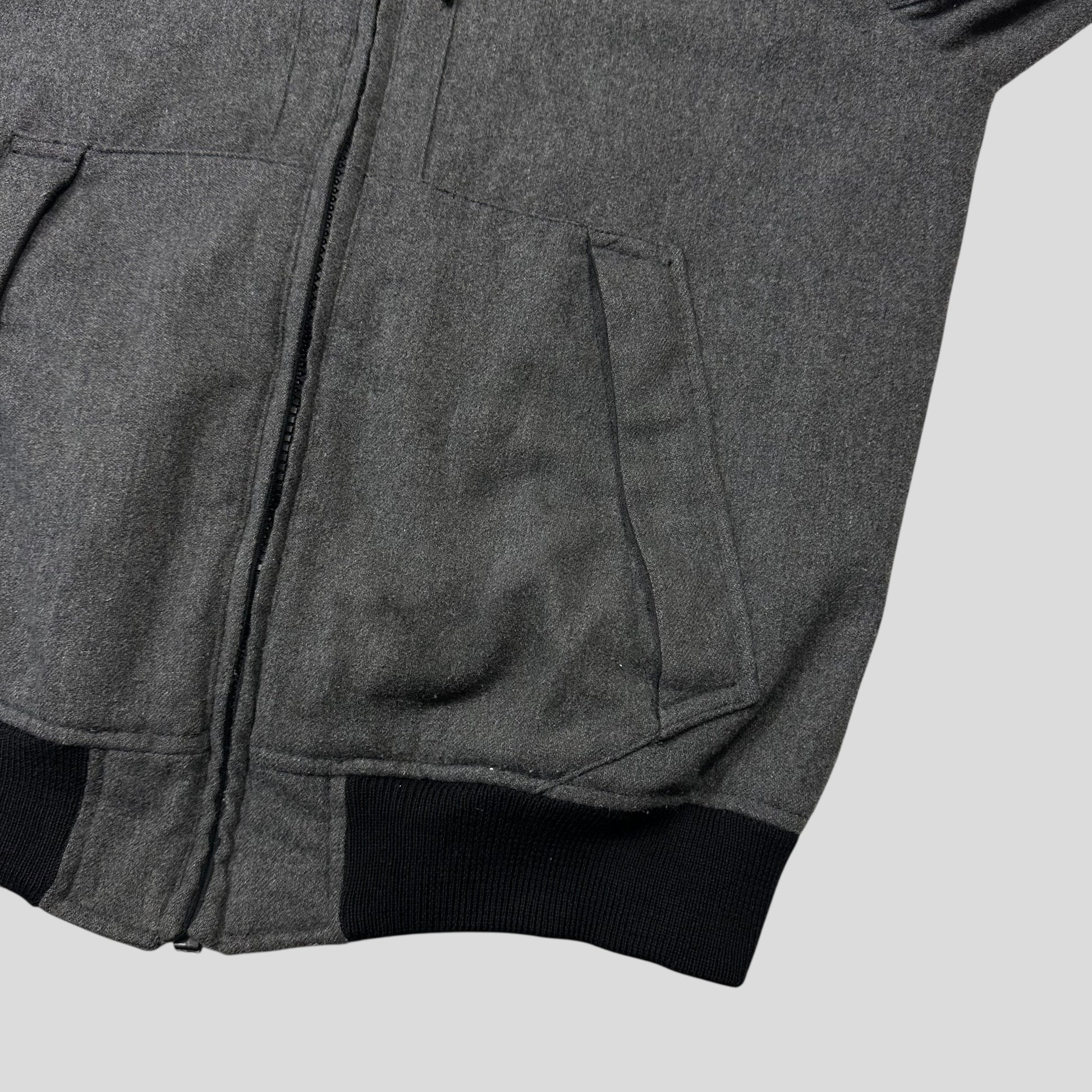 Rare autumn winter 2014 Grey melange wool poly jacket, unique speckled wool material that’s warm and cozy, double hood that allows the jacket to be worn two ways, the padded nylon hood insert creates a more comfortable environment and keeps your head extra warm.
