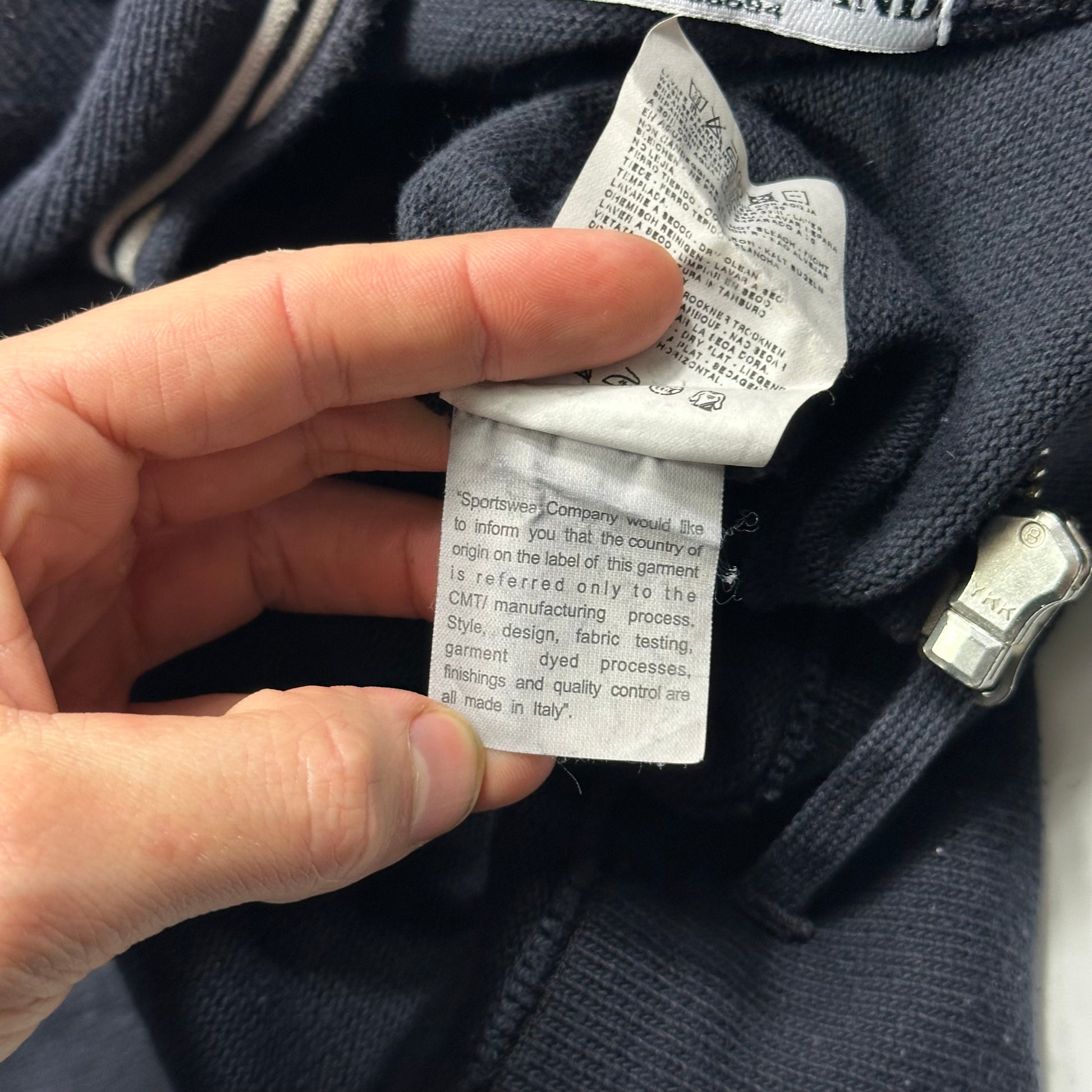 Stone Island spring summer 2007 garment dyed navy cotton cardigan jacket, nice medium weight piece, striped detailing to collar, badge to sleeve, exposed metal YKK zipper.
