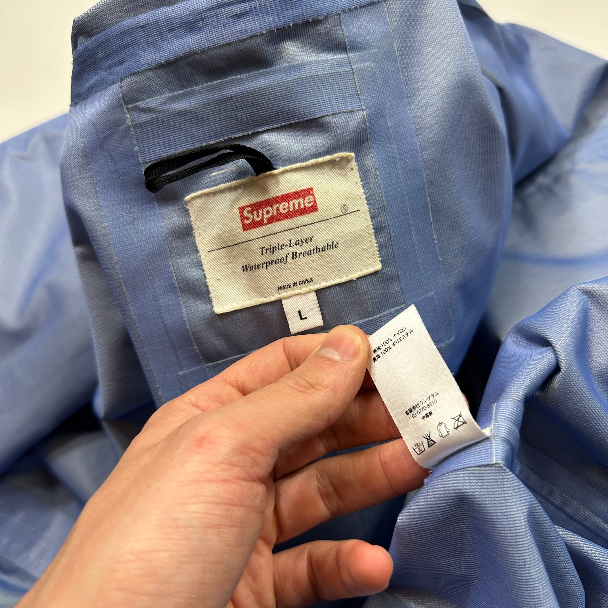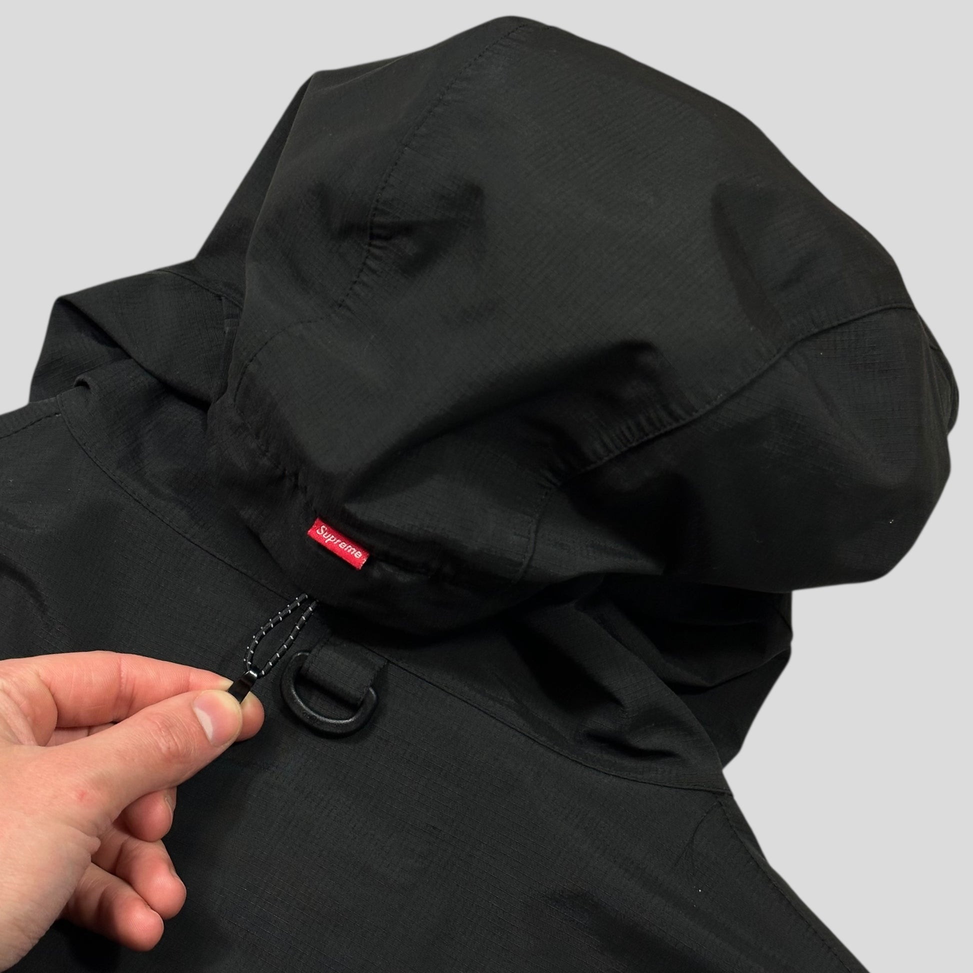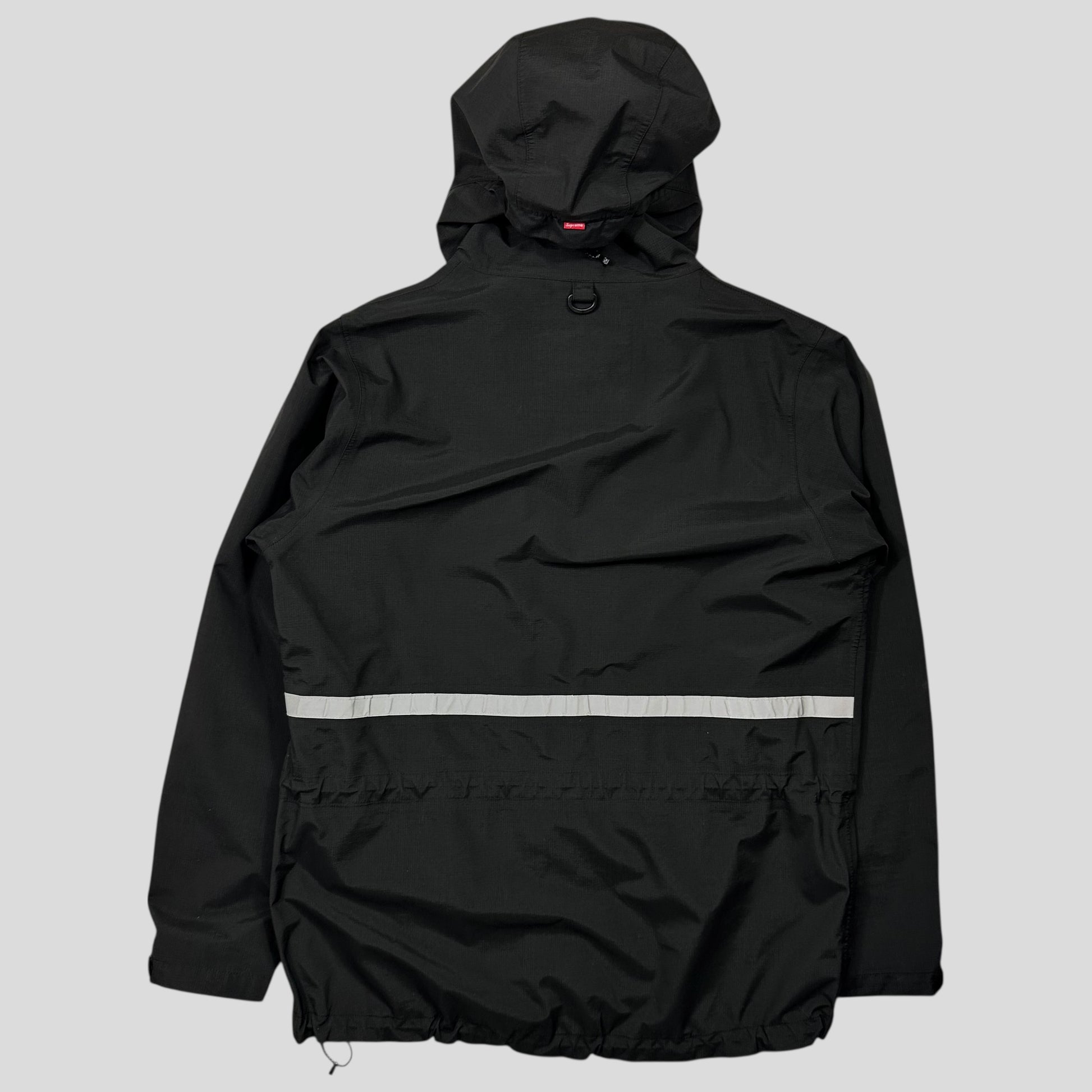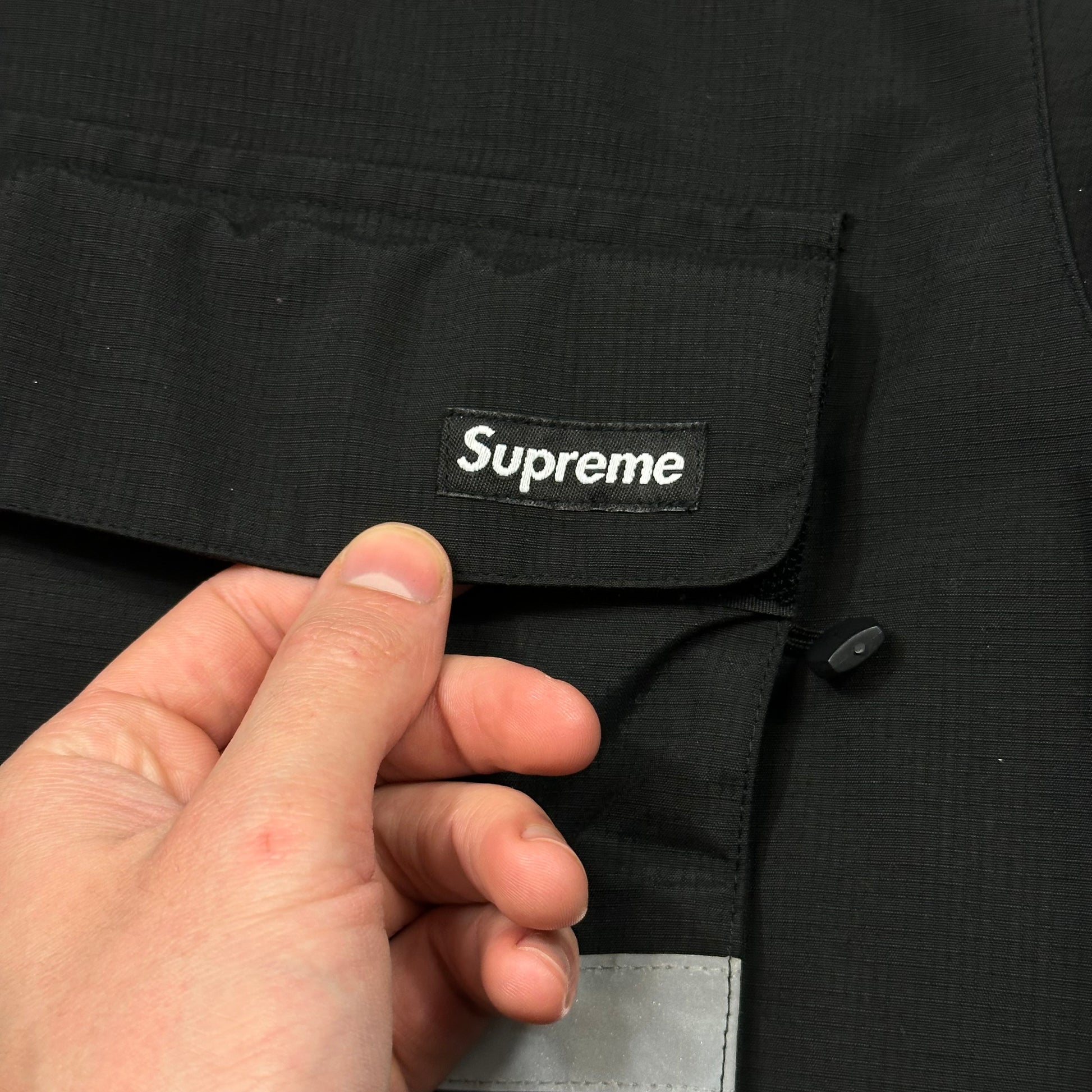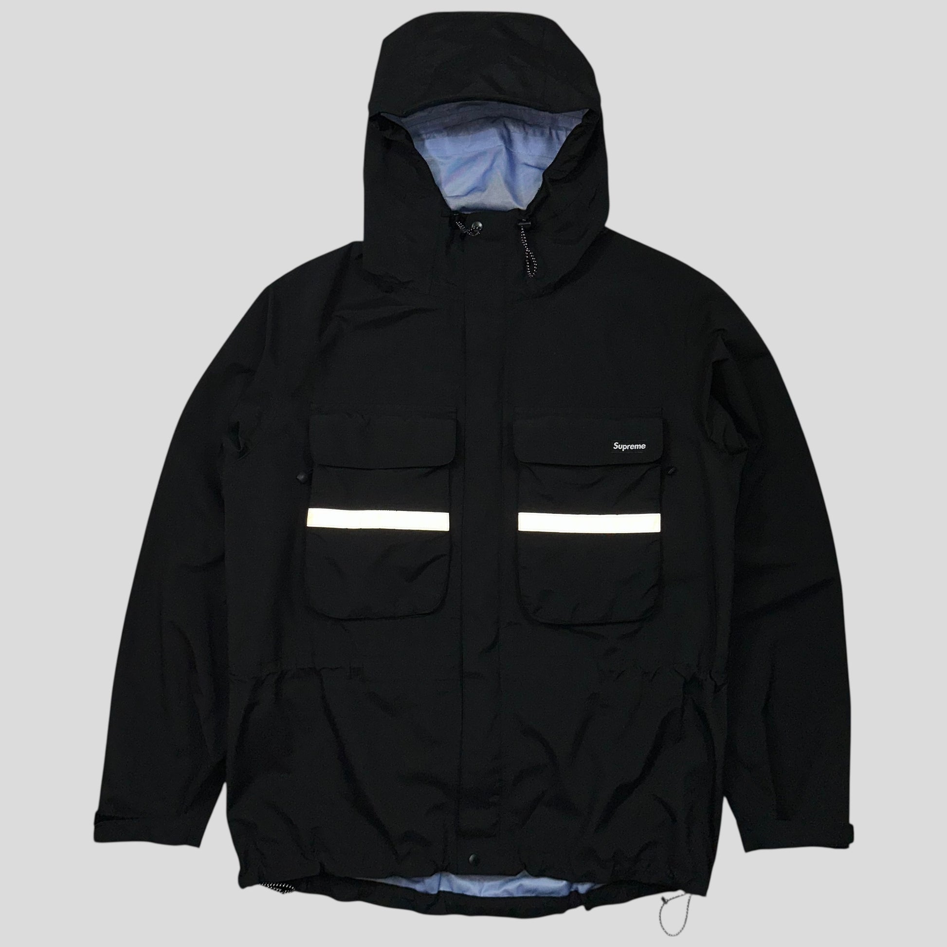 Waterproof, breathable nylon/poly 3-layer weave shell with tricot backing and taped seams. Reflective taping on front chest pockets and across back, Supreme box logo to 3D chest pockets, these are accessible from the hidden zips at the side and Velcro top, Supreme red mini logo tab to back of hood.