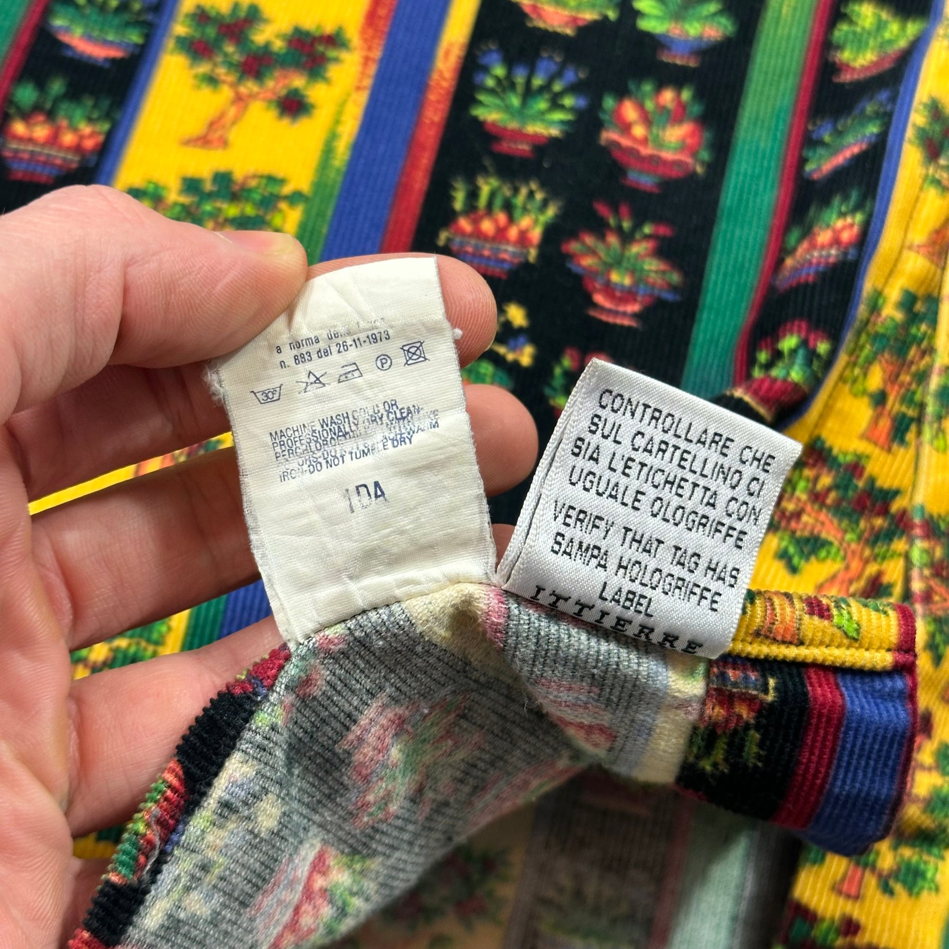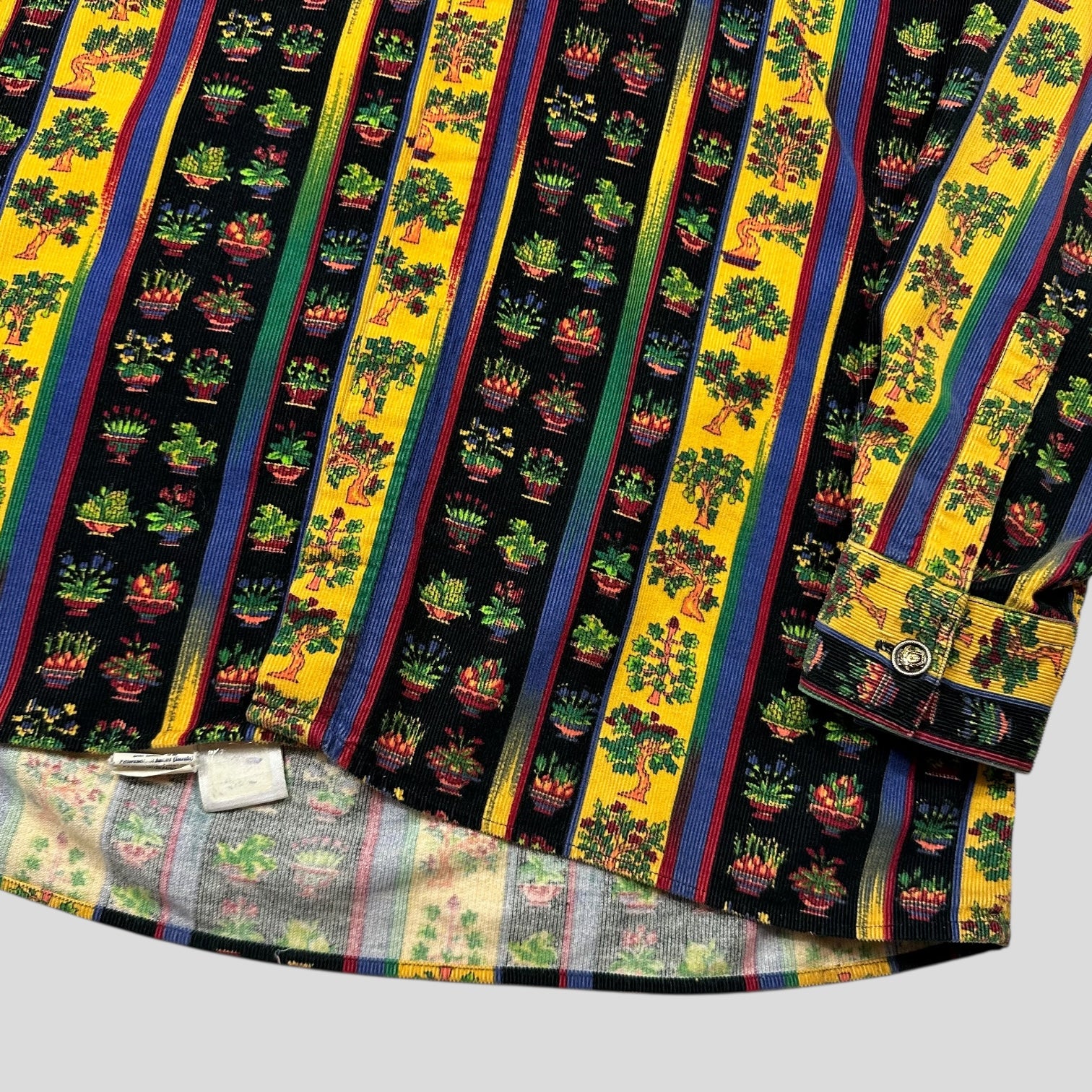 Very rare 1990’s VJC Versace thick cotton corduroy shirt, beautiful striped multicolour print with scrolling bonsai and potted plants, incredible metal Medusa buttons probably the nicest on any Versace shirt I’ve seen.